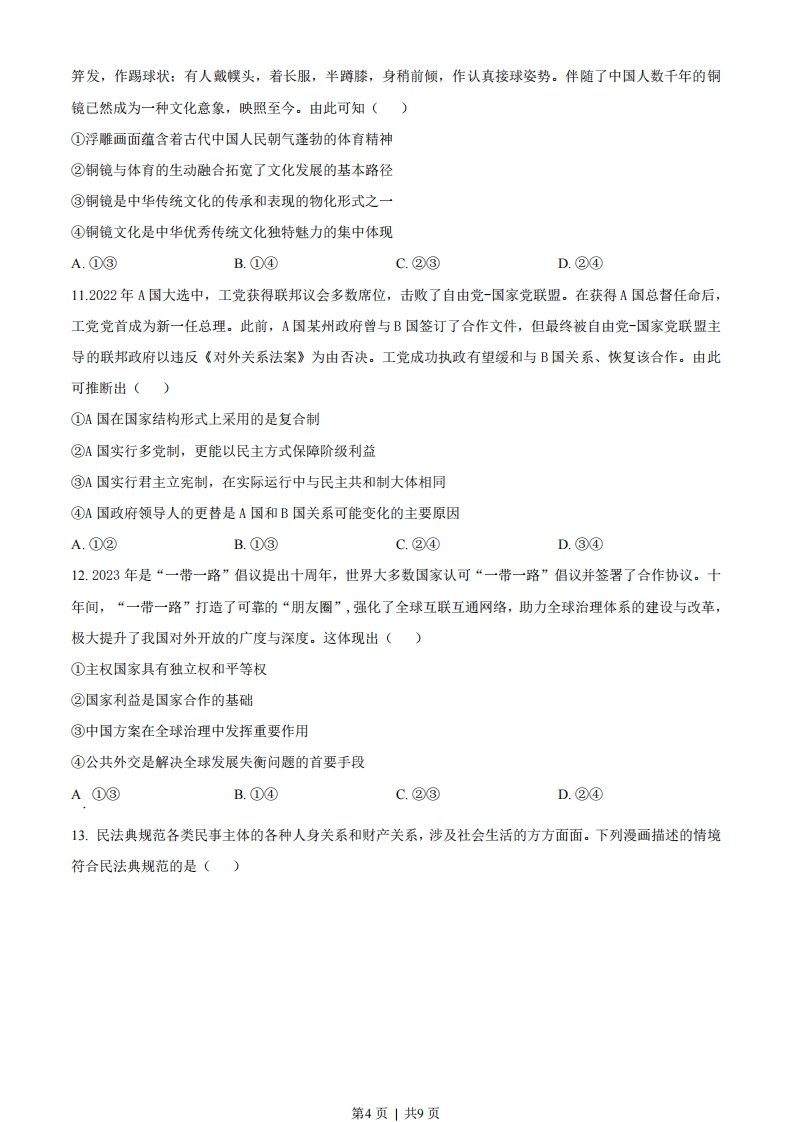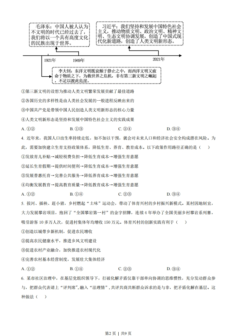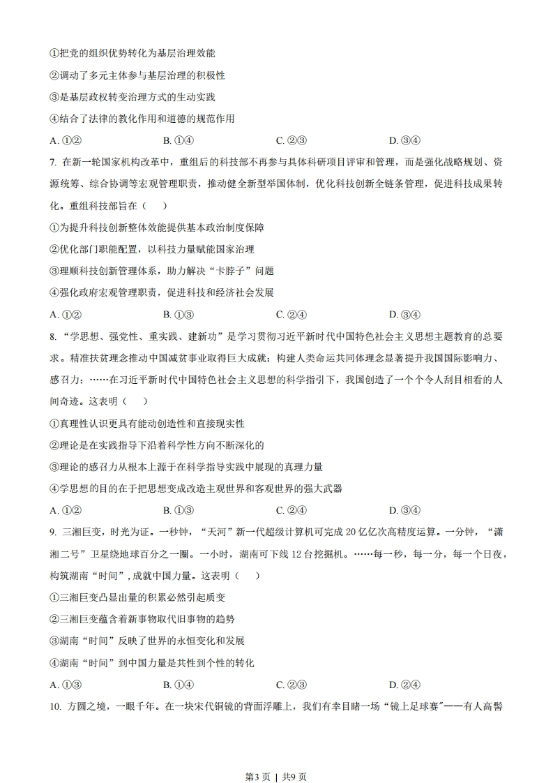 湖南省2023年普通高中学业水平选择性考试思想政治注意事项:1.答卷前,考生务必将自己的姓名、准考证号填写在本试卷和答题卡上。2.回答选择题时,选出每小题答案后,用铅笔把答题卡上对应题目的答案标号涂黑。如需改动,用橡皮擦干净后,再选涂其他答案标号。回答非选择题时,将答案写在答题卡上。写在本试卷上无效。3.考试结束后,将本试卷和答题卡一并交回。一、选择题:本题共16小题,每小题3分,共48分。在每小题给出的四个选项中,只有一项是符合题目要求的。1.中国特色社会主义开创于改革开放新时期,但了解其形成和发展的脉络,认识其历史必然性和科学真理性,应该拉长时间尺度,放在世界社会主义演进的历程中去把握。从这一历程来看()①科学社会主义在二十一世纪的中国焕发出强大生机活力②中国特色社会主义不断发展并己跨越社会主义初级阶段③中国特色社会主义正成为根兴世界社会主义的中流砥柱④冷战结束后世界社会主义运动低潮状态得到了根本改变A.①②B.①③C.②④D.③④2.马克思和恩格斯在《德意志意识形态》中写道,在共产主义社会里,“任何人都没有特殊的活动范围,而是都可以在任何部门内发展,社会调节着整个生产,因而使我有可能随自己的兴趣今天干这事,明天干那事,上午打猎,下午捕鱼,傍晚从事畜牧,晚饭后从事批判,这样就不会使我老是一个猎人、渔夫、牧人或批判者。”对此理解正确的是()①这是对未来共产主义社会形态的全面描绘②人的自由发展是共产主义社会的基本前提③追求人的自由发展是共产主义的价值旨归④共产主义社会人们将摆脱传统分工的束缚A.①②B.①③C.②④D.③④3.从期盼”第三新文明”到创造“人类文明新形态”深刻昭示()第1页」共9页