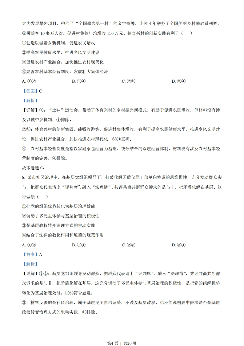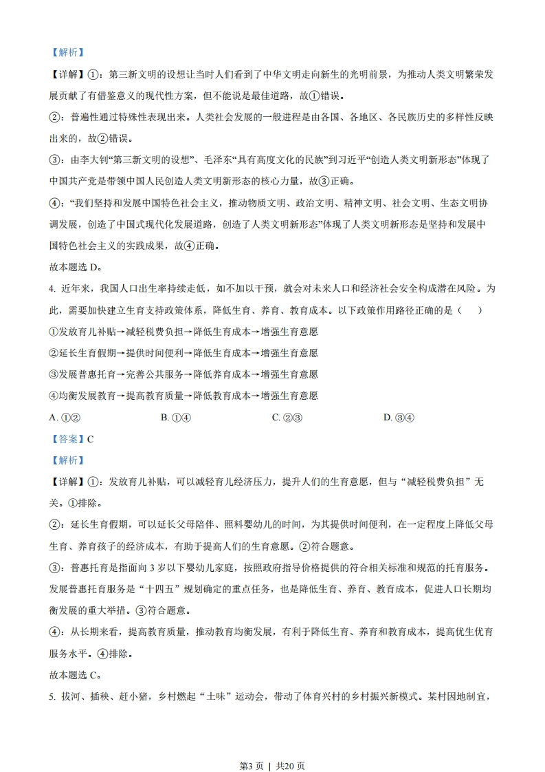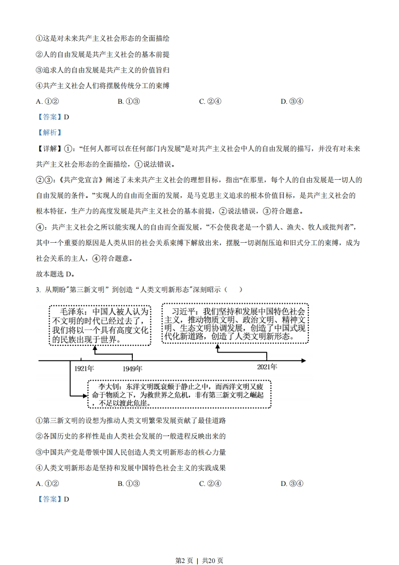 湖南省2023年普通高中学业水平选择性考试思想政治注意事项:1.答卷前,考生务必将自己的姓名、准考证号填写在本试卷和答题卡上。2.回答选择题时,选出每小题答案后,用铅笔把答题卡上对应题目的答案标号涂黑。如需改动,用橡皮擦干净后,再选涂其他答案标号。回答非选择题时,将答案写在答题卡上。写在本试卷上无效。3.考试结束后,将本试卷和答题卡一并交回。一、选择题:本题共16小题,每小题3分,共48分。在每小题给出的四个选项中,只有一项是符合题目要求的。1.中国特色社会主义开创于改革开放新时期,但了解其形成和发展的脉络,认识其历史必然性和科学真理性,应该拉长时间尺度,放在世界社会主义演进的历程中去把握。从这一历程来看()①科学社会主义在二十一世纪的中国焕发出强大生机活力②中国特色社会主义不断发展并己跨越社会主义初级阶段③中国特色社会主义正成为根兴世界社会主义的中流砥柱④冷战结束后世界社会主义运动低潮状态得到了根本改变A.①②B.①③C.②④D.③④【答案】B【解析】【详解】①③:认识中国特色社会主义的历史必然性和科学真理性,要放在世界社会主义演进的历程中去把握,说明科学社会主义在二十一世纪的中国焕发出强大生机活力,取得的历史成果证明了中国特色社会主义正成为振兴世界社会主义的中流砥柱,①③正确。②:中国特色社会主义处于社会主义初级阶段,“己跨越”不符合事实,②说法错误。④:冷战结束后,世界仅剩5个社会主义国家,仅从社会主义国家的数量上来看,世界社会主义运动仍然处于低潮,“得到了根本改变”说法错误,④不选。故答案选B。2.马克思和恩格斯在《德意志意识形态》中写道,在共产主义社会里,“任何人都没有特殊的活动范围,而是都可以在任何部门内发展,社会调节着整个生产,因而使我有可能随自己的兴趣今天干这事,明天干那事,上午打猎,下午捕鱼,傍晚从事畜牧,晚饭后从事批判,这样就不会使我老是一个猎人、渔夫、牧人或批判者。”对此理解正确的是()第1页」共20页