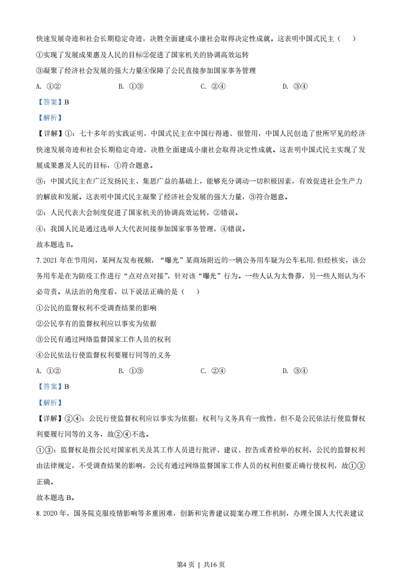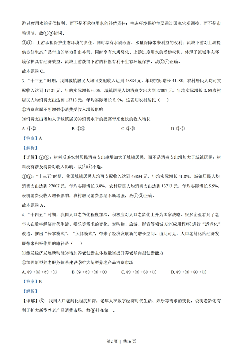 2021年湖北省普通高中学业水平选择性考试思想政治一、选择题1.抗日战争时期,中国共产党领导的敌后抗日根据地发行了根据地货币。1938年8月,党中央在给晋察冀边区的信中指出:“边区的纸币数目,不应超过边区市场上的需要数量。这里应该估计到边区之扩大和缩小之可能。”这一材料说明,边区的纸币发行要考虑()①商品的使用价值②通货膨胀的可能③边区范围的大小④货币执行支付手段的职能A.①②B.①④C.②③D.③④【答案】C【解析】【详解】②③:纸币的发行量必须以流通中所需要的货币量为限度,如果超出这个限度,就有可能造成通货膨胀,物价上涨,货币贬值,所以边区的纸币发行要考虑商通货膨胀的可能及边区范围的大小,②③符合题意。①④:商品的使用价值与货币的职能跟纸币发行无关,①④排除。故本题选C。2.国务院四部门联合发布的《支持长江全流域建立横向生态保护补偿机制的实施方案》规定,流域上游承担保护生态环境的责任,同时享有水质改善、水量保障带来利益的权利:流域下游对上游提供良好生态产品付出的努力作出补偿,同时享有水质恶化、上游过度用水的受偿权利。这表明()①流域下游不承担用水的补偿责任②流域生态环境保护具有经济效益③流域生态环境保护主要通过市场调节④流域上游获得下游的补偿有利于生态环境保护A.①②B.①③C.②④D.③④【答案】C【解析】【详解】①③:材料反映流域下游对上游提供良好生态产品付出的努力作出补偿,同时享有水质恶化、上第1页」共16页