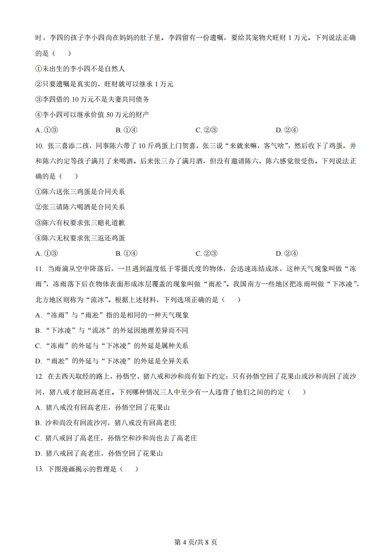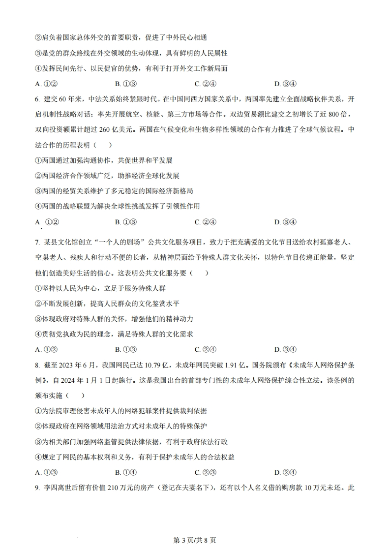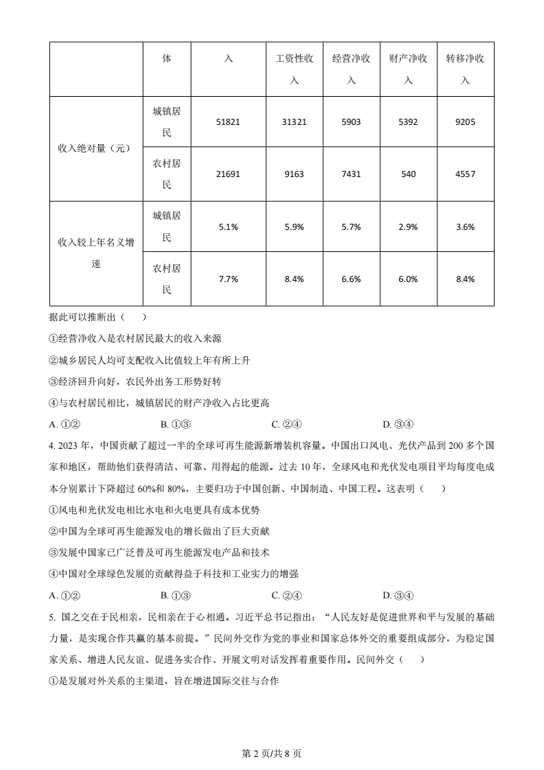 机密★启用前2024年湖北省普通高中学业水平选择性考试思想政治本试卷共6页,20题。全卷满分100分。考试用时75分钟。★祝考试顺利★注意事项:1.答题前,先将自己的姓名、准考证号、考场号、座位号填写在试卷和答题卡上,并认真核准准考证号条形码上的以上信息,将条形码粘贴在答题卡上的指定位置。2,请按题号顺序在答题卡上各题目的答题区域内作答,写在试卷、草稿纸和答题卡上的非答题区域均无效。3,选择题用2B铅笔在答题卡上把所选答案的标号涂黑;非选择题用黑色签字笔在答题卡上作答;字体工整,笔迹清楚。4.考试结束后,请将试卷和答题卡一并上交。一、选择题:本题共16小题,每小题3分,共48分。在每小题给出的四个选项中,只有一项是符合题目要求的。1.我们即将迎来祖国75周年华诞。经过不懈奋斗,中国由一穷二白到全面小康,如今已踏上以中国式现代化全面推进强国建设、民族复兴的新征程。建国以来的经济建设实践证明:生产关系一定要与生产力发展要求相适应。以下对此做出正确诠释的是()①实行家庭联产承包责任制,促进了粮食增产农民增收②鼓励非公有制经济发展,唤醒了很多人的创业梦想③农村“三权分置”改革,推动了基层社会治理的完善④科技创新赋能产业发展,让新能源汽车走俏世界A.①②B.①④C.②③D.③④2.现如今买了电器,有故障需要维修时,常会遇到保修附加条件多、小病大修、乱收费等花式套路,让消费者感到买得起修不起,既“头疼”又“心疼”。为解决这一问题,需要政府()①加强监管,增加行业透明度②反垄断,打击不正当竞争③建立国有家电维修连锁企业,做好便民服务④引导行业协会发挥自律作用,倡导诚信经营A.①③B.①④C.②③D.②④3.下表反映了2023年我国城乡居民人均可支配收入及其来源结构情况。统计指标收入主人均可支配收按收入来源分第1页共8页