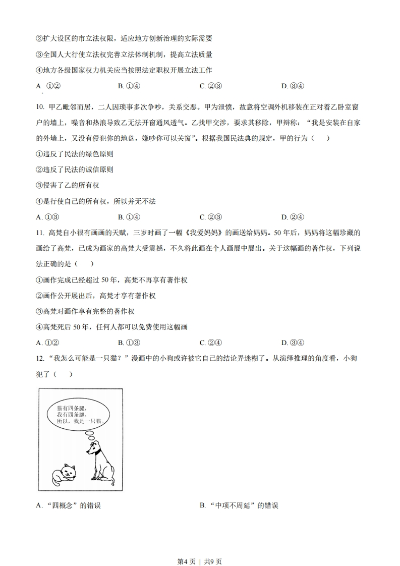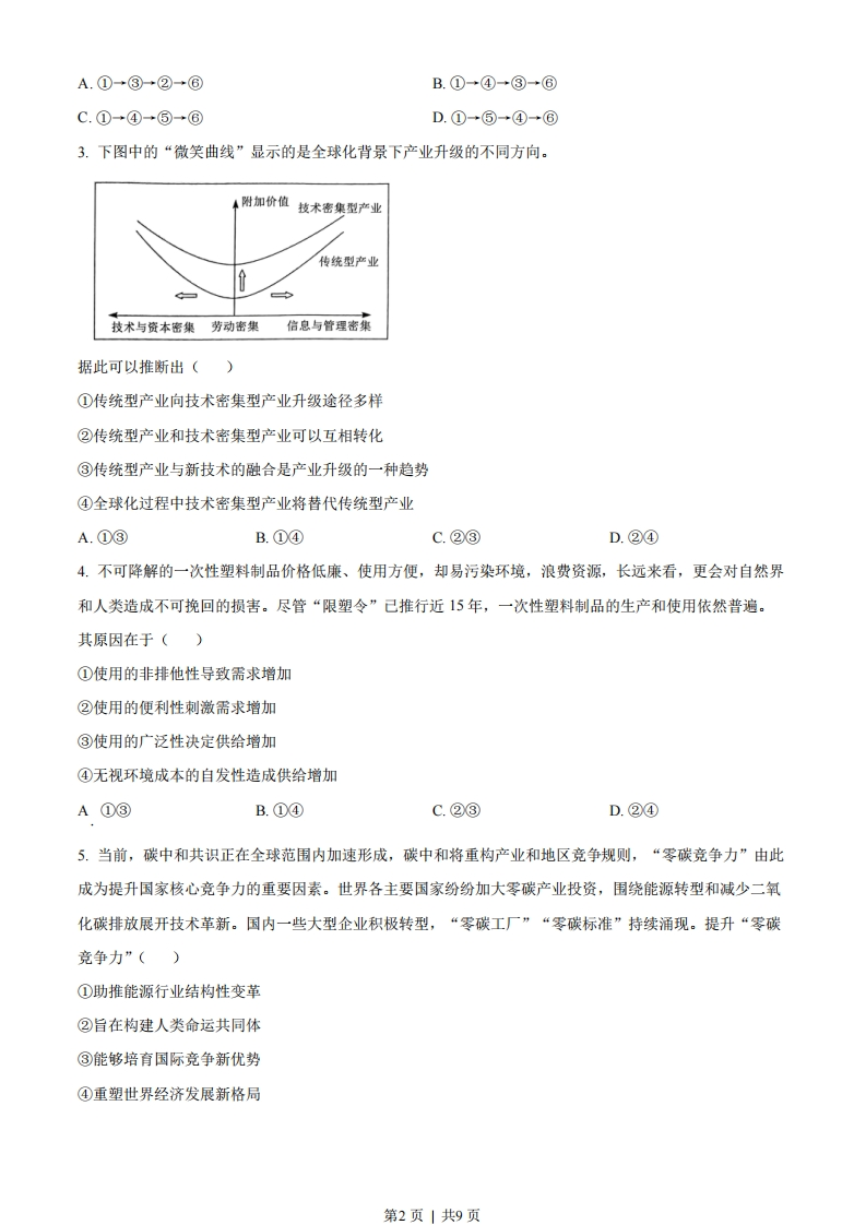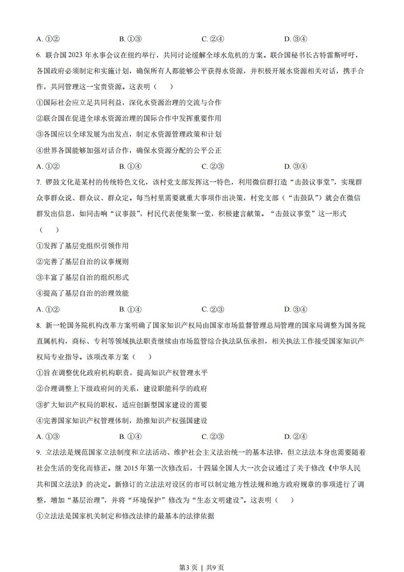 机密★启用前2023年湖北省普通高中学业水平选择性考试思想政治本试卷共8页,21题。全卷满分100分。考试用时75分钟。★祝考试顺利★注意事项1.答题前,先将自己的姓名、准考证号、考场号、座位号填写在试卷和答题卡上,并认真核准准考证号条形码上的以上信息,将条形码粘贴在答题卡上的指定位置。2。请按题号顺序在答题卡上各题目的答题区域内作答,写在试卷、草稿纸和答题卡上的非答题区域均无效。3.选释题用2B铅笔在答题卡上把所选答案的标号涂黑;非选择题用黑色签字笔在答题卡上作答;字体工整,笔迹清楚。4.考试结束后,请将试卷和答题卡一并上交。一、选择题:本题共16小题,年小题3分,共48分。在每小题给出的四个选项中,只有一项是符合题目要求的。1.改革开放40多年米,入围世界500强的中国企业数量不断增加,1997年中国(大陆)只有4家,2020年以133家位居世界第一,2022年再创新高达到145家,中国企业国际竞争力显著增强。中国企业在世界500强企业中的地位变化见证了中国发展奇迹。这表明改革开放()①是推动当代中国发展的根本动力②是中国大踏步赶上时代的重要法宝③极大改变了中国企业和中国的面貌④是中国取得一切成绩和进步的决定性因素A.①③B.①④C.②③D.②④2.聚焦产业链供应链有序运行,我国创新宏观调控,通过减税降费充分发挥了税收的调控性、导向性和激励性作用,不断突破供给侧堵点,有效维护了我国产业链供应链安全稳定和自主可控。该机制的作用路径是()①实行减税降费②高新技术企业创新积极性增强③关键技术完全自主创新④支持小微企业纾困⑤打通大中小企业之间的微循环⑥保障产业链安全稳定第1页」共9页