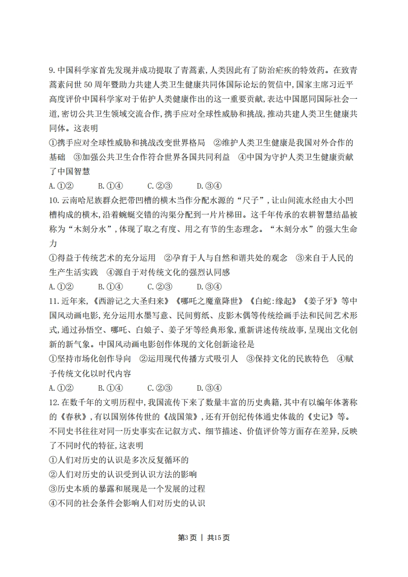 2022年湖北省普通高中学业水平选择性考试政治一、选择题(本题共16小题,每小题3分,共48分。在每小题给出的四个选项中,只有一项是符合题目要求的)1.某超市鳜鱼平时售价一般为每500克50多元,销售不温不火。2022年春节长假期间,该超市照常营业,受传统习俗影响,消费者排队购买,鳜鱼价格攀升,最高时达到每500克80多元,出现这种现象的原因是①养殖鳜鱼的劳动成本增加②超市的运营成本上升③消费者对鳜鱼的偏好增强④鳜鱼的营养价值改善A.①③B.①④C.②③D.②④2.“十四五”期间,我国将更加健全职业技能培训体系,组织实施政府补贴性培训7500万人次以上,新增取得职业资格证书或职业技能等级证书人员4000万人次以上。健全职业技能培训体系将对经济社会发展产生积极影响,其传导路径是①就业结构性矛盾缓解②就业更充分,民生改善③社会就业岗位增加④劳动者职业技能提升⑤职业技能培训体系完善⑥劳动者报酬大幅提高A.⑤→④→③→②B.⑤→④→①→②C.④→③→⑥→①D.④→⑥→③→①3.为推动产业振兴,某市通过激励政策吸引院士走进农村,在院士指导下,该市改进冬季马铃薯种植技术,打造3400余亩马铃薯产业基地,实现亩产由原来的1吨多增加到3.5吨,产值突破1000万元,走出了一条技术依赖型乡村产业振兴道路。这表明①院士下村是传统农业发展方式的变革②人才使用机制创新助推乡村产业振兴③乡村产业振兴必须走技术依赖型道路④生产要素的优化提升农业生产力水平A.①③B.①④C.②③D.②④4.近年来,全国统一大市场建设工作取得重要进展,但尚存一些问题,如市场分割和地方保护比较突出,要素和资源市场建设不完善,商品和服务市场质量体系不健全,市场监管规则、标准和程序不统一等。由此可见,加快建设全国统一大市场需要①改变现有市场经济规则②完善市场质量体系③强化政府资源配置功能④反对地方保护主义A.①②B.①③C.②④D.③④5.在全球新冠肺炎疫情蔓延、大宗商品价格上涨等背景下,中小微外贸企业在国家外贸政策的支持下发挥“船小好调头”的优势,获得了较好发展。数据显示,2021年,以“中小微”为主的民营外贸企业进出口总额达到19万亿元人民币,增长26.7%,占中国第1页|共15页