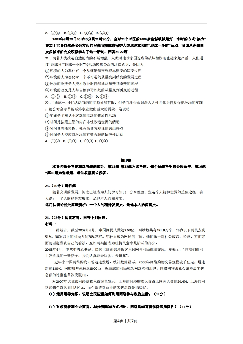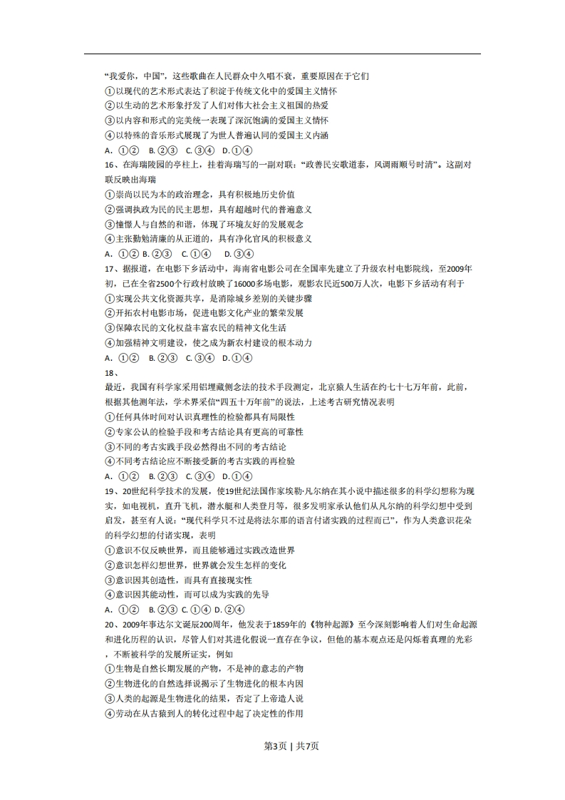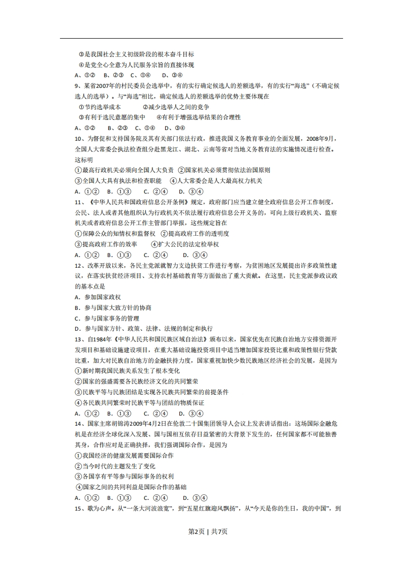 2009年普通高等学校招生全国统一考试(海南卷)政治第港本卷共22小愿,每小题2分,在每小题给出的四个选项中,只有一项是符合题目要求的,1、假设2007年1单位M国货币/1单位N国货币为1:5.5.2008年,M国的通货膨胀率10%,其他条件不变,从购买力角度来看,则两国间的汇率为A、1:4.95B、1:5C、1:5.6D、1:6.052、2008年在美国爆发的金融危机已严重响到全球经济。回答23惠。面对世界经济危机,我国出台积极地宏观经济政策,保增长、扩内需、调结构。下列宏观调控措施中能起到扩大内需作用的有①降低银行贷款利率②降低征服行政管理支出®加大政府投资力度④提高出口商品关税税率A、①③B、②③C、①④D、③④3、在世界金融危机期间,一批依托科研机构进行技术研发的企业呈现逆势上扬的态势,新产品不断问世,企业的销售收入与里人呢也随之上升。这是因为①产品创新增强了企业竞争优势②产研联合实现了双方优势互补®新产品的新功能增大了其价值④科技产品的需求弹性小利润大A、①②B、②③C、③④D、①④4、十一届全国人大二次会议审议通过的2009年《政府工作报告》提出,要进一步提高居民的社会保障待遇,2009年、2010年我国企业退休人员基本养老金人均每年增长约10%。如果其他条件不变,这一措施将A、缩小个人和家庭收入差距B、提高企业吸引力和经济效益C、刺激消费、促进社会稳定D、实现养老金保值、增值5、1980年至1990年,我国GDP保持每年9.5%的增长,就业人口年增长率为4.3%,就业弹性(就业人口年增长率/GDP年增长率)为0.543.1991年至2000年,就业弹性下降至0.11.2001年至2008年,就业弹性下降到不足0.1。下列措施中恩那个有效提高我国就业弹性的有①大力发展服务业①保持经济快速增长®支持中小企业发展④提高劳动者工资水平A、①@B、①@C、②④D、③④某奶牛养殖大县的一百多农户自发城里“奶联社”,将奶牛集中起来,由奶联社组织养牛能手对奶牛统一刺痒、管理;每头牛作价5000元入殷,固定分红,5年返利6000元。入社后奶牛的饲养成本下降,奶牛的产量上升,奶价因奶质量提高而上升。回答67愿。6、奶联社经营模式的成功之处在于①积极发展规模化经营②增加紫金和物质投入③降低农户的经营风险④对奶价实施有效控制A、①②B、①③C、①③D、①④7、从所有制性质上看,奶联社属于A、个体经济、混合所有制B、集体经济、股份合作制C、降低农户的经营风险D、对奶价实施有效控制8、2008年10月,中共十七届三中全会通过《中共中央关于推荐农村改革发展若干重大问题的决定》。胡锦涛总书记指出,农业、农村和农民问题,始终是一个关系党和国家工作全局的根本性问趣,必须始终作为全党工作的重中之重。解决“三农问题”①是缩小城乡差距构建和谐社会的必要条件①是实现我国区域协调发展的前提第1页|共7页