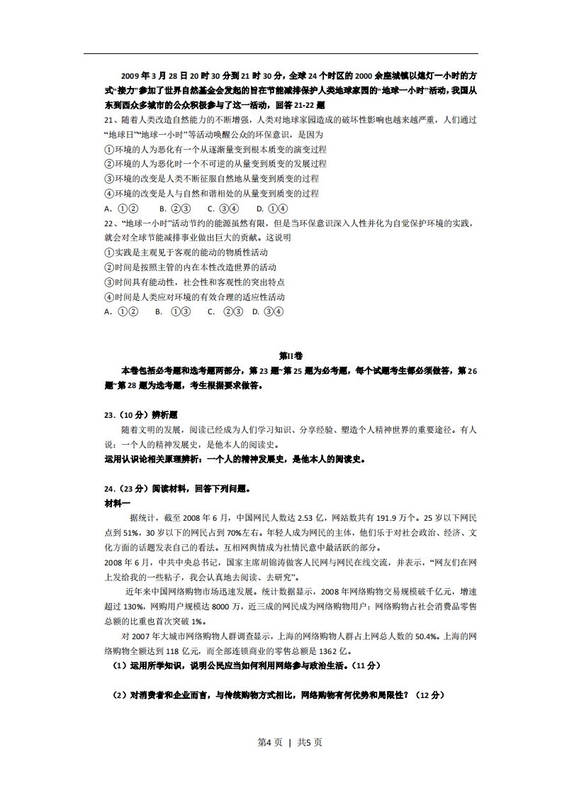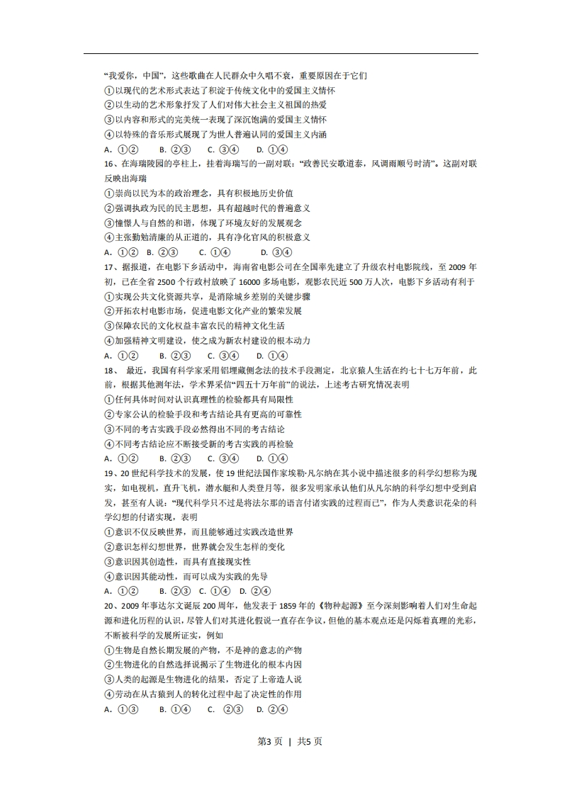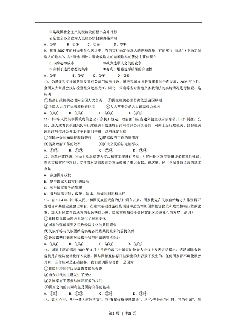 2009年普通高等学校招生全国统一考试(海南卷)政治第1卷本卷共22小题,每小愿2分,在每小题给出的四个选项中,只有一项是符合题目要求的,1、假设2007年1单位M国货币/1单位N国货币为1:5.5.2008年,M国的通货膨胀率10%,其他条件不变,从购买力角度来看,则两国间的汇率为A、1:4.95B、1:5C、1:5.6D、1:6.052、2008年在楚国操发的金融危机已严重响到全球经济。回答23题.面对世界经济危机,我国出台积极地宏观经济政策,保增长、扩内需、调结构。下列宏观调控措施中能起到扩大内需作用的有①降低银行贷款利率②降低征服行政管理支出③加大政府投资力度④提高出口商品关税税率A、①@B、②@C、①④D、③④3、在世界金融危机期间,一批依托科研机构进行技术研发的企业呈现逆势上扬的态势,新产品不断问世,企业的销售收入与里人呢也随之上升。这是因为①产品创新增强了企业竞争优势⑦产研联合实现了双方优势互补③新产品的新功能增大了其价值④科技产品的需求弹性小利润大A、①②B、①③C、③④D、①④4、十一届全国人大二次会议审议通过的2009年《政府工作报告》提出,要进一步提高居民的社会保障待遇,2009年、2010年我国企业退休人员基本养老金人均每年增长约10%。如果其他条件不变,这一措施将A、缩小个人和家庭收入差距B、提高企业吸引力和经济效益C、刺激消费、促进社会稳定D、实现养老金保值、增值5、1980年至1990年,我国GDP保持每年9.5%的增长,就业人口年增长率为4.3%,就业弹性(就业人口年增长率/GDP年增长率)为0.543.1991年至2000年,就业弹性下降至0.11.2001年至2008年,就业弹性下降到不足0.1。下列措施中恩那个有效提高我国就业弹性的有①大力发展服务业①保持经济快速增长®支持中小企业发展④提高劳动者工资水平A、①③B、①③C、①④D、③④某奶牛养殖大县的一百多农户自发城里“奶联社”,将奶牛集中起来,由奶联社组织养牛能手对奶牛统一刺痒、管理:每头牛作价5000元入股,固定分红,5年返利6000元。入社后奶牛的何养成本下降,奶牛的产量上升,奶价因奶质量提高而上升。回答67愿。6、奶联社经营模式的成功之处在于①积极发展规模化经营①增加紫金和物质投入®降低农户的经营风险④对奶价实施有效控制A、①②B、①③C、①③D、②④7、从所有制性质上看,奶联社属于A、个体经济、混合所有制B、集体经济、股份合作制C、降低农户的经营风险D、对奶价实施有效控制8、2008年10月,中共十七届三中全会通过《中共中央关于推荐农村改革发展若干重大问题的决定》胡锦涛总书记指出,农业、农村和农民问趣,始终是一个关系党和国家工作全局的根本性问趣,必须始终作为全党工作的重中之重。解决“三农问题”①是缩小城乡差距构建和谐社会的必要条件②是实现我国区域协调发展的前提第1页1共5页
