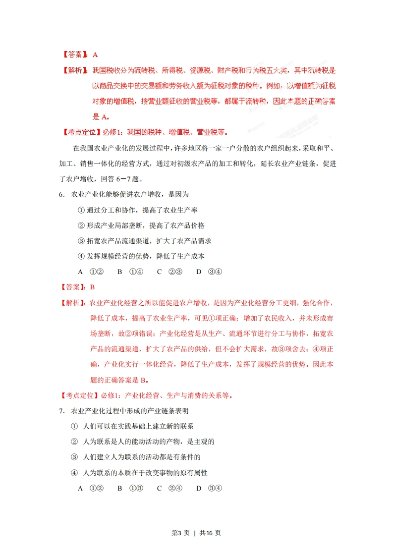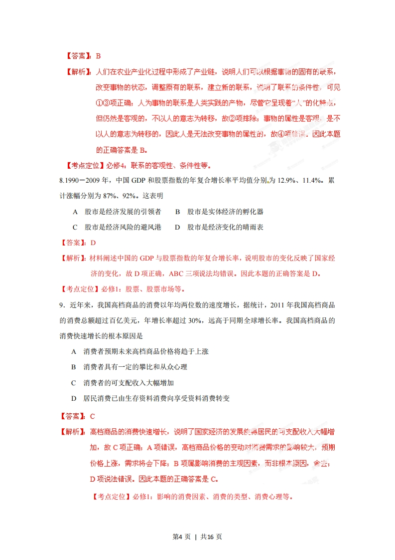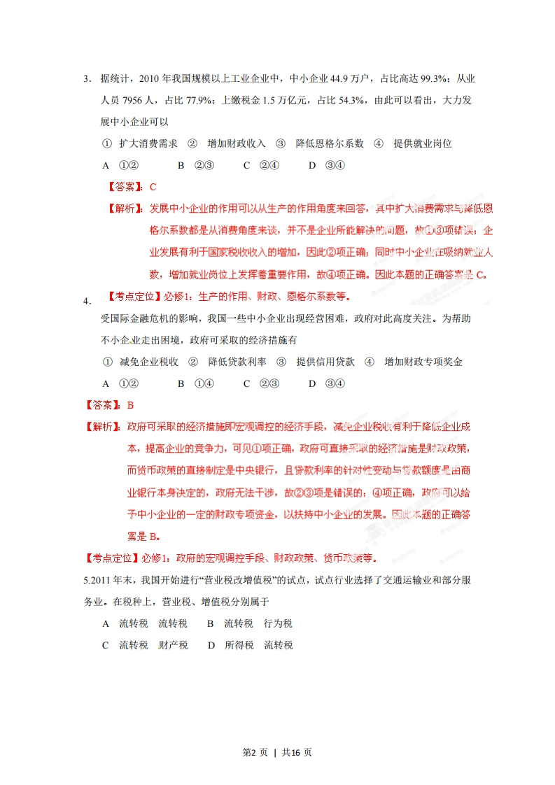 2012年高考海南政治试卷解析(教师版)【试卷总评】整套试卷难度中等,问题设问非常明确。关注教材的主干知识与基础知识的考查,能力立意明显,既考查知识点记忆能力,也考查材料分析能力,即从材料中获取有效信息的能力。主观题的材料背景关注国家及国际时事热点,部分设问难度较大,如25题的第2问。考点分布平均,关注选修教材,考查了选修2、3、6的有关知识,覆盖面较大,极具海南地方特色,符合新课程要求。第I卷本卷共22小题,每小题2分,在每小题给出的四个选项中,只有一项是符合题目要求的。M国2011年货币供应量为15万亿元,同期商品价格总额为30万亿元,回答第1一2题。1.假设该国货币供需均衡且货币价值稳定,那么,可推算出M国当年货币流通速度为A0.5次/年B1次/年C2次年D3次/年【答案】C【解析】流通中所需的货币量=待售商品价格总额货币流通速度。因此30万亿/15万亿=2次。因此本题的正确答案是C2.【考点定位】必修1:流通中所需货币量的计算公式等。若M国货币流通速度加快20%,国内生产扩大10%,在其他条件不变的情况下,该国物价水平的变化大致是A下降10%B上升10%C上升30%D上升50%【答案】:B【解析】:货币流通速度加快20%,即2×(1+20%)=2.4,国内生产扩大10%,即商品价格总额为30万亿×(1+10%)=33万亿,那么实际所需的货币量为33万亿/2.4=13.75万亿,而其他条件不变,即货币供应量仍为15万亿,则物价上涨幅度为(15-13.75)/13.75-0.1,即物价上涨大致为10%。因此本题的正确答案是B。【考点定位】必修1:流通中所需货币量的计算公式、社会劳动生产率与商品价值量的关系等。中小企业作为我国社会主义市场经济主体之一,在国民经济中发挥了巨大作用,回答3-4题.第1页|共16页