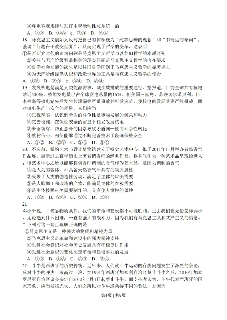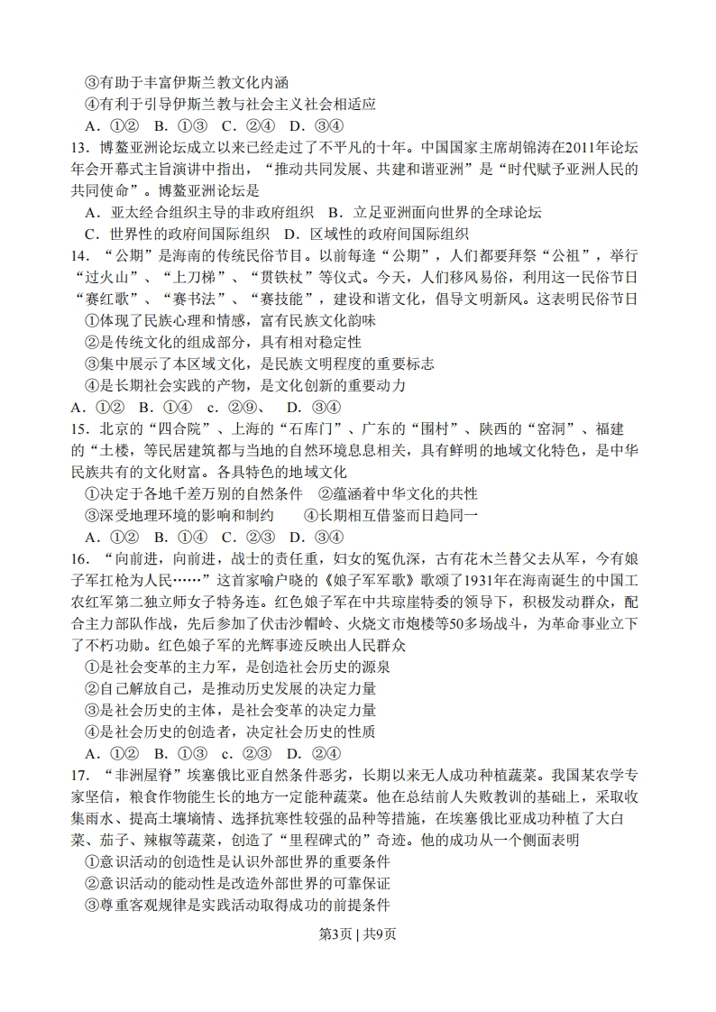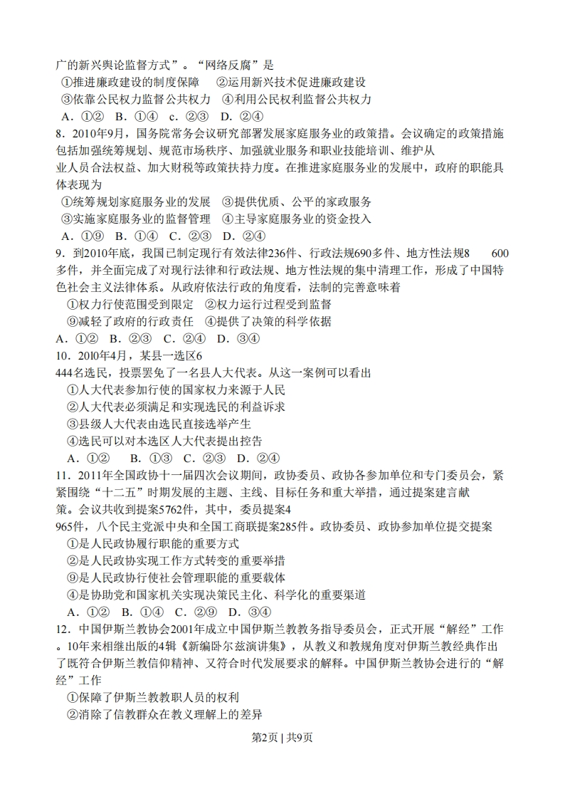 2011年海南高考卷1、据世界银行统计,中国出口在全球市场的份额从2007年的7.4%提高到2010年的9.6%,呈持续扩大趋势。中国出口份额的扩大主要得益于A.制造业竞争力日益提高B.对外投资大幅增加C.人民币持续小幅升值D.外汇储备快速增长2.2011年第一季度我国一年期定期存款利率为3%,而消费价格指数为5%,同期居民储蓄仍然大幅增长。对居民储蓄大幅增长的合理解释是①人们要应对未来住房、养老等支出②居民的消费趋于饱和③储蓄对利率的变化有弹性④股票、债券等有价证券投资风险大A.①②B.①④C.②③D.②④3.H股份有限公司股东王某滥用公司法人独立地位和股东有限责任,转移公司财产以逃避公司债务,损害了公司债权人利益。在这种情况下,王某对公司债务应A,以法人财产承担有限责任B.以法人财产承担连带责任C.以个人财产承担有限责任D.以个人财产承担连带责任4.某市实施新的水务管理办法,对居民生活用水逐步推行阶梯水价,对工业和服务业超计划用水实行累进加价,对高耗水行业实行差别水价。这种水务管理办法有利于①产业结构的调整②水资源的优化配置③企业生产效率的提高.④居民生活水平的提高A.①②B.①④c.②③D.②④5.2011年1~4月我国对外贸易顺差为104亿美元,形成大量外汇占款(指中央银行因收购外汇而投放的等值本币),加大了通货膨胀的压力。为减轻通货膨胀的压力,中国人民银行可采取的措施是A.降低基准利率B.加快货币流通速度C.扩大国债发行规模D.发行金融债券6.2011年4月20日,海南离岛免税购物政策在三亚的免税店试点实施,免税商品受到热捧,销售收入大增。免税商品销售收入的提高,是因为A,免税商品一般是处于买方市场的商品B.免税商品一般是需求弹性较高的商品c.免税商品之间可以相互替代D.免税商品一般是生活必需品7.《中共中央关于加强和改进新形势下党的建设若干重大问题的决定》指出,要加强网络舆情分析,健全反腐倡廉网络举报和受理机制、网络信息收集和处置机制。2010年《中国的反腐败和廉政建设》白皮书指出,“网络监督日益成为一种反应快、影响大、参与面第1页|共9页