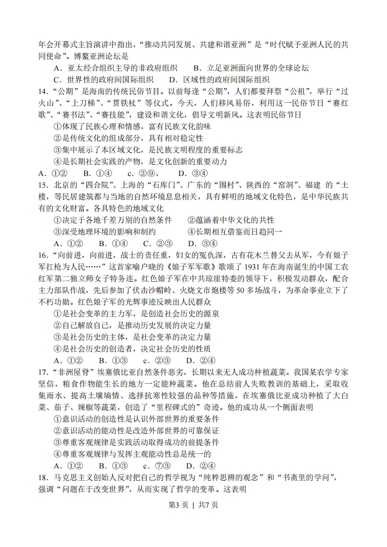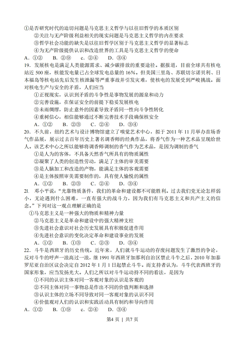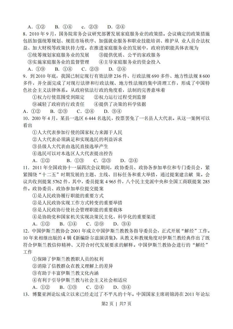 2011年海南高考卷1、据世界银行统计,中国出口在全球市场的份额从2007年的7.4%提高到2010年的9.6%,呈持续扩大趋势。中国出口份额的扩大主要得益于A.制造业竞争力日益提高B.对外投资大幅增加C.人民币持续小幅升值D.外汇储备快速增长2.2011年第一季度我国一年期定期存款利率为3%,而消费价格指数为5%,同期居民储蓄仍然大幅增长。对居民储蓄大幅增长的合理解释是①人们要应对未来住房、养老等支出②居民的消费趋于饱和③储蓄对利率的变化有弹性④股票、债券等有价证券投资风险大A.①②B.①④C.②③D.②④3.H股份有限公司股东王某滥用公司法人独立地位和股东有限责任,转移公司财产以逃避公司债务,损害了公司债权人利益。在这种情况下,王某对公司债务应A.以法人财产承担有限责任B.以法人财产承担连带责任C.以个人财产承担有限责任D.以个人财产承担连带责任4.某市实施新的水务管理办法,对居民生活用水逐步推行阶梯水价,对工业和服务业超计划用水实行累进加价,对高耗水行业实行差别水价。这种水务管理办法有利于①产业结构的调整②水资源的优化配置③企业生产效率的提高.④居民生活水平的提高A.①②B.①④c.②③D.②④5.2011年1~4月我国对外贸易顺差为104亿美元,形成大量外汇占款(指中央银行因收购外汇而投放的等值本币),加大了通货膨胀的压力。为减轻通货膨胀的压力,中国人民银行可采取的措施是A.降低基准利率B.加快货币流通速度C.扩大国债发行规模D.发行金融债券6.2011年4月20日,海南离岛免税购物政策在三亚的免税店试点实施,免税商品受到热捧,销售收入大增。免税商品销售收入的提高,是因为A.免税商品一般是处于买方市场的商品B.免税商品一般是需求弹性较高的商品c.免税商品之间可以相互替代D.免税商品一般是生活必需品7.《中共中央关于加强和改进新形势下党的建设若干重大问题的决定》指出,要加强网络舆情分析,健全反腐倡廉网络举报和受理机制、网络信息收集和处置机制。2010年《中国的反腐败和廉政建设》白皮书指出,“网络监督日益成为一种反应快、影响大、参与面广的新兴舆论监督方式”。“网络反腐”是①推进廉政建设的制度保障②运用新兴技术促进廉政建设③依靠公民权力监督公共权力④利用公民权利监督公共权力第1页|共7页