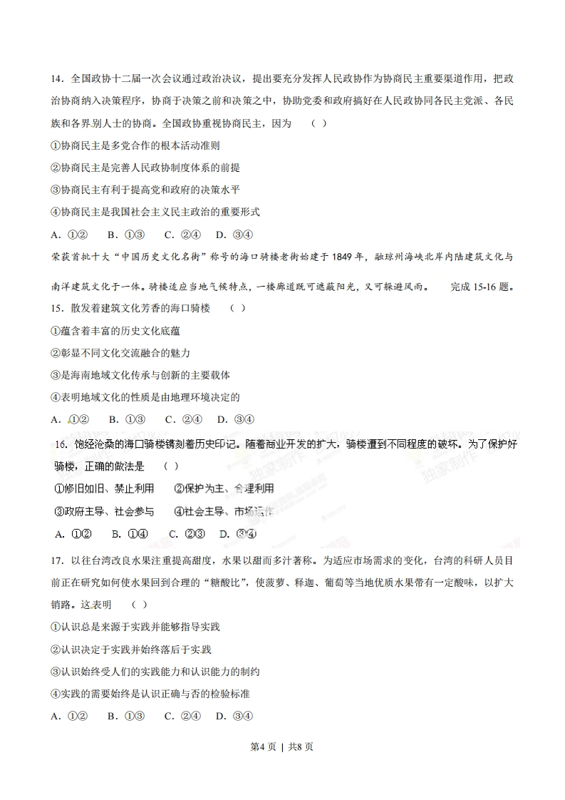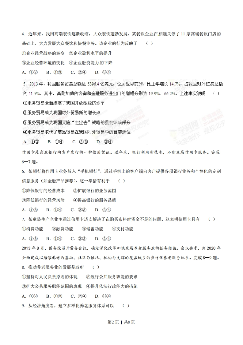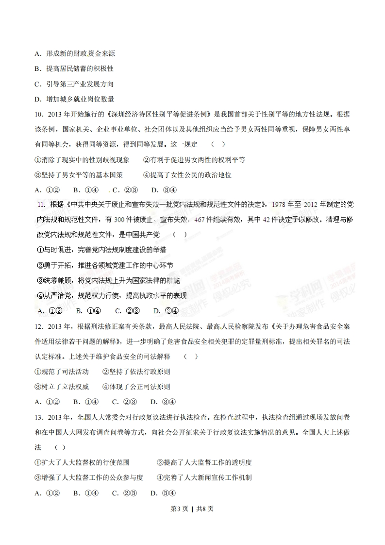 2014年普通高等学校招生全国统一考试政治(海南卷)第I卷本卷共22小题,每小题2分,在每小题给出的四个选项中,只有一项是符合题目要求的。1.党的十八届三中全会通过的《中共中央关于全面深化改革若干重大问题的决定》提出赋予农民更多的财产权利。下列举措中能够通过扩大财产权利而使农民增收的是()A.推进农民住房财产的抵押、担保和转让B.稳定农村土地承包关系,发展多种形式规模经营C.改革农业补贴制度,完善粮食生产区的利益补偿机制D.对农村集体土地所有权进行确权登记2.中国人民银行决定,自2013年7月20日起,全面放开金融机构代款利率管制,由金融机构根据商业原则自主确定代款利率水平。放开代款利率管制将导致()A.金融机构的利润水平逐步提高B.资金大规模流向实体经济C.利率差异化金融产品不断出现D.社会融资成本大幅度降低3.经济学常用“倒U形”曲线(如图1所示)来描述经济增长与环境污染程度的关系。据此作出的下列判断正确的是()独家利单位GDP的污染量B人均GDP学刑网图1独家制作侵权必究独家制作侵权必①A→B表示工业化后期阶段②B→C表示工业化后期阶段③美丽中国应该在B点出现④美丽中国应该在C点出现A.①④B.②③C.①③D.②④第1页|共8页