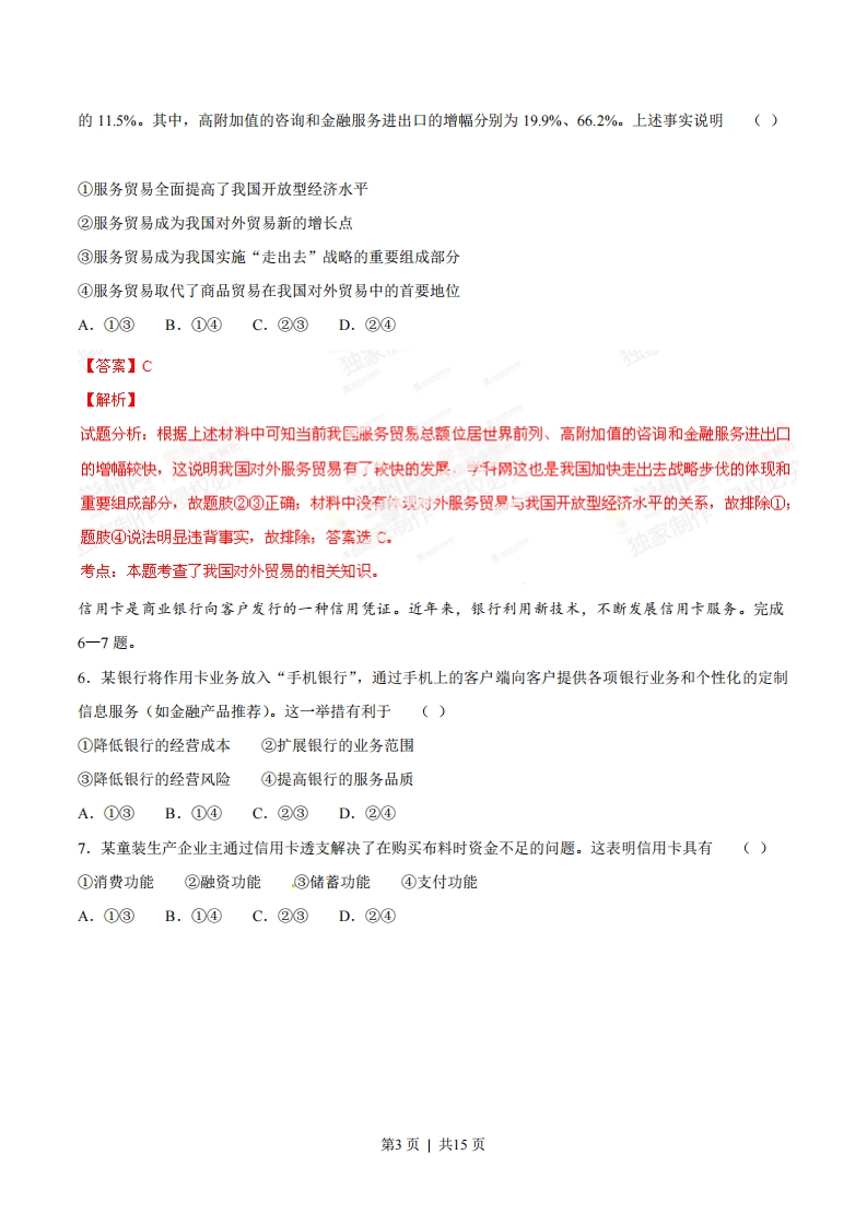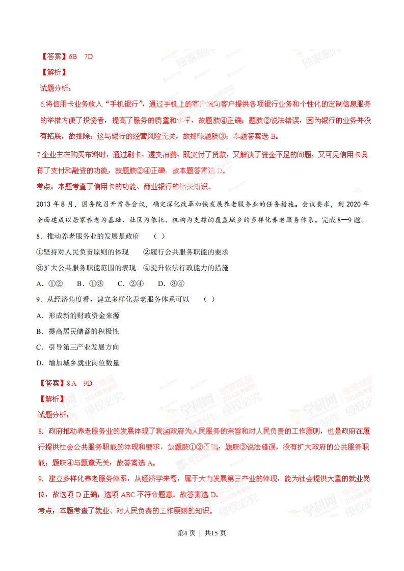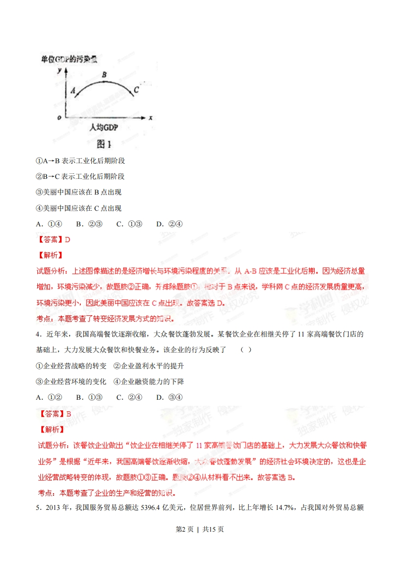 2014年普通高等学校招生全国统一考试政治(海南卷)第I卷本卷共22小题,每小题2分,在每小题给出的四个选项中,只有一项是符合题目要求的。1.党的十八届三中全会通过的《中共中央关于全面深化改革若干重大问题的决定》提出赋予农民更多的财产权利。下列举措中能够通过扩大财产权利而使农民增收的是()A.推进农民住房财产的抵押、担保和转让B.稳定农村土地承包关系,发展多种形式规模经营C.改革农业补贴制度,完善粮食生产区的利益补偿机制D.对农村集体土地所有权进行确权登记【答案】A侵权必20【解析】试题分析:通过扩大财产权利而使农民增收是按生产要素分配而取得的收入。推进农民住房财产的抵押、担保和转让符合题意,应入选。选项B属于按劳分配,取得收益,故排除,选项C不是通过扩大财产权利增加收益,故排除;选项D与题意无关。故答案选A考点:本题考查了我国的分配制度的知识。2.中国人民银行决定,自2013年7月20日起,全面放开金融机构代款利率管制,由金融机构根据商业原则自主确定代款利率水平。放开代款利率管制将导致()A.金融机构的利润水平逐步提高B.资金大规模流向实体经济C.利率差异化金融产品不断出现D.社会融资成本大幅度降低【答案】C【解析】试题分析:全面放开代款利率管制与金融机构的利润水平逐步提高没有必然联系,故排除A:放开代款利率管制不会导致资金大规模流向实体经济,故排除B:选项D与题意无关,故排除,全面放开金融利率管制,将增加商业银行之间的竞争,会促使利辱差异化金融产品不断出现:故答案选C。考点:本题考查了市场调节与宏观调控的知识。3.经济学常用“倒U形”曲线(如图1所示)来描述经济增长与环境污染程度的关系。据此作出的下列判断正确的是()第1页|共15页