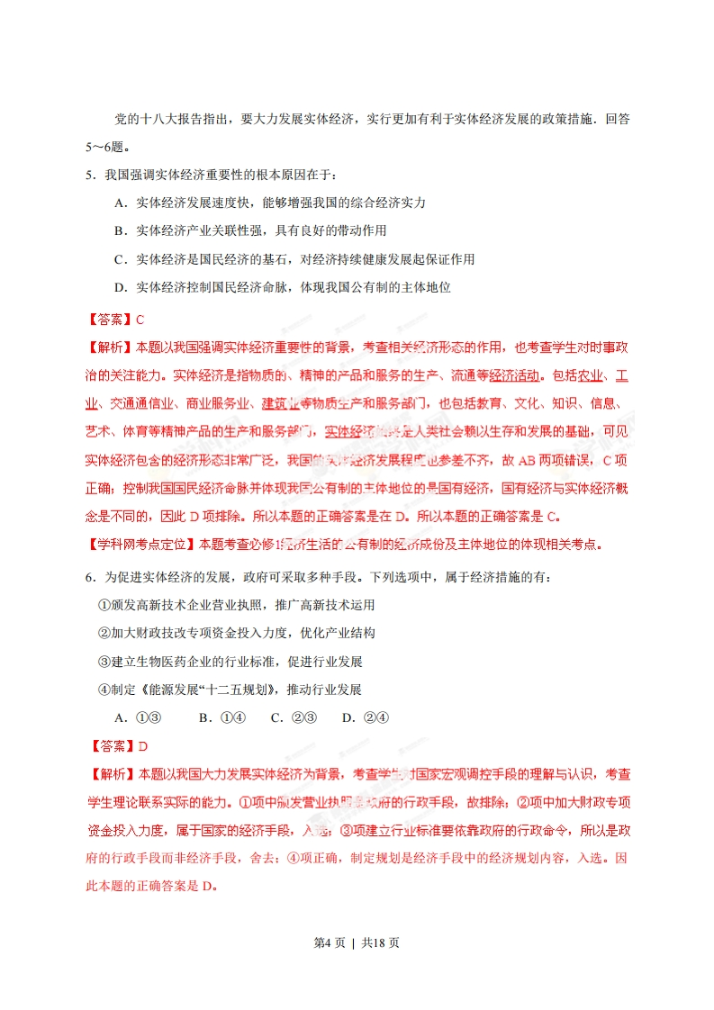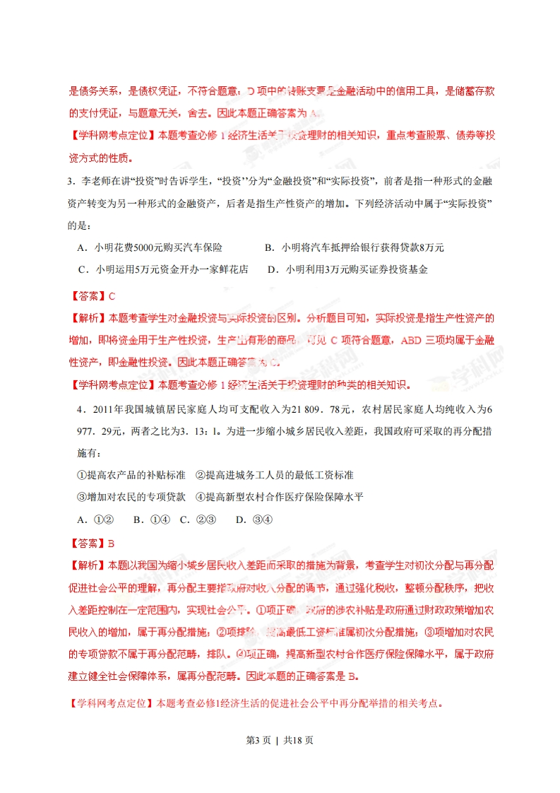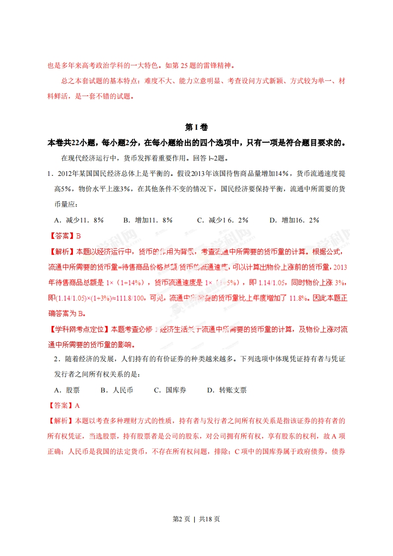 2013年海南高考政治试题解析(精编版)【总评】本套试题为2013年全国高考南省功d试题,*试题属于海南省单独命题,整套试题与2012年相比呈现出较强的继承性,从考查范围素,覆盖石校大,即考查了必修14四本书,又考查了选修2、3、6三本书,命题方式既有必做题,也有选做题,从题型看,较为全面,既有选择题,也有辨析题与材料分析题,从分值看,必修1共26分,必修2共22分,必修3共18分,必修4共26分,选修共8分(三题任选其一,试题总体大,区分度一般,能力立意突出,体现了新课程的理念。从命题上看具有如下特点:1.地方特色已不明显。和以往试严和其他省修试题相比,本套试题中以海南省为材料背景的只有2道选择题(18题的海南崛起论坛,21题的海南发展特色),这也充分体现了海南省命题的广阔视野,不拘泥于本省省情,而是从全国范围,甚至是世求范围寻找试题的切入点。2.贴近学生实际,贴近社会实际。虽然与省情相去甚远,但本套试题却更加与学生的实际紧密结合,贴近社会,试题的背景材料均采取学生较为熟悉并颇为关切的时政热点与焦点问题,既有国家的大攻方针(如第1、4、5、6、7、8、11、12、13、14题,涉及货币政策、促进社会公平、外贸企业转行、贸易发展方式的转变、行政体制做革、人大代表的构成、生态文明建设、国际地位的提高等),也有也学生密切相关的(第9、17、19、25题,涉及公民的有序政治参与、中国梦、孩子参加校外补习班、雷锋精神等),足有社会「泛关注可题(如第10题的反腐败问题、第15、16题的文化现象、第24、28题的环境问题等).3.从背景材料的呈现方式来看,今年的高考试颗快单一,即没有图表,也没有漫画,都是纯文字材料,这对学生能力的考查有一定的层限4,社会热点问题基本涉及。如“中步”、“党的十八大”、“生态文明建设”等等,但基本体现了“大热点,小角度的特点。热点人人都知道,但考查的切入点巧妙,有效地避免了猜题与压题。5.从考查的知识点来看,今年的试题,特别是主观题面点考查了材料中的主干知识和基础考点,有的式题基本上是数材知识的简单再现,如第25题依托雷锋精神考查文化的作用,第6题的价值观与人生价值的实现等题,只要对教材掌握较为熟悉的考生基本上都能回答正确。6.非选择题的知识考查覆盖较广,突出对主干知识的考查(如宏观调控、企业经营、党、人大、对外关系、公民的有序参与、矛盾的特殊性、价值观等),以能力立意为主,材料阅读量较大(第24题两个地区政府的不同政策),考查学生的获取相关信息,调动和运用相关知识,进行综合探究与创新能力。同时,注重文化内涵,试题选材注重文化内涵,充分挖掘材料自身的教育价值,这第1页|共18页