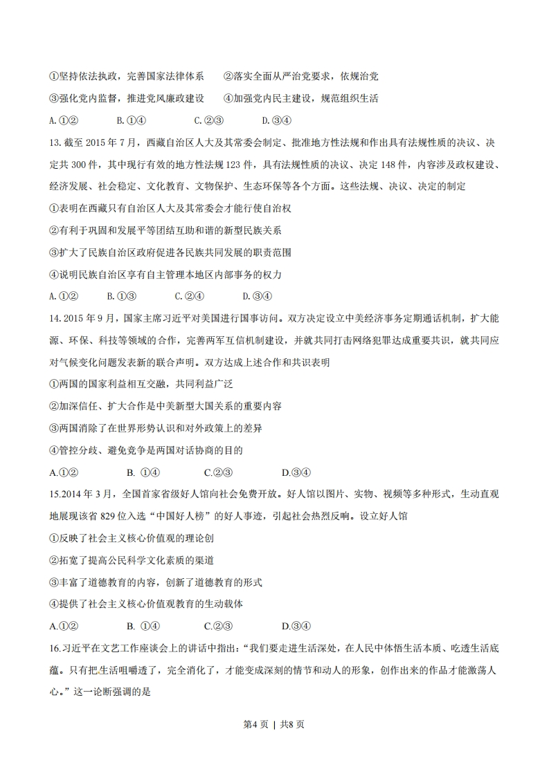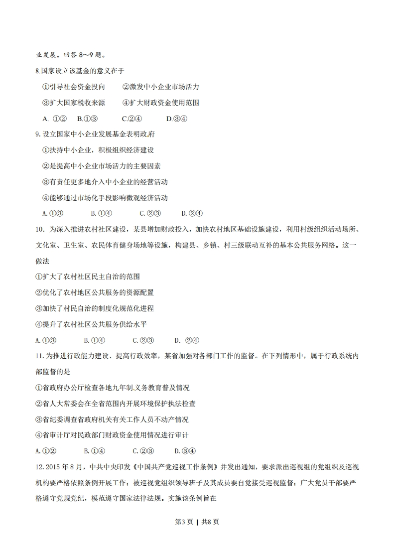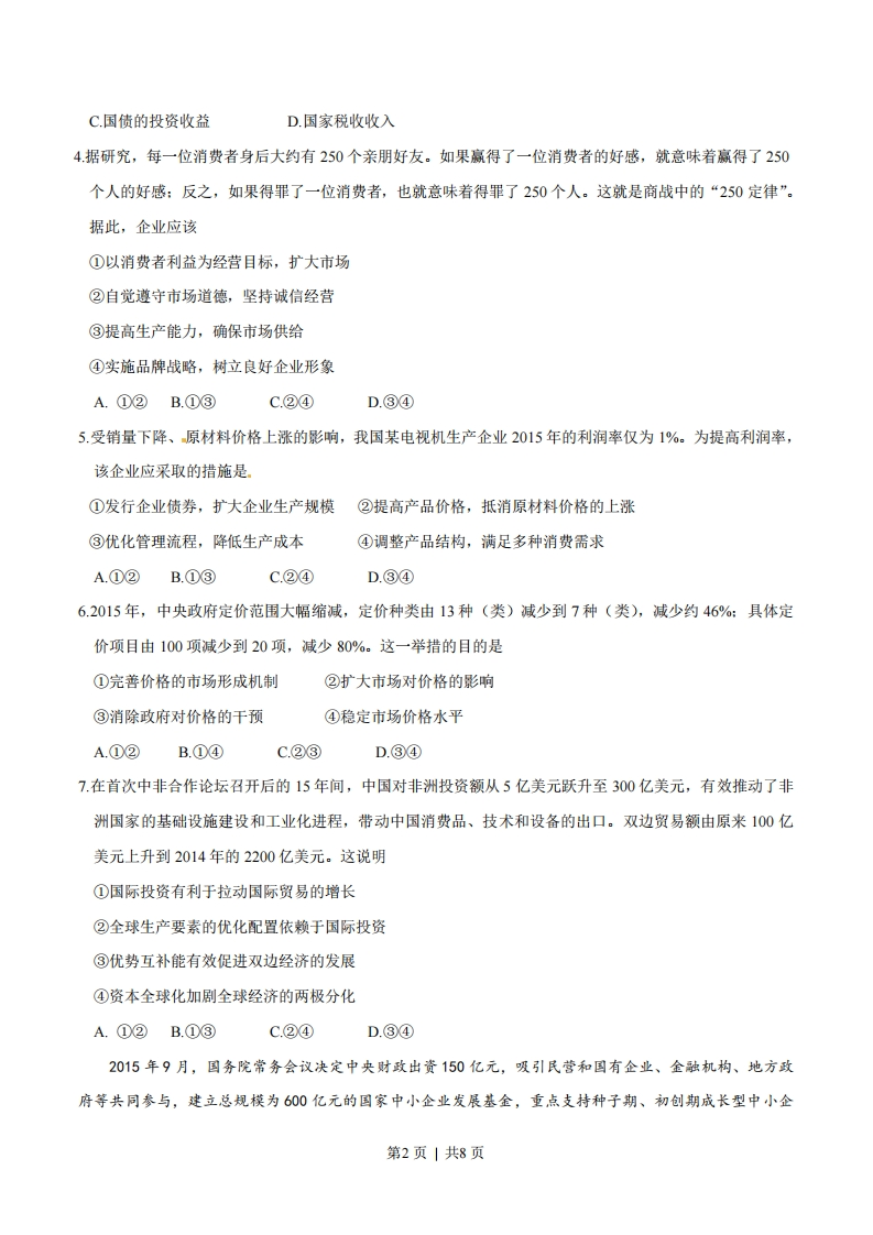 2016年普通高等学校招生全国统一考试(海南卷)政治注意事项:1.本试卷分第I卷(选择题)和第II卷(非选择题)两部分。答卷前,考生务必将自己的姓名、准考证号填写在答题卡上。2.回答第I卷时,选出每小题答案后,用铅笔把答题卡上对应题目的答案标号涂黑。如需改动,用橡皮擦干净后,再选涂其他答案标号。写在本试卷上无效。3.回答第II卷时,将答案写在答题卡上。写在本试卷上无效。4.考试结束后,将本试卷和答题卡一并交回。第I卷本卷共22小题,年小题2分。在每小题给出的四个选项中,只有一项是符合题目要求的。1.小倩跟妈妈去农贸市场,发现市场上出售的养鸡场的鸡大约50元/只,农村散养的鸡大约150元/只,价格悬殊。在下列选项中,与小倩的发现属于同类价格现象的是A.在老字号裁缝铺定制的旗袍价格是某成衣公司旗袍价格的3倍B.3月份北京市场上的草莓价格是海南三亚草莓价格的3倍C.中国销售的进口汽车价格是国外同款汽车价格的2倍D.广州的租车价格大约是合肥租车价格的1.5倍2.移动支付是指利用手机等移动终端对商品或服务的交易进行结算的一种方式。随着移动支付方式的兴起,越来越多的消费者开始通过移动支付方式完成交易。在其他条件不变的前提下,移动支付对货币流通的影响是①货币流通速度加快②流通中所需的货币量减少③货币周转次数减少④货币的实际供应量增加A.①②B.①④C.②③D.③④3发行国债是政府筹集资金的重要方式,这些债务最终是要偿还的。政府偿还国债的主要资金来源是A新国债的发行收入B.国有企业上缴的利润第1页|共8页