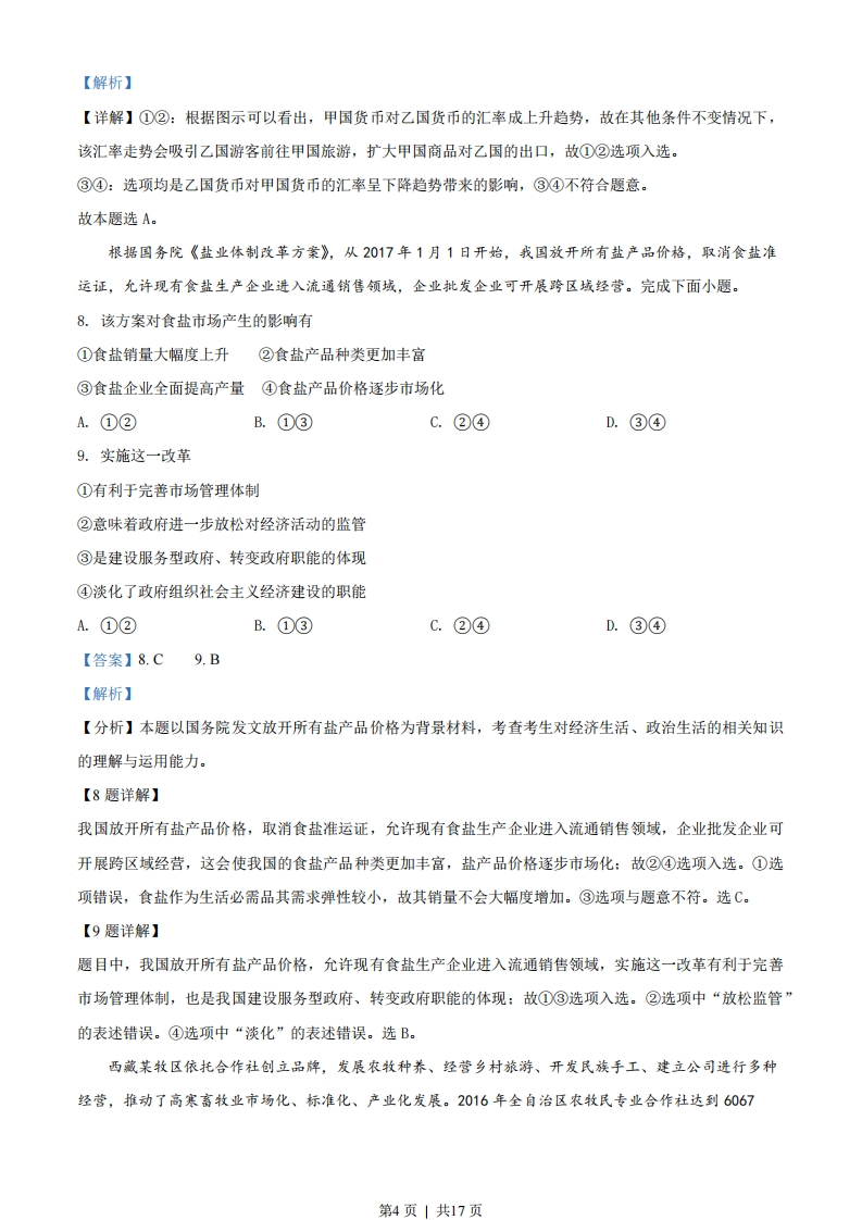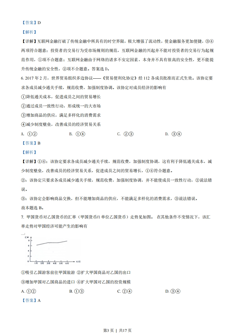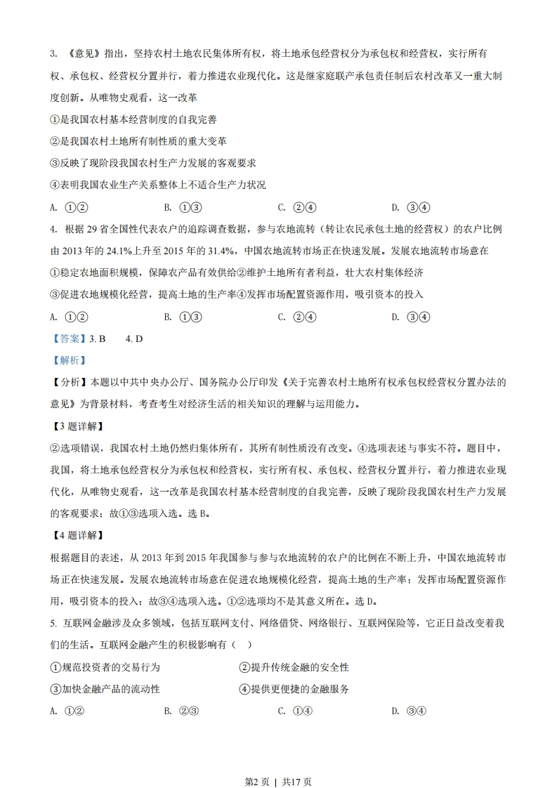 2017年全国普通高等学校招生统一考试政治(海南卷)一、选择题:本题共22小题,每小题2分,共44分。在每小题给出的四个选项中,只有一项是符合题目要求的。1.某投资者用10万元的资产(其中负债8万元,自有资金2万元)投资某只股票,年初以50元价格购进,在6月的最后一个交易日以55元卖出。不考虑其他因素,该投资者的年收益率和自有资金年收益率分别是A.10%:20%B.10%:50%C.20%:100%D.20%:200%【答案】C【解析】【详解】根据题意,某投资者年初共投资100000÷50一2000只股票。半年收益为2000×(55-50)=10000元。即一年收益为10000×2一20000元.因此,该投资者的年收益率为20000÷100000×100%=20%.自有资金的年收益率为20000÷20000×100%=100%。故选:C。2.中国奶业质量报告显示,我国乳制品企业注重品种开发和产品创新,乳制品质量大幅度提升,产品大量销往海外,满足不同人群的消费需求。这表明A.乳制品的价格越高,价值量越大B.销量越大,单位乳制品的价值量越大C.乳制品质量越高,使用价值越大D.乳制品品种越丰富,使用价值越大【答案】C【解析】【详解】C:我国乳制品企业注重品种开发和产品创新,乳制品质量大幅度提升,产品大量销往海外,满足不同人群的消费需求,这表明乳制品质量越高,使用价值越大,C符合题意。A:价值决定价格,而不是价格决定价值,并且商品价值量是由生产商品的社会必要劳动时间决定的,A错误。B:商品价值量是由生产商品的社会必要劳动时间决定的,而不是由销量决定的,B错误。D:商品价值量是由生产商品的社会必要劳动时间决定的,而不是由品种决定的,D错误。故选C。2016年9月,中共中央办公厅、国务院办公厅印发《关于完善农村土地所有权承包权经营权分置办法的意见》。完成下列小题。第1页」共17页