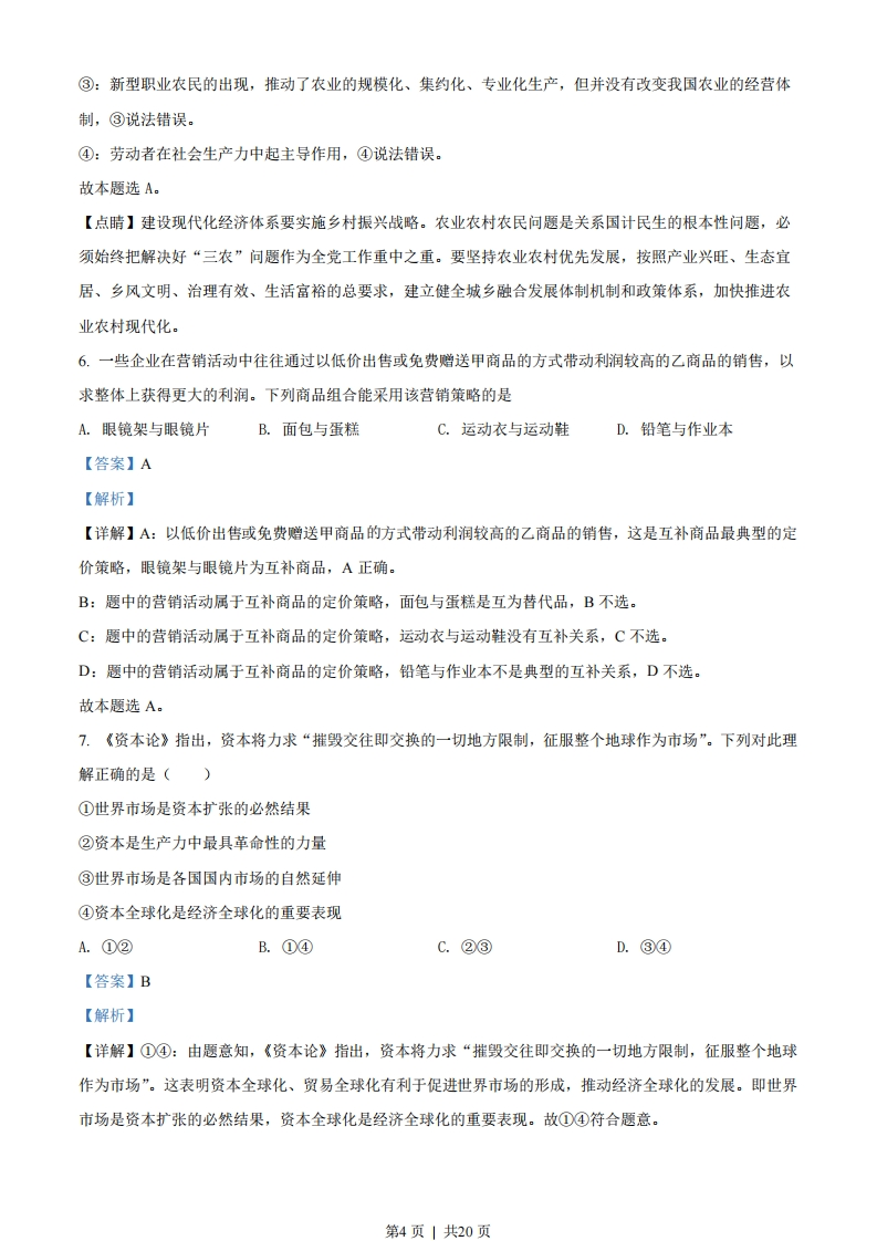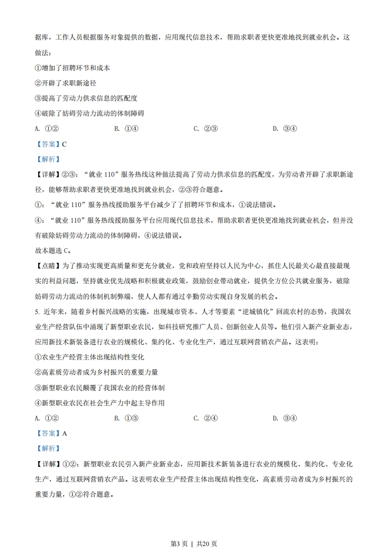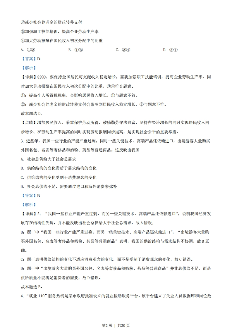 2019年海南省高考政治试卷一、单项选择题1.随着网络环境的改善,支付宝、微信支付等第三方支付方式逐步运用到人们的日常结算活动中。在其他条件不变的情况下,第三方支付方式的广泛运用将()①减少流通中所需要的货币量②加快货币的流通速度③降低单位货币包含的价值量④扩大货币的基本职能A.①②B.①④C.②③D.③④【答案】A【解析】【详解】①②:商品流通中实际需要的货币量是受货币流通规律支配的。在一定时期内,流通中所需要的货币量同商品价格总额成正比,同货币流通速度成反比。因此,第三方支付方式的广泛运用,意味着货币的流通速度加快,在待售商品与服务总量和物价总水平不变的情况下,流通中所需要的货币量将会减少。故①正确、②正确。③:单位货币包含的价值量是由生产单位货币的社会必要劳动时间决定的,第三方支付方式的广泛运用并不会降低单位货币包含的价值量。故③错误。④:价值尺度和流通手段依然是货币的两大基本职能,第三方支付方式的广泛运用并没有扩大货币的基本职能。故④错误。故本题正确答案为A。2.下图反映某国2014-2018年居民人均可支配收入的变化。元%35000一全国居民人均可支配收入·-比.上年实际增长30280002822825794242382121966210002016718140001270008.07.46.37.366.50020142015201620172018有利于促成上述变化的举措是:①提高个人所得税税率第1页」共20页