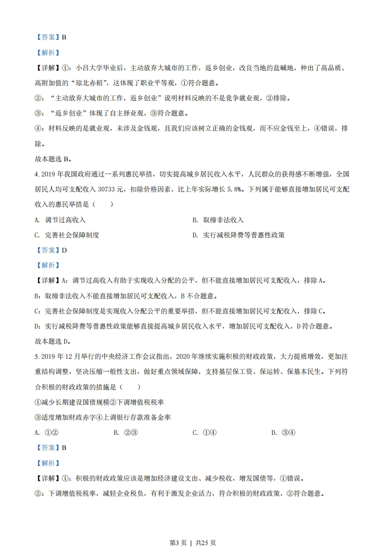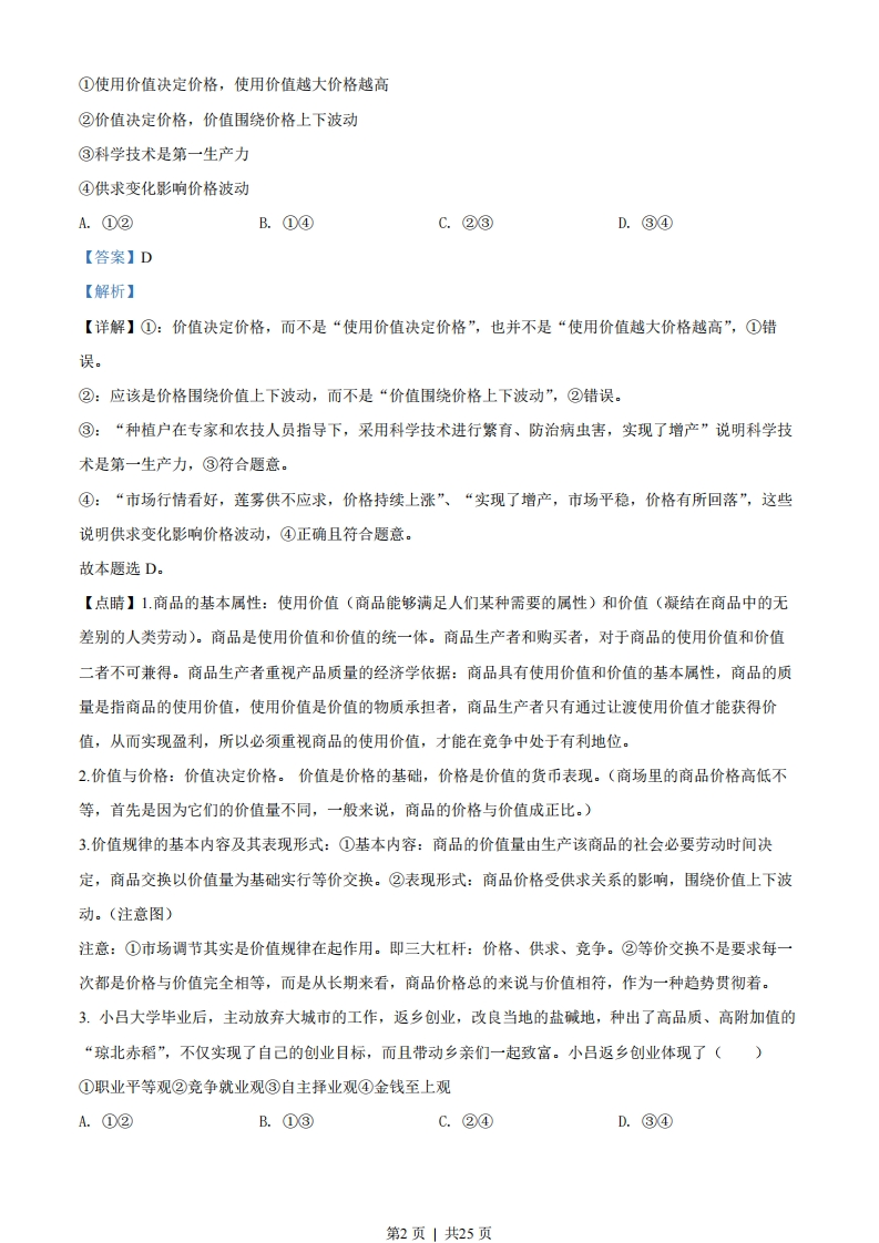海南省2020年学业水平选择性考试1.据国家统计局公布的数据,2019年我国国内生产总值为99.0865万亿元,比上年增长6.1%:按年平均汇率折算,人均GDP突破1万美元大关,达到10276美元。这一成就说明我国()①经济总量继续扩大②综合国力进一步增强③恩格尔系数进一步提高④城乡居民收入差距不断扩大A.①②B.③④C.①③D.②④【答案】A【解析】【详解】①②:材料显示2019年我国国内生产总值同比增长,人均GDP突破1万美元大关,这表明我国经济总量继续扩大,综合国力进一步增强,①②正确。③:恩格尔系数是食品支出总额占个人消费支出总额的比重,材料未呈现,③排除。④:材料未呈现城乡居民收入情况,也未对城乡居民收入差距进行比较,④与题意无关。故本题选A。【点睛】1恩格尔系数是食品支出总额占个人消费支出总额的比重。一个家庭收入越少,家庭收入中(或总支出中)用来购买食物的支出所占的比例就越大,随着家庭收入的增加,家庭收入中(或总支出中)用来购买食物的支出比例则会下降。推而广之,一个国家越穷,每个国民的平均收入中(或平均支出中),用于购买食物的支出所占比例就越大,随着国家的富裕,这个比例呈下降趋势。2国内生产总值(GDP)是指按国家市场价格计算的一个国家(或地区)所有常驻单位在一定时期内生产活动的最终成果,常被公认为是衡量国家经济状况的最佳指标。国内生产总值GDP是核算体系中一个重要的综合性统计指标,也是我国新国民经济核算体系中的核心指标,它反映了一国(或地区)的经济实力和市场规模。3.人均国内生产总值是人们了解和把握一个国家或地区的宏观经济运行状况的有效工具,即“人均GDP”,常作为发展经济学中衡量经济发展状况的指标,是最重要的宏观经济指标之一。将一个国家核算期内(通常是一年)实现的国内生产总值与这个国家的常住人口(或户籍人口)相比进行计算,得到人均国内生产总值,是衡量各国人民生活水平的一个标准,为了更加客观的衡量,经常与购买力平价结合。2.海南某地种植的“黑金刚”莲雾,甜脆爽口、味美多汁,深受消费者欢迎,近年来市场行情看好,莲雾供不应求,价格持续上涨。当地种植户在专家和农技人员指导下,采用科学技术进行繁育、防治病虫害,实现了增产,市场平稳,价格有所回落。可见()第1页」共25页