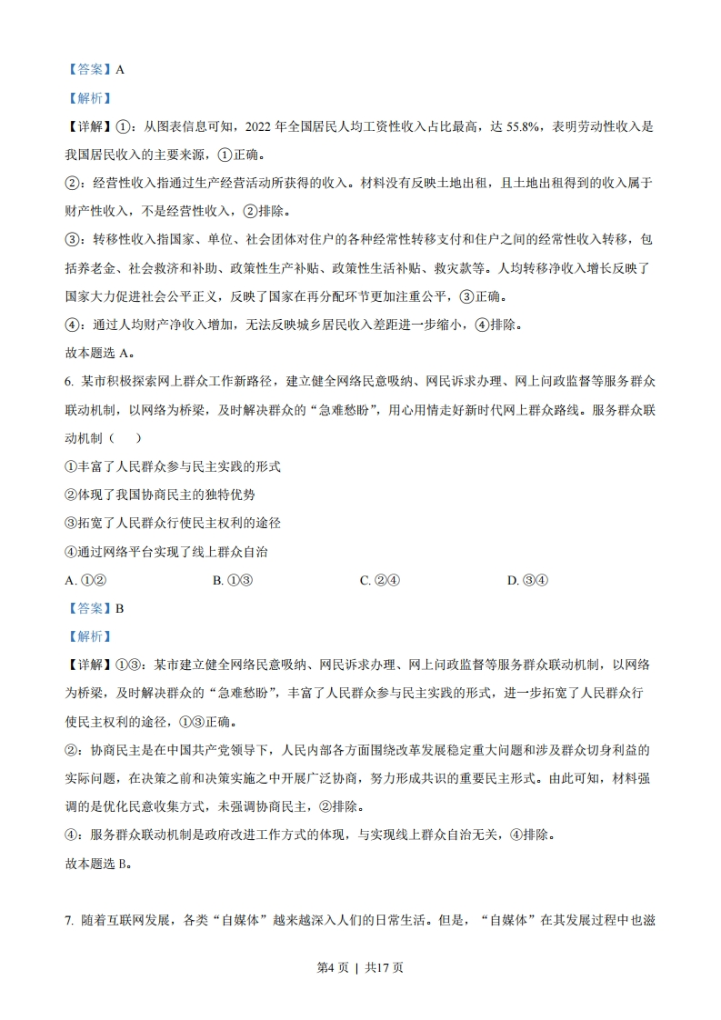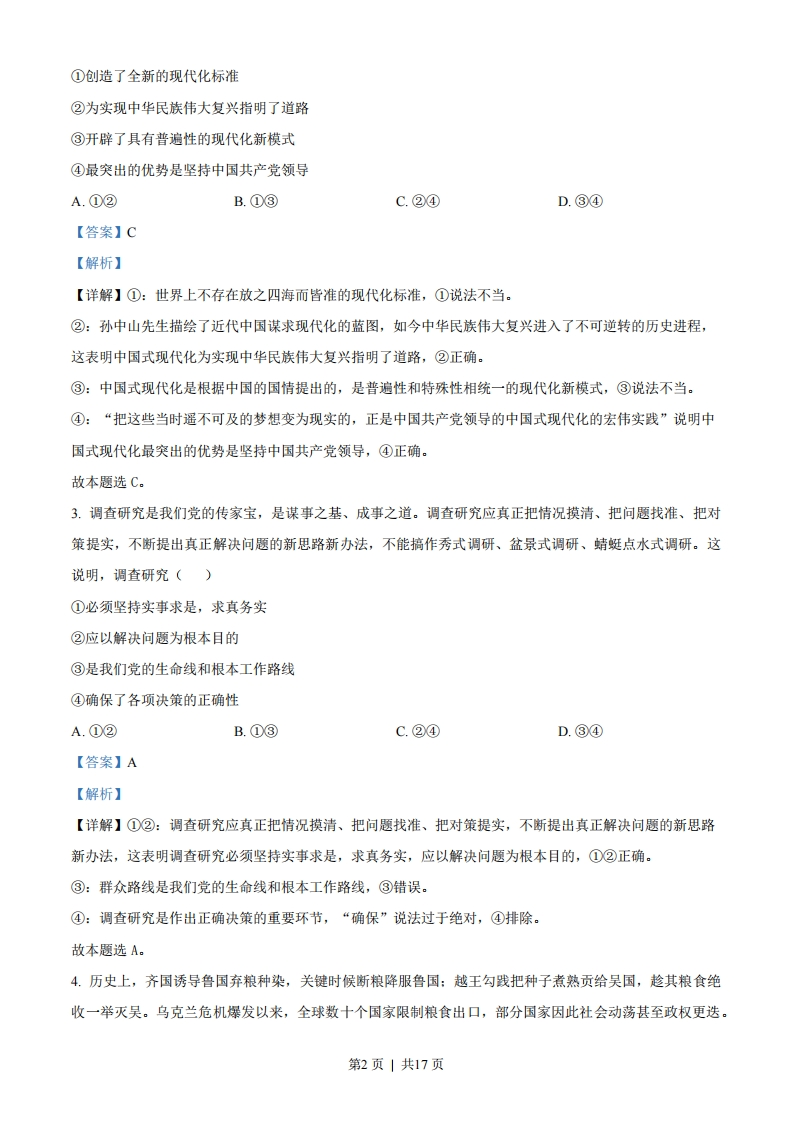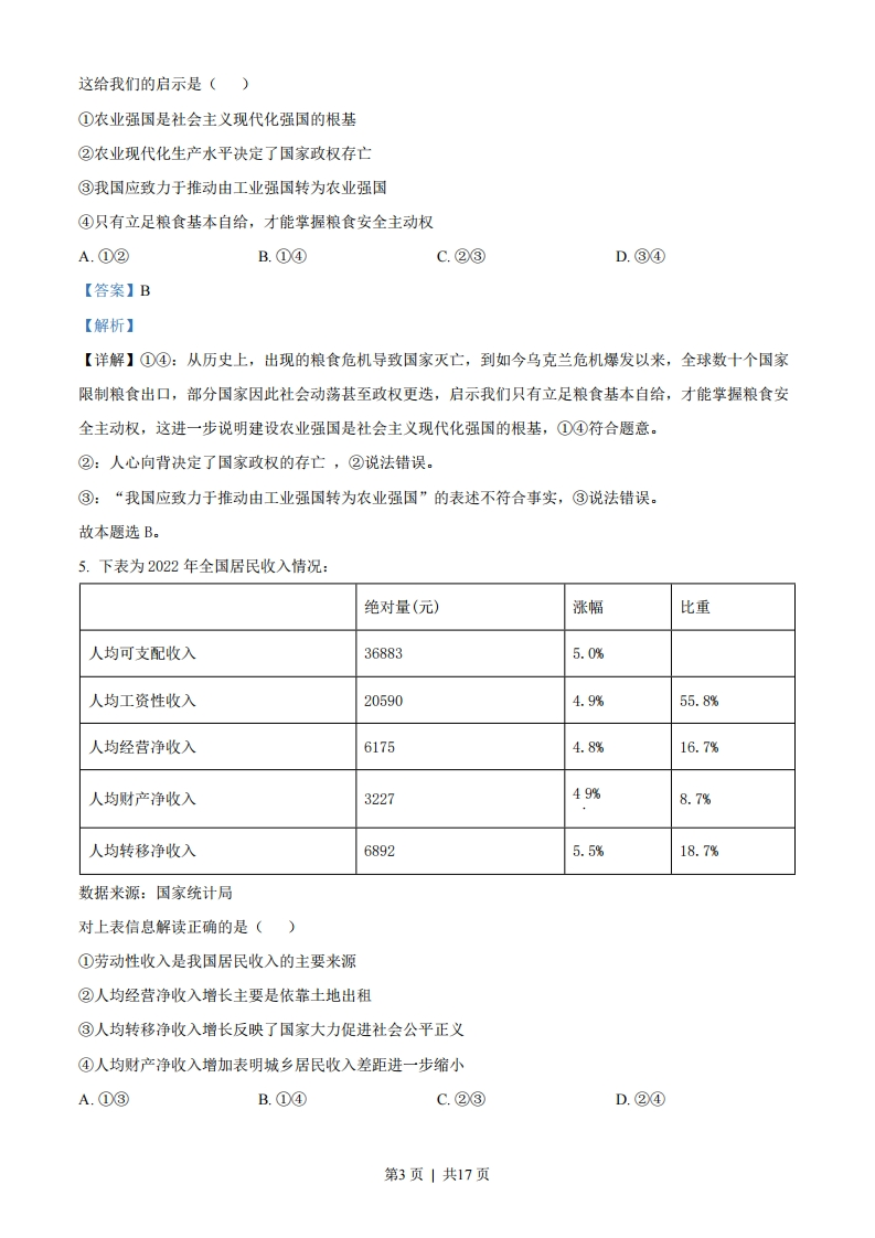 2023年海南省普通高中学业水平选择性考试思想政治注意事项:1.答卷前,考生务必将自己的姓名、准考证号填写在答题卡上。2。回答选择题时,选出每小题答案后,用铅笔把答题卡上对应题目的答案标号涂黑。如需改动,用橡皮擦干净后,再选涂其他答案标号。回答非选择题时,将答案写在答题卡上,写在本试卷上无效。3。考试结束后,将本试卷和答题卡一并交回。一、选择题:本题共22小题,每小题2分,共44分。在每小题给出的四个选项中,只有一项是最符合题目要求的。1.1848年2月,《共产党宣言》问世,这是人类思想史上的一个伟大事件,它科学论证了资本主义的必然灭亡和社会主义的必然胜利,号召全世界无产者联合起来,建立共产主义新社会。由此可见,《共产党宣言》()①是科学社会主义产生的客观前提②科学洞见了人类社会发展的客观规律③阐述了建立无产阶级政党的必要性④实现了社会主义从理论到实践的伟大飞跃A.①③B.①④C.②③D.②④【答案】C【解析】【详解】①:《共产党宣言》的发表,标志着科学社会主义的诞生,①不符合题意。②:《共产党宣言》科学论证了资本主义的必然灭亡和社会主义的必然胜利,科学洞见了人类社会发展的客观规律,②符合题意。③:《共产党宣言》号召全世界无产者联合起来,建立共产主义新社会,阐述了建立无产阶级政党的必要性,③符合题意。④:十月革命胜利建立了世界上第一个社会主义国家,实现了社会主义从理想到现实、从理论到实践的伟大飞跃,开辟了人类探索社会主义道路新纪元,④不符合题意。故本题选C。2.100多年前,孙中山先生描绘了近代中国谋求现代化的蓝图:修建160万公里公路、16万公里铁路、3个世界级大海港…把这些当时遥不可及的梦想变为现实的,正是中国共产党领导的中国式现代化的宏伟实践。今天,中国己经全面建成小康社会,国际影响力、号召力显著提升,中华民族伟大复兴进入了不可逆转的历史进程。这表明,中国式现代化()第1页|共17页