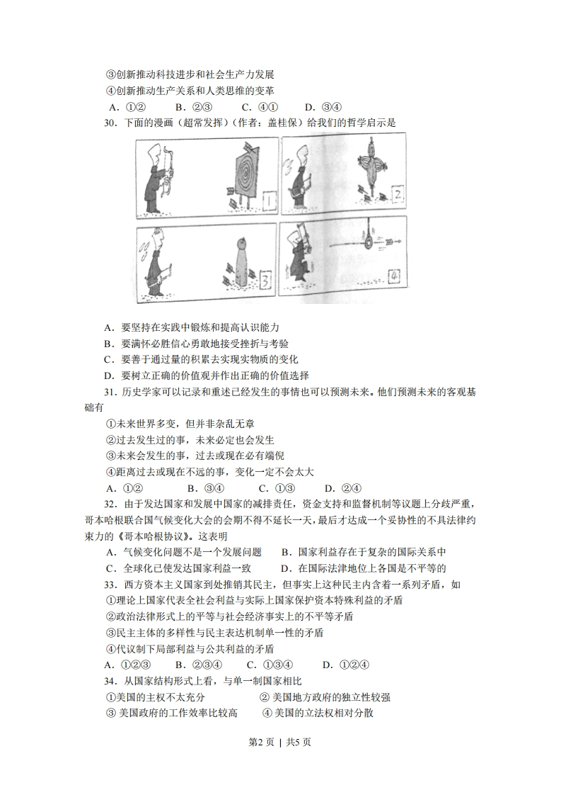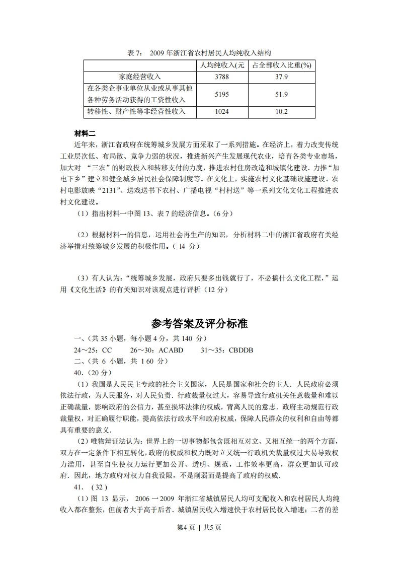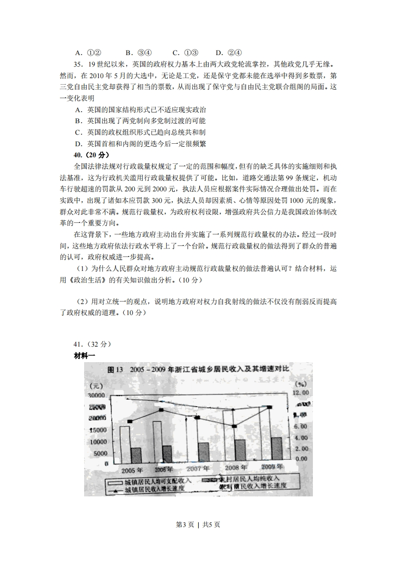 2010年普通高等学校招生全国统一考试(浙江卷)文科综合能力测试一一政治试题及答案24.面对近年来原材料劳动力等价格上升的压力,我国沿海某服装出口企业,把生产环节转移到劳动力、土地等生产要素具有优势的内陆地区,并致力于产品研发、品牌设计和营销推广,从而大大提高了产品出口竞争力。该企业竞争力提高的因素有①调整经营战略,利用资源优势②依靠技术创新,维持低价竞争③加强品牌建设,拓展销售渠道④调整产业结构,提高产品质量A.①②B.②④C.①③D.③④25.为抑制商品房价格过快上涨,促进房地产市场健康发展,我国政府采取了一系列增加保障性住房供给的措施,如增加价格明显低于商品房的经济适用房、共低收入者租用的廉价房等。政府出台这些措施是因为①增加经济适用房可以减少商品房购买需求②增加廉租房就能抑制商品房有效需求③经济适用房与廉租房互为替代品④增加保障性住房能缓解房地产市场的过度炒作A.①②B.②③C.①④D.③④26.如果甲国年利率为1%,乙国货币对甲国货币呈贬值趋势,预期一年后贬值为2%,那么,不考虑其他因素的条件下,从投资的角度看A.更多的资金将会流向甲国B.更多的资金将会流向乙国C.甲乙两国资金出现等量流动D.甲乙两国间停止资金流动世博会是战士人类文明成果的盛会,也是世界各国欢聚、沟通与合作的舞台。认识世博会的认识人类进步的捷径之一。回答27-28题。27.150多年来,一些重大发明,如照明、通信、汽车灯技术,都是在世博会上面世后才逐渐转化为主流产业的。从文化生活角度看,这是因为A.各具特色的民族文化使世界文化多姿多彩B.文化的传播与交融式历史发展的必然趋势C,文化的交流与借鉴是人类文明进步的重要动力D.现代大众传媒超越时空的强大功能加速了文化传播28.“城市,让生活更美好”一一2010年上海世博会主题,反映了当今世界各国对城市化进程中遇到的共同问题的关切,引领人们更多的去思考“什么是美好城市和美好生活”。上海世博会以“城市,让生活更美好”为主题表明①意识活动具有自觉选择性②社会意识具有相对独立性③社会意识总是与时俱进的④社会意识变化推动社会发展A.①②B.②④C.②③D.③429.2004年以来,中国通过原始创新、集成创新和引进消化吸收再创新,取得了一系列重大技术创新成果,形成了具有世界领先水品的告诉铁路技术体系。今天,中国己步入高铁时代,并正在成为高铁技术输出国。中国高铁的发展历程表明①创新就是对既往的否定和对现实的肯定②创新的过程必定是“扬弃”的过程第1页|共5页