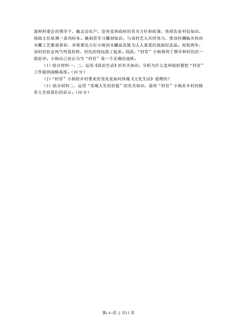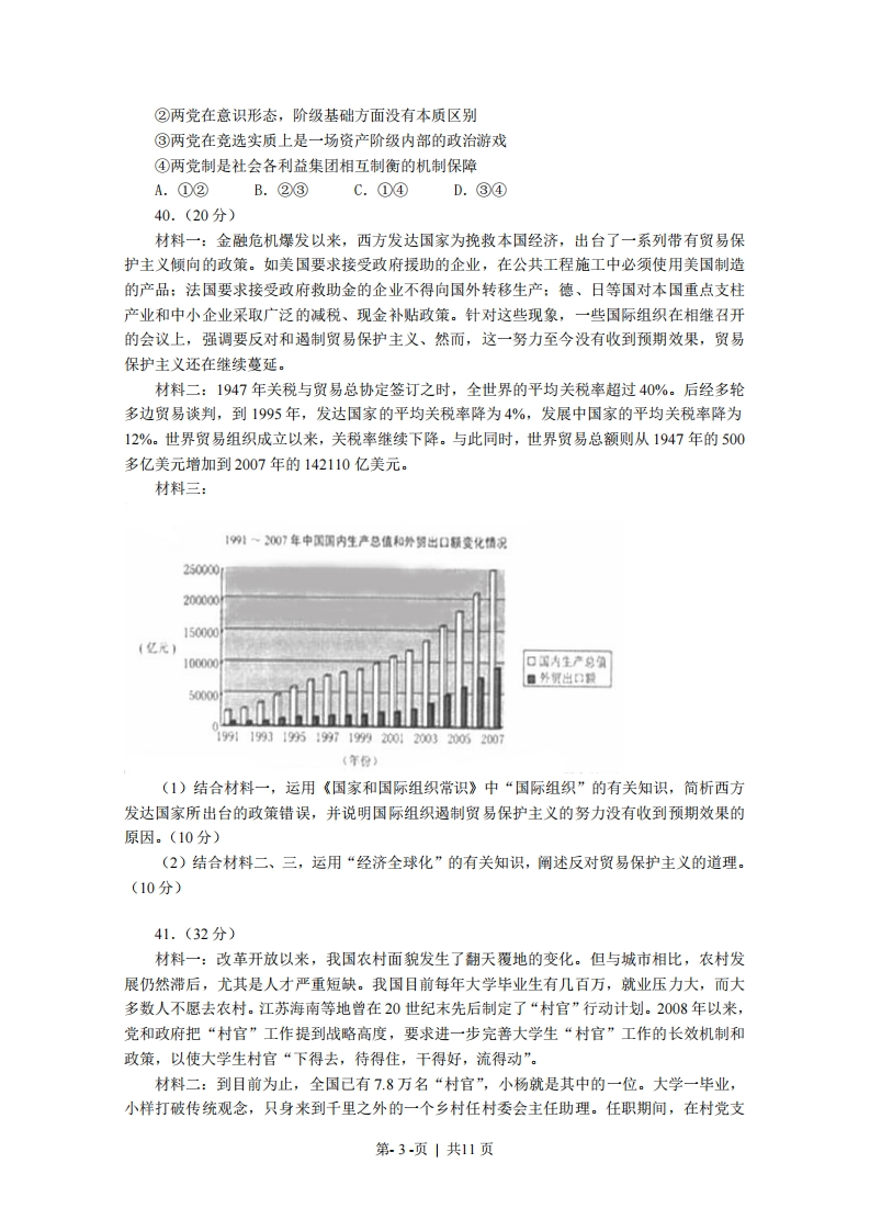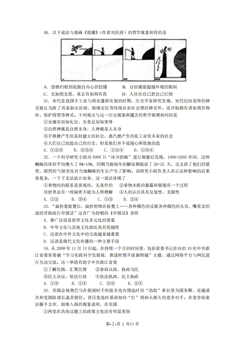 2009年普通高等等学校招生全国统一考试(浙江卷)文科综合测试—一政治试题及答案24.从历史发展的过程看,下列判断正确的是A.一切商品都能承担价值尺度职能B.只有货币能承担价值尺度职能C.凡是劳动产品都能承担价值尺度职能D.仅仅金银能承担价值尺度职能25.手机的使用越来越普及,人们对手机的功能和通信服务的要求也越来越高,这使得3G(第三代移动通信)应运而生,随着3G时代的到来,一个由设备生产、终端制造、信息服务构成的庞大产业链正在壮大。这表明①消费对生产的调整和升级起着导向作用②消费量的增加带来产品质量的提高③消费热点的出现能带动相关产业的成长④消费是社会再生产过程中起决定作用的环节A.①②B.①③C.②③D.③④26.民营经济在建设浙江经济大省中发挥了极其重要的作用。但是,众多民营企业缺乏自主品牌,产品同构同质、附加值低,产业转型升级己成为浙江经济可持续发展的当务之急。为此,政府应该A.拓宽融资渠道,挽救濒临破产企业B.推动结构调整,鼓励企业科技创新C.加强公共服务,拓展企业产品销路D.增加财政支出,扩大企业生产规摸27.小张在2007年将30万资金全部用于投资股票,年底赚了10万。而2008年同样的投资却亏损了16万。小王在这两年内将30资金中的5万投资股票,6万投资国债,18万存入银行,1万购买保险,共获利2万。上述事例从一个侧面说明①盈亏取决于投资结构②分散投资有利于规避风险③风险与收益是对等的④投资项目越多收益越大A.①②B.③④C.①④D.②③春秋时期,齐国国王命令大臣们必须穿丝质衣服,但国内只准种粮食而不准种桑树,齐国蚕丝需求量大,价格上涨,邻近的鲁、梁等国纷纷停止种粮改种桑树。几年后,齐王又命令只准穿布衣,且不准卖粮食给其他国家。结果,鲁、梁等国因饥荒而大乱,不战而衰,齐国坐享其成,使疆土得以扩张。回答28-29题28.上述故事中蕴涵的经济生活道理有①供求变化只接影响商品的价格②价格变动对生产具有调节作用③价格在本质上是由供求决定的,④价格涨跌是通过行政手段实现的A.①②B.②③C.①④D.③④29.鲁、梁等国不战而衰的惨痛教训给我们的启示是,看问题、办事情①既要看到运动的绝对性,更要看到静止的相对性②既要注重量变,更要促成质变③既要认识矛盾的同一性,又要把握矛盾的斗争性④既要重视局部,又要统筹全局A.①②B.①④C.③④D.②③第.1-页|共11页