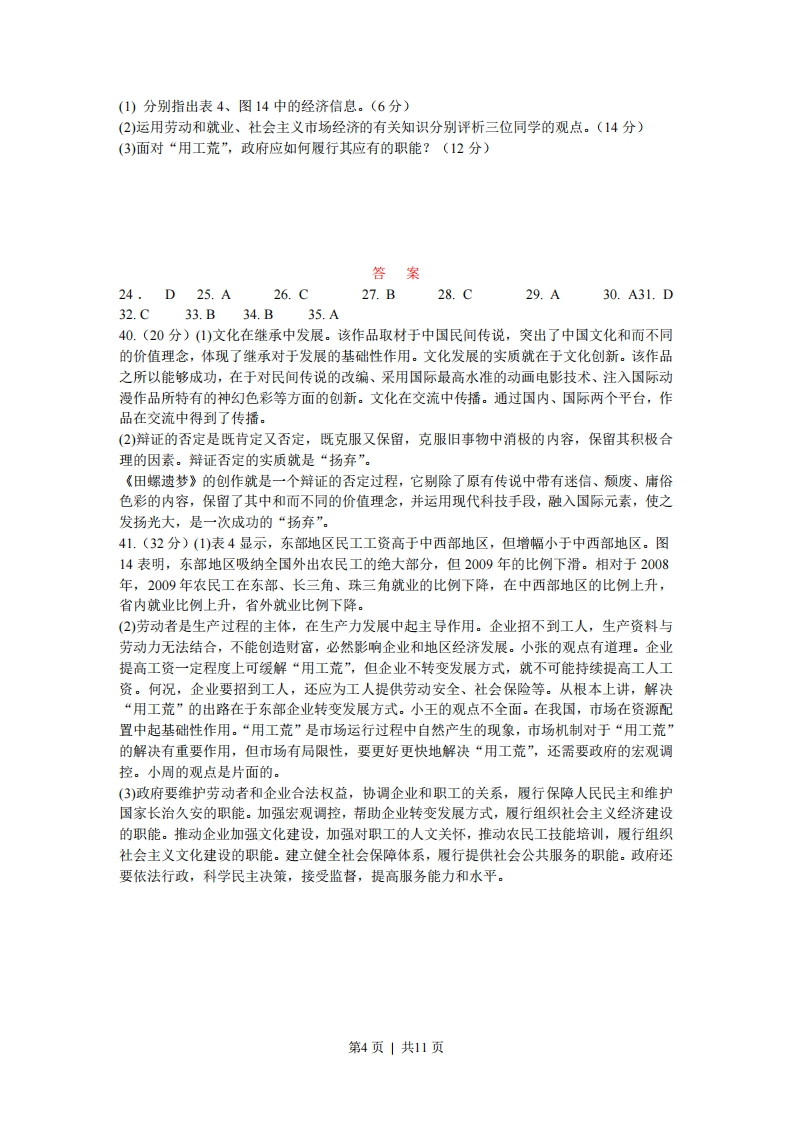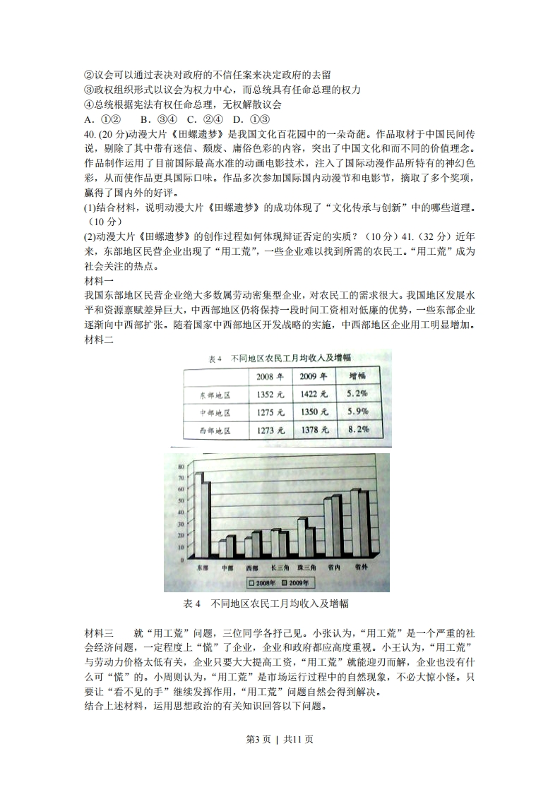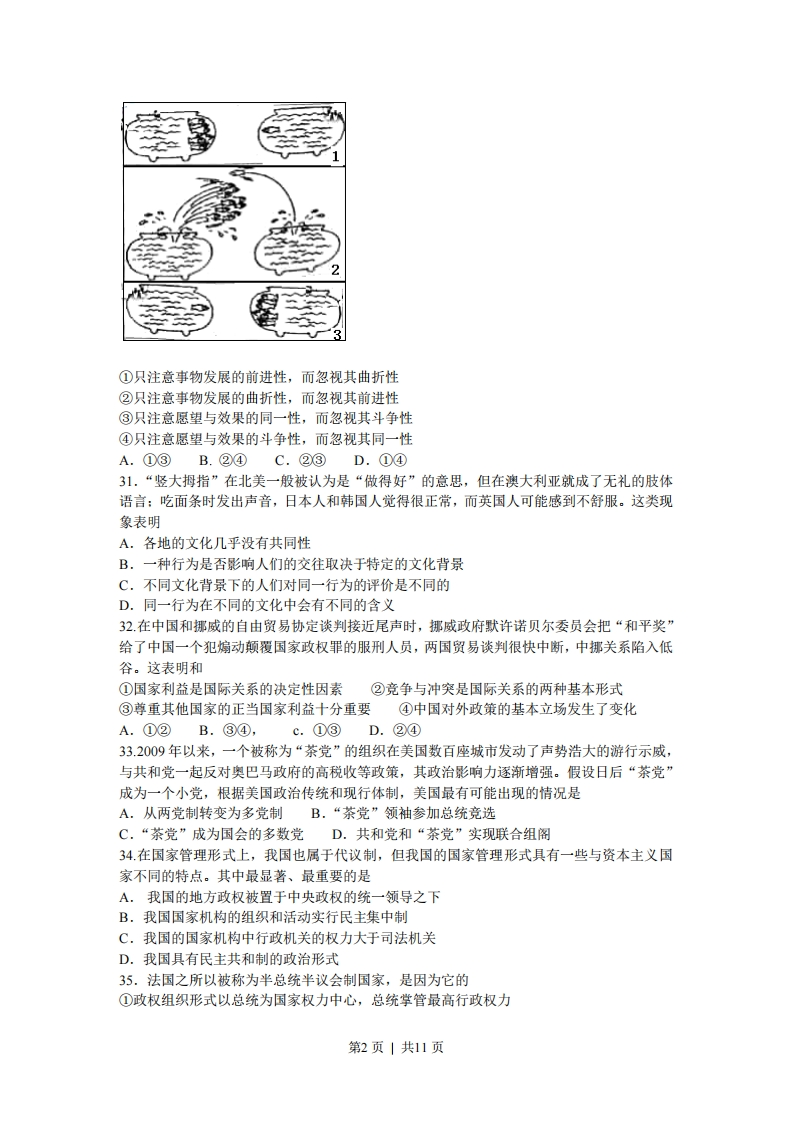 浙江省2011年高考文科综合能力测试试题24.银行信用卡是商业银行对资信状况良好的客户发行的一种信用凭证。使用银行信用卡A.可减少现金流通量并缓解通货膨胀B.相当于货币执行价值尺度职能C.既非常方便又十分安全D.可以获得银行指定额度内的贷款25.2011年4月,我国居民消费价格指数(CP)同比上升5.3%。为有效控制通货膨胀,政府应采取的财政政策和措施是A.削减行政开支,减少财政支出B.增加国家税收,扩建公用设施C.减少国家税收,减持外国国债D.增加财政支出,刺激需求增长26.假如国家将个人所得税起征点由2000元上调至3000元,其他条件不变,下列说法中正确的是A.月收入3000元以下的所有居民应缴个人所得税减少B.月收入超过3000元的居民没有得到实惠C.居民整体可支配收入增加D.初次分配更加合理27.每天都会有新的盐分进人海水,海水中也会有一些盐分进入海床沉积层。新注入的盐分数量与海水里跑掉的盐分数量互相抵消,海水的平均溶盐浓度保持稳定。这表明①量变是质变的必要准备②质变是量变的必然结果③静止是一种特殊的运动④物质是运动的物质A.①②B.③④C,②③D.①④28.考古学好比望远镜,可以让我们远望人类的起点和整个历史,考古遗物则如同显微镜可以让我们透视具体的历史事件。这意味着①没有对个体的透视整体就难以把握②没有对整体的理解个体就无法认识③没有实践认识就没有来源④没有认识的指导实践就不能深人A.①②B.③④c.①③D.②④29.2011年初以来,社会动荡席卷中东、北非众多阿拉伯国家,一些国家甚至出现政权更迭和内战。其原因有失业率居高不下、财富分配不公和西方意识形态的影响等。这表明①经济状况影响社会的政治制度和设施②意识形态对社会变化起重要作用③适合上层建筑的经济基础推动生产力发展④生产关系是社会进步的决定性因素A.①②B.③④C.②③D.①④30.从辩证法的角度看,漫画《羡慕》(作者:周中华)中双方改变处境的努力最终失败的原因有第1页1共11页