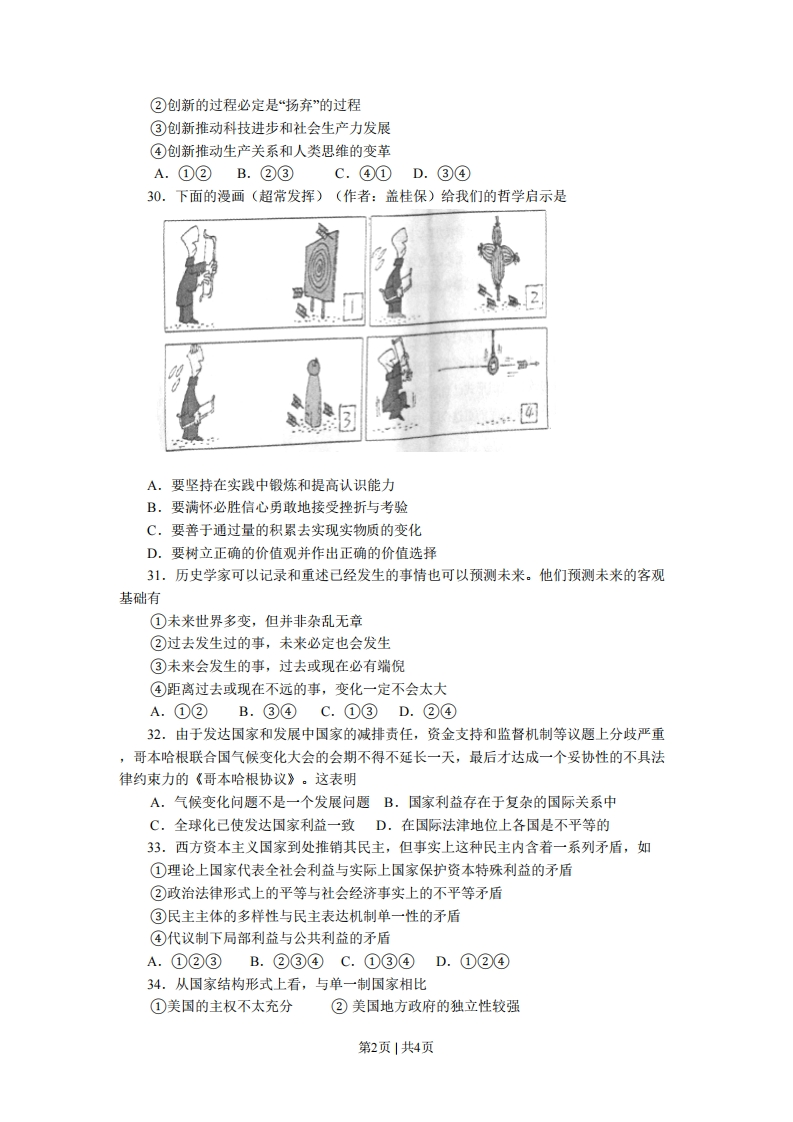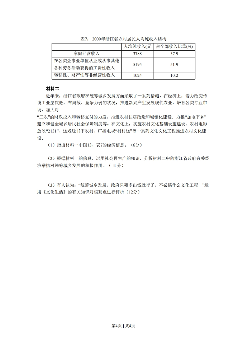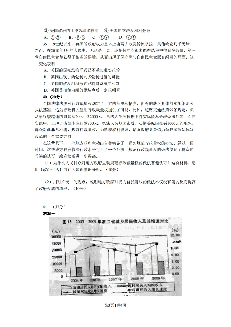 2010年普通高等学校招生全国统一考试(浙江卷)文科综合能力测试一一政治试题及答案24.面对近年来原材料劳动力等价格上升的压力,我国沿海某服装出口企业,把生产环节转移到劳动力、土地等生产要素具有优势的内陆地区,并致力于产品研发、品牌设计和营销推广,从而大大提高了产品出口竞争力。该企业竞争力提高的因素有①调整经营战略,利用资源优势②依靠技术创新,维持低价竞争③加强品牌建设,拓展销售渠道④调整产业结构,提高产品质量A.①②B.②④C.①③D.③④25.为抑制商品房价格过快上涨,促进房地产市场健康发展,我国政府采取了一系列增加保障性住房供给的措施,如增加价格明显低于商品房的经济适用房、共低收入者租用的廉价房等。政府出台这些措施是因为①增加经济适用房可以减少商品房购买需求②增加廉租房就能抑制商品房有效需求③经济适用房与廉租房互为替代品4增加保障性住房能缓解房地产市场的过度炒作A.①②B.②③C.①④D.③④26.如果甲国年利率为1%,乙国货币对甲国货币呈贬值趋势,预期一年后贬值为2%,那么,不考虑其他因素的条件下,从投资的角度看A.更多的资金将会流向甲国B.更多的资金将会流向乙国C.甲乙两国资金出现等量流动D.甲乙两国间停止资金流动世博会是战士人类文明成果的盛会,也是世界各国欢聚、沟通与合作的舞台。认识世博会的认识人类进步的捷径之一。回答27-28题。27.150多年来,一些重大发明,如照明、通信、汽车灯技术,都是在世博会上面世后才逐渐转化为主流产业的。从文化生活角度看,这是因为A.各具特色的民族文化使世界文化多姿多彩B.文化的传播与交融式历史发展的必然趋势C.文化的交流与借鉴是人类文明进步的重要动力D.现代大众传媒超越时空的强大功能加速了文化传播28.“城市,让生活更美好”2010年上海世博会主题,反映了当今世界各国对城市化进程中遇到的共同问题的关切,引领人们更多的去思考“什么是美好城市和美好生活”。上海世博会以“城市,让生活更美好”为主题表明①意识活动具有自觉选择性②社会意识具有相对独立性③社会意识总是与时俱进的④社会意识变化推动社会发展A.①②B.②④C.②③D.③④29.2004年以来,中国通过原始创新、集成创新和引进消化吸收再创新,取得了一系列重大技术创新成果,形成了具有世界领先水品的告诉铁路技术体系。今天,中国己步入高铁时代,并正在成为高铁技术输出国。中国高铁的发展历程表明①创新就是对既往的否定和对现实的肯定第1页|共4页