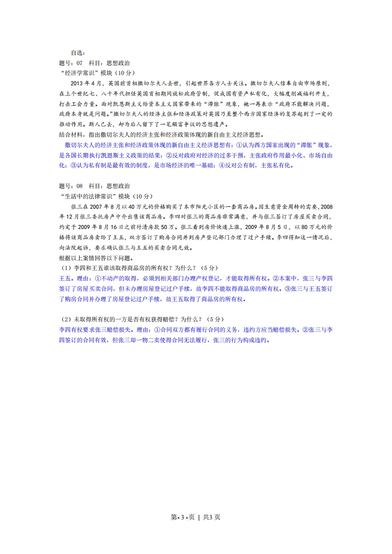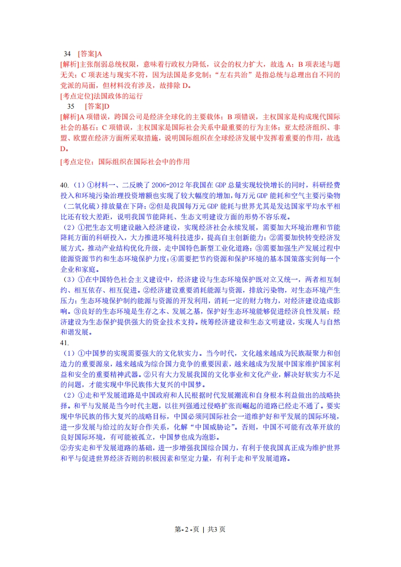 参考答案24.B25A26[答案]C[解析]问候语的变化,随着时代、社会的发展,人们的生活水平发生了很大的变化,这与居民的收入、社会经济的发展有关,故选①③:②④虽然本身正确,但漫画不反映。[考点定位]影响消费水平的因素、消费结构27[答案]A[解析]问候语的变化,与社会经济发展有关,体现了社会存在决定社会意识,故选①:不同时代人们的问候语不同,这要求我们坚持具体问题具体分析,故选②:③说法错误,科技的进步推动社会生产力的发展:社会意识具有相对独立性,与社会存在的发展不一定完全同步,故④错误。[考点定位]社会存在决定社会意识、矛盾的特殊性28[答案]B[解析]“需要我们每个人的微贡献”,表明社会的发展离不开个人,故选B:A项是强调个人的发展不开社会:C项片面,价值观对社会和人生有重要的导向作用,这里的价值观有正确和错误之分。[考点定位]在个人与社会的统一中实现价值29「答案1D[解析]科学家对基因突变与疾病关系的认识过程,反映了认识具有有限性、无限性和上升性。由于受到主客观条件的限制,人们在一定时期内对事物的认识是有限的,故选①③,②④说法本身正确,但材料中并未涉及实践活动。[考点定位]认识具有反复性、无限性、上升性30「答案1A[解析]现代智能通讯工具给人们带米方便的同时,也带来了不利的一面,这告诉我们要坚持一分为二的观点看待事物,故选A:B、C、D都是事物发展过程的认识。[考点定位]两点论与重点论的统一31「答案1C[解析]《媳妇的美好时代》走出国门,说明文化是民族的,也是世界的,故选C:A、D本身正确,但材料中没有体现,B项片面,对传统文化需要批判继承,发扬优秀的传统文化。[考点定位]文化是民族的又是世界的32[答案]C[解析]短短十天收到超过4300万张选票,说明我国公民参与政治生活的热情比较高,故选①:②说法片面,网络投票不能说明政治娱乐化,公民通过网络投票,这是公民参与政治生活的一种新途径,故选③:④说法错误,公民的基本政治权利是由宪法和法律规定的[考点定位]我国公民享有的政治权利33「答案D「解析]民众在要不要控枪问题上反映强烈,而民主党和共和党候选人在利益集团的压力下都有意回避,表明两党制的实质没有改变,仍然在维护资产阶级的利益,但两党为争夺选票,会提出符合选民利益的政策主张,故C不符合题意:A项错误,在具体议题上美国两党的政策和主张有明显差别:B项错误,美国两党在一些具体议题上的政策和主张的差别是充当两党制得以运行的基础:普通百姓没有渠道发出自己的声音,而利益集团主要依靠金钱干预政治,所以利益集团对美国总统选举有着一定的影响,故选D。[考点定位]美国利益集团的活动方式及其在政治生活中的作用第-1-页共3页