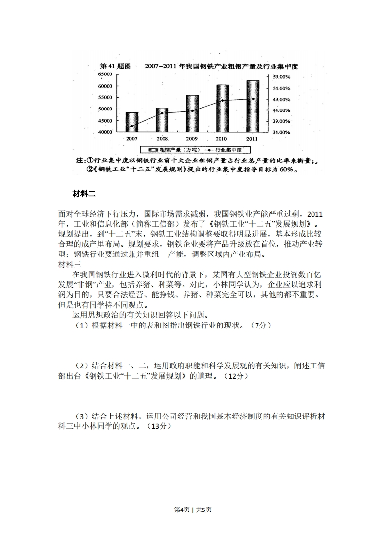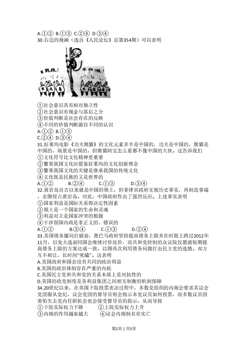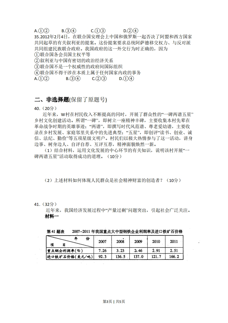 2012年浙江文综政治试题及答案一、选择题(保留了原题号)24.某镇居民喜食鸡肉和羊肉,近几年镇政府大力提倡发展养鸡业,市场上鸡肉供给大幅增加。假定羊肉供给未变,这会使①鸡肉价格下降,需求量增加②羊肉价格上升,需求量增加③鸡肉需求量减少,价格上升④羊肉需求量减少,价格下降A.①②B.②③C.③④D.①④25.2011年,国家将个人所得税起征点由2000元提高到3500元后,又大幅上调增值税和营业税起征点,如月销售额和营业额的最高标准都由原先的5000元提高到20000元。国家提高税收起征点的直接效果是A.促进分配公平,达到财政收支平衡B.完善收入分配制度,提高企业生产效率C增加中低收入者收入,减轻小微企业负担D.刺激居民消费需求,推动企业转型升级26.2008年金融危机以来,浙江民营企业加大海外投资力度,尤其是一批龙头企业从2011年开始集体发力参与国际并购,有的还把工厂开设到欧美国家。浙江民营企业上述措施的意义在于①拓展经济发展空间,提升国际化经济水平②提高资源配置效率,增强抵御风险的能力③加快产业转移,充分发挥我国劳动力资源优势④创新利用外资方式,形成参与国际竞争新优势A.①②B.①④C.②3D.③427我国地质地貌复杂,气候类型多样,自然灾害频发。因此,科学防灾减灾对经济社会发展极为重要。这里包含的道理有①地理环境是社会物质生活条件的基本要素②地址气候变化虽然复杂但一定有内在规律③发挥意识的能动作用就可以防灾减灾④顺从自然是防灾减灾的根本出路28.从畏惧自然到征服自然,进而认识到要善待自然、与自然和谐相处,千百年来人对自然态度的变化告诉我们①人对自然的认识在曲折中逐步深化②人与自然的矛盾有个逐步展开的过程③人与自然的关系是先对立后统一④人类终究无法把握无限的自然A.①②B.③④C.②③D.①④29.建设民生工程,既要建立惠及全民的基本公共服务,又要安排好困难群众的生产生活,还要妥善解决涉及群众利益的热点、难点、焦点问题。由此,我们可以领悟到①既要着眼于民生中的全局性问题、又要解决其中的局部性问题②推进民生工程建设,有待于社会改革的整体推进③既关注民生中的普遍问题,又不忘其中的特殊问题④提升民生工程质量,需要集中力量解决主要矛盾第1页1共5页