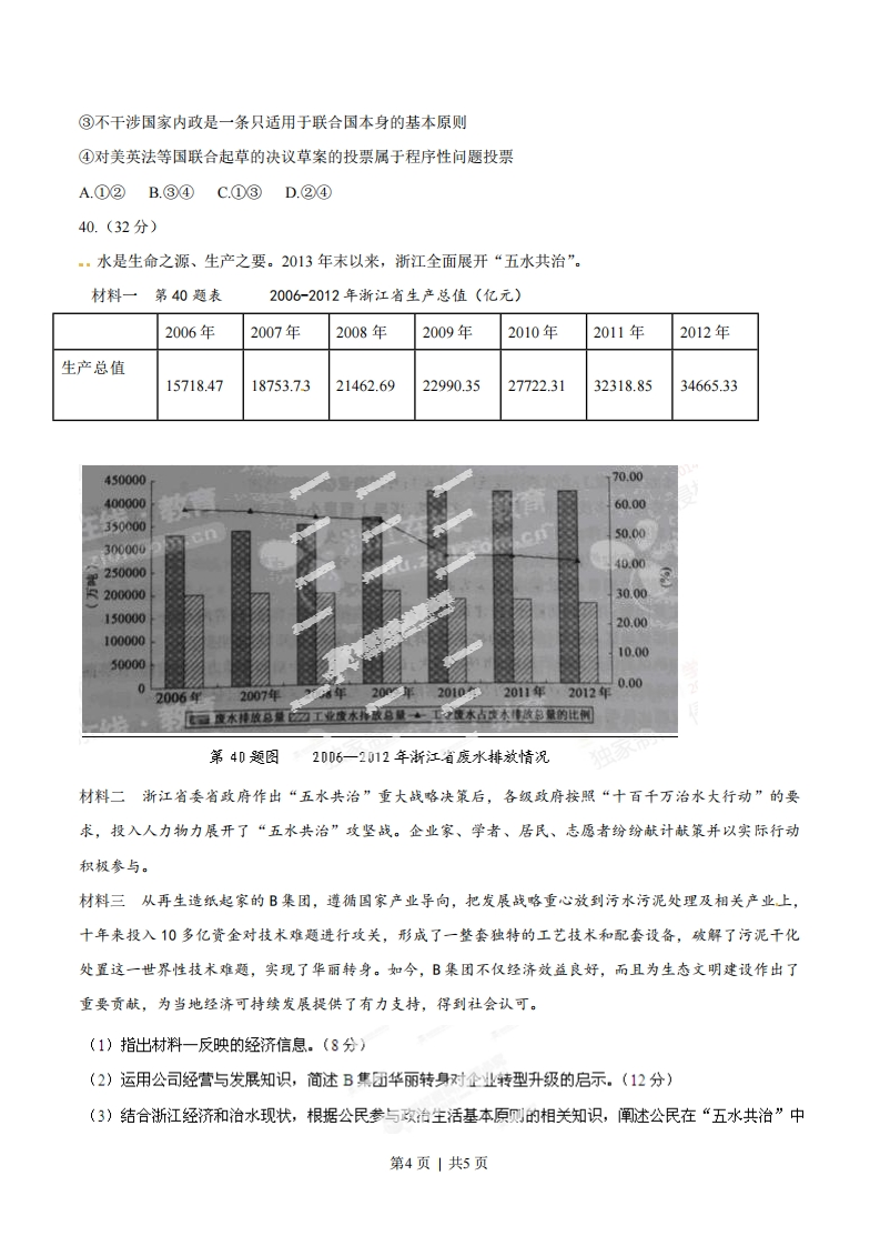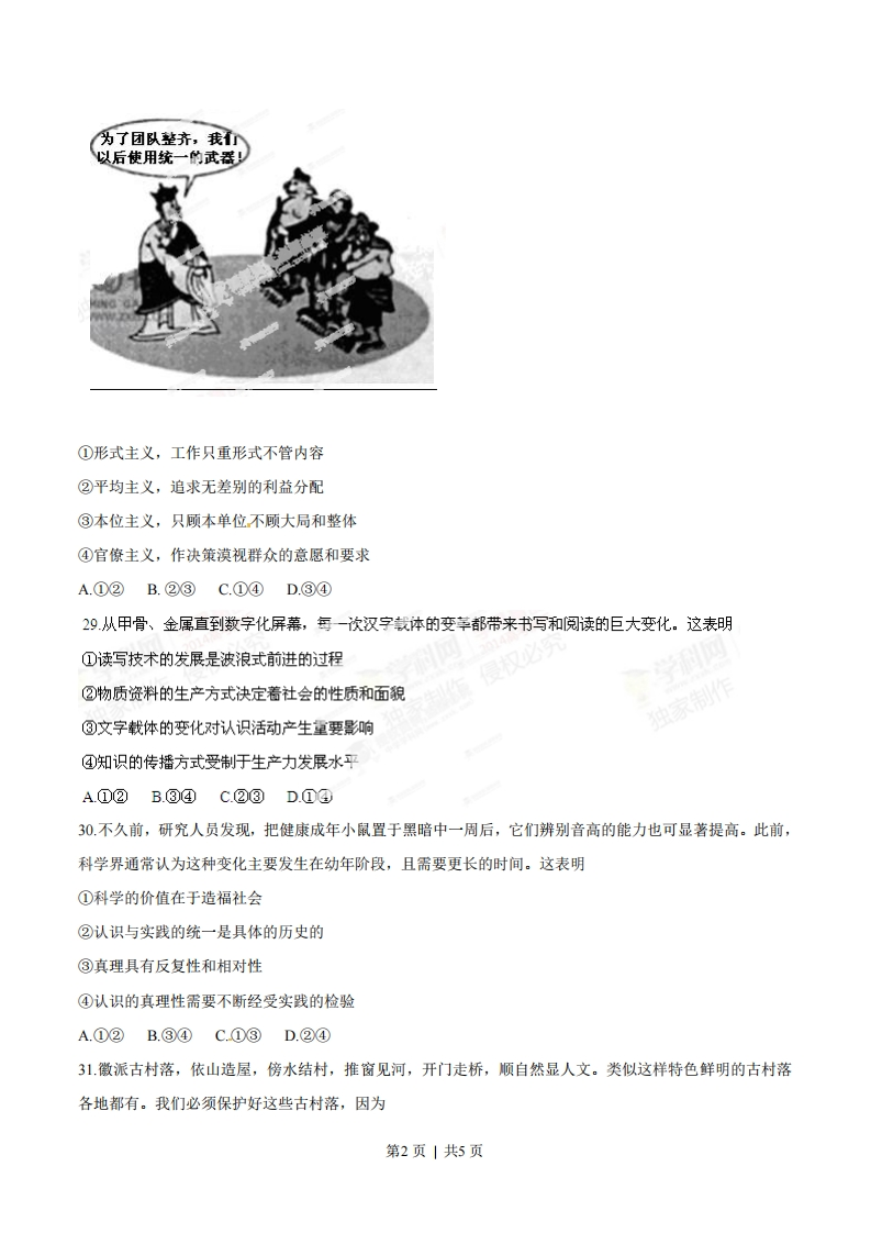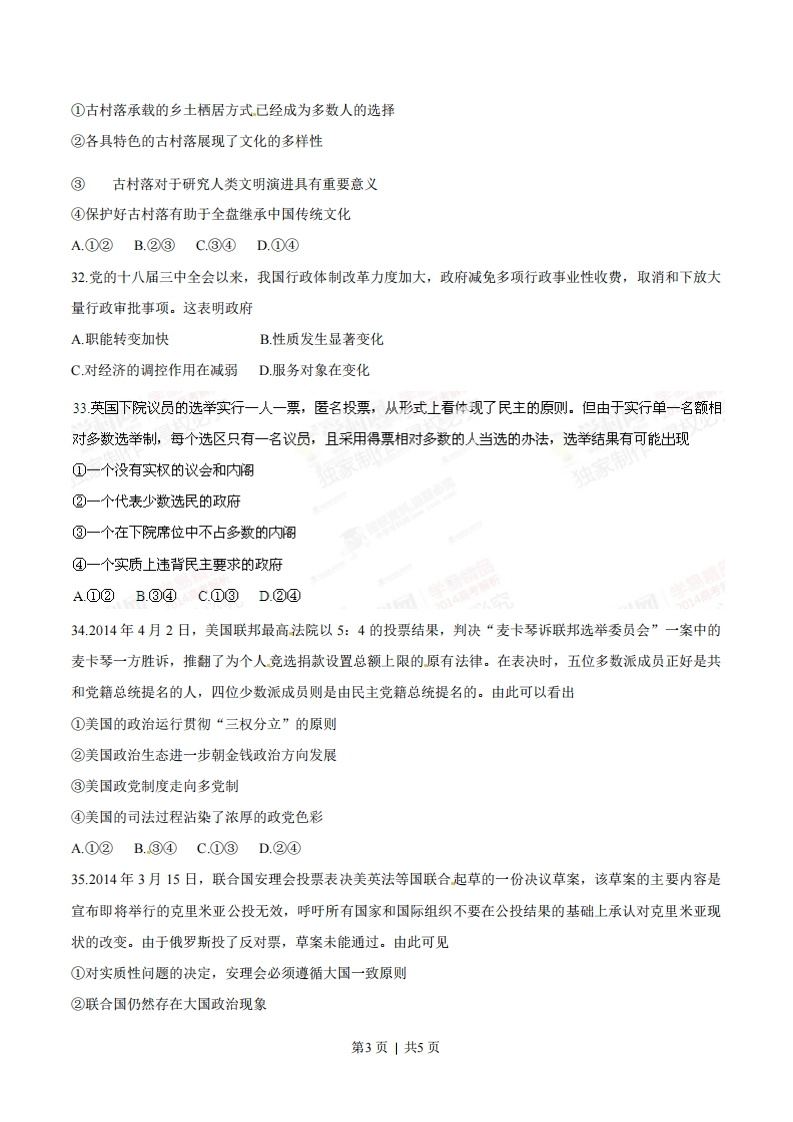2014年普通高等学校招生全国统一考试文科综合能力测试(浙江卷政治试题)24.受禽流感影响,去年活鸡和鸡蛋价格持续下降,养鸡户纷纷压缩产量。今年三月份以来,鸡蛋价格不断走高,小张作出扩大养鸡规模的决定。这表明A商品的价值总是围绕价格波动B.利益最大化是生产的根本目的C.价格与供求相互影响,相互制约D.企业生产规模越大经济效益越好25.改革开放以来,我国逐渐完善了社会主义初级阶段基本经济制度,经济持续快速发展。如2000年2012年,国有和集体工业企业资产从5.70万亿元增加到10.61万亿元,私营工业企业资产从0.39万亿元增加到15.25万亿元。这说明①我国各种所有制经济地位相同、相互促进②非公有制经济己成为我国经济的主体③应继续坚持公有制为主体,多种所有制共同发展④应毫不动摇巩固和发展公有制经济,毫不动摇鼓励、支持、引导非公有制经济发展A.①②B.③④C.①③D.②④26.2010年后,我国光代产业的产能严重过剩.这与全球光代市场需求不足和国家光伏代产业补贴政策等有关。从经济学上讲,国家光伏产业补贴政策属于A财政政策B.货币政策C税收政蔬D.价格玫策27古语云:善不积不足以成名,恶不积不足以灭身。这句话蕴涵的道理有①善与恶相互对立②善与恶在-定条件下相互转化③成名、灭身各有相应的量变前提④善、恶的积累必导致相应的质变A①②B.③④C①③D.②④28.漫画《统一武器》(作者:张吉亮)讽刺了第1页|共5页