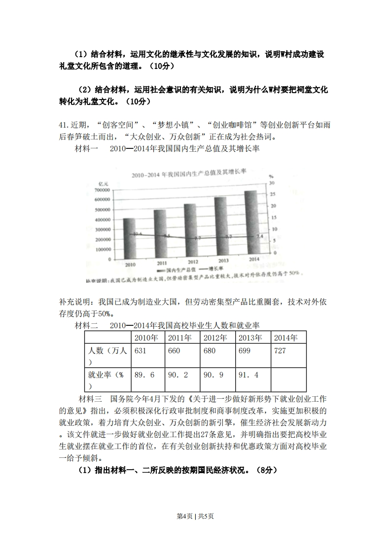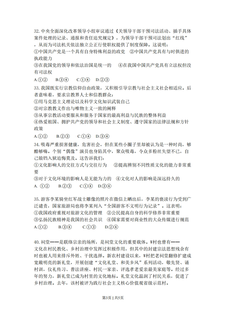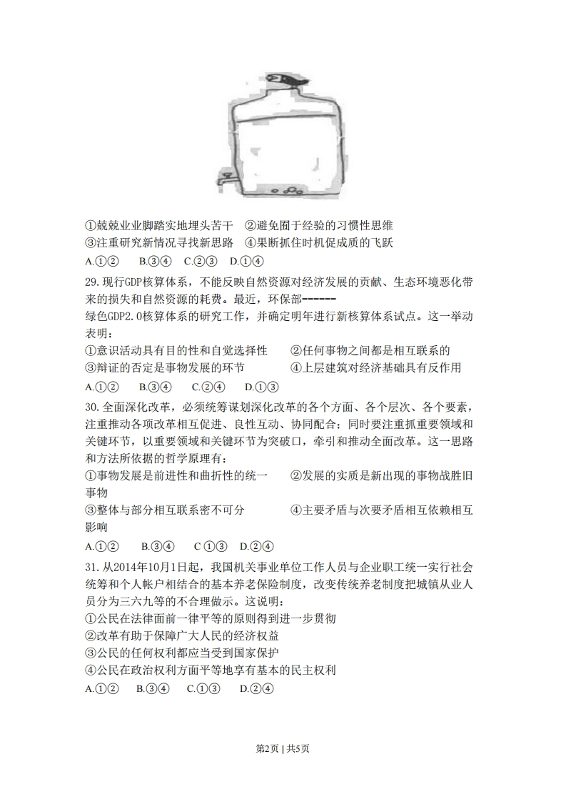 2015年高考浙江卷文综政治及参考答案24.“双十一购物狂欢节”那天,不少商家推出购500元商品返还280元购物券的活动,很多消费者为了获得购物券凑足购买500元商品。狂欢之后,一些消费者发现“凑单”购买的许多商品是自己不需要的。这些消费者的购买行为:A是求异心理引发的,不值得提倡B是攀比心理引发的,并不可取C违背了理性消费的原则D违背了适度消费的原则25.-发行将由核准制向注册制转变。实行注册制后,股票发行主要不是由政府决定,证券发行机构只对股票发行人的申报文件作形式审查,公司股票的良莠留给市场决定。这一改革:A.意味着股票投资的收益取决于企业经营状况B.符合市场在资源配置中起决定性作用的要求C.会使股票价格越来越偏离企业实际经营状况D.意味着国家对股票市场监管的削弱26.为加快从制造大国转向制造强国的进程,我国将实施“中国制造2025”规划,采取财政贴息、加速折旧等措施,推动传统产业技术改造和升级。这表明A.加快技术创新是转变经济发展方式的主攻方向B.财政政策可以促进资源合理配置C.国家通过增加财政支出来促进经济平衡运行D.货币政策成为我国经济实现创新驱动发展的重要手段27.中国的先哲认为世界由金木水火土构成。到了19世纪,人们认为世界的最基本成分就是化学元素周期表上100个左右的元素。现在人们认为最基本的是夸克、电子等。由此可见:①唯物主义的观念由来已久②具体认识会在发展中不断被超越③趔的价值要到实践中才能实现④认识的目的归根到底是改造世界A.①②B.③④C.①③D.②④28.漫画《乌鸦喝水》(作者薛宏)提醒我们,做工作办事情要:第1页|共5页