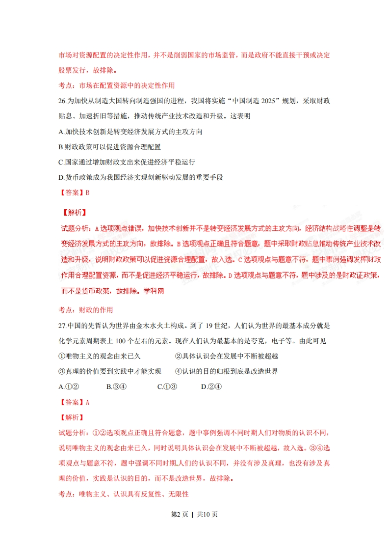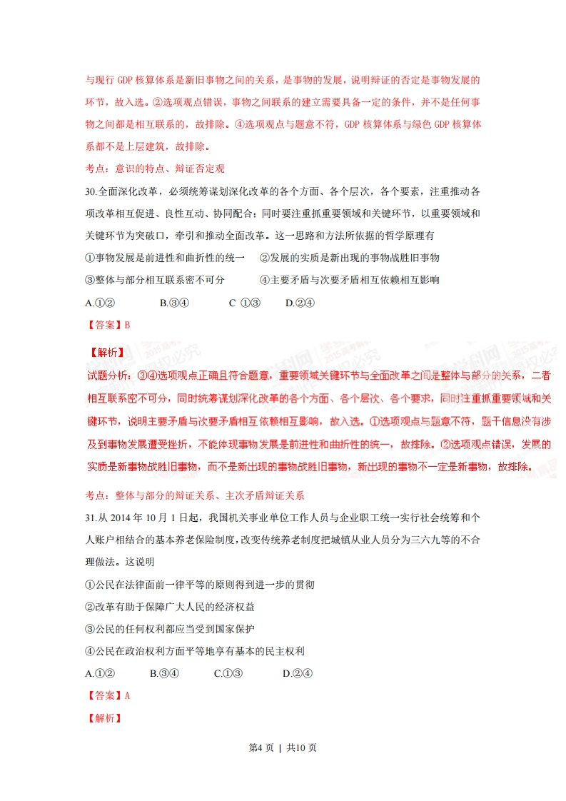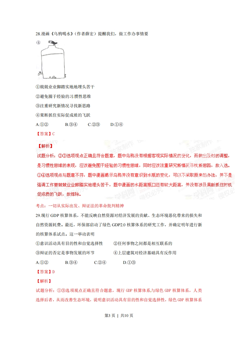 2015年高考浙江省文综政治24.“双十一购物狂欢节”那天,不少商家推出购500元商品返还280元购物券的活动,很多消费者为了获得购物券而凑足购买500元的商品。狂欢之后,一些消费者发现“凑单”购买的许多商品是自己不需要的。这些消费者的购买行为A是求异心理引发的,不值得提倡B.是攀比心理引发的,并不可取C违背了理性消费的原则D.违背了适度消费的原则【答案】C【解析】试题分析:A选项观点与题意不符,题中为了获得购物券而购买许多自己不需要的商品,并不是求异心理而引发的消费,故排除。B选项观点与题意不符,题中是为了获得购物券而购买商品,并不是受到周围人的影响,不是攀比心理引发的消费,故排除。℃选项观点正确且符合题意,消费者在进行消费的时候,应该避免盲从,理性消费,题中行为违背了理性消费的原则,故入选。D选项观点与题意不符,题目事例并没有涉及消费超出了自己的收入水平,故排除。学科网考点:树立正确的消费观25我国股票发行将由核准制向注册制转变。实行注册之后,股票发行主要不是由政府决定,证券机构只对股票发行人的申报文件作形式审查,公司股票的良莠留给市场决定。这一改革A意味着股票投资的收益取决于企业经营状况B.符合市场在资源配置中起决定性作用的要求C.会使股票价格越来越偏离企业实际经营状况D.意味着国家对股票市场监管的削弱【答案】B【解析】试题分析:A选项观点错误,股票投资的收益受到企业经营状况的影响,而不是取决于企业经营状况,故排除。B选项观点正确且符合题意,题中强调公司股票的良莠留给市场决定,说明改革符合市场在资源配置中起决定性作用的要求,故入选。C选项观点错误,题中改革并不会使股票价格越来越偏离企业实际经营状况,故排除。D选项观点错误,题中强调发挥第1页|共10页