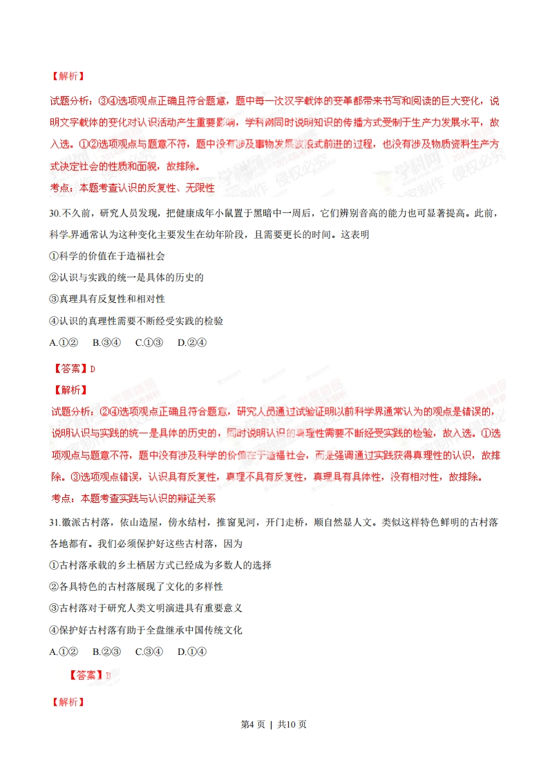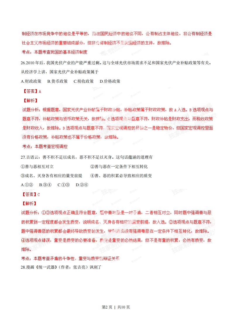 2014年普通高等学校招生全国统一考试文科综合能力测试(浙江卷政治试题)24.受禽流感影响,去年活鸡和鸡蛋价格持续下降,养鸡户纷纷压缩产量。今年三月份以来,鸡蛋价格不断走高,小张作出扩大养鸡规模的决定。这表明A商品的价值总是围绕价格波动B.利益最大化是生产的根本目的C.价格与供求相互影响,相互制约D.企业生产规模越大经济效益越好【答案】c【解析】试题分析:根据题意,题中离流感影响供求关系,进而影响商品价格:同时价格的高低影响生产者生产规模的调整,说明价格与供求相互影响,相互制灼,故C入选。A选项观点错误,商品的价格总是围绕价值波动,而不是价值围绕价格波动,故排除。B选项观点与题意不符,题中没有强调生产的目的,而是强调供求与价格之间的相互影响关系,故排除。D选项视点错误,生产规模的大小要根据市场而定,而不是越大越好,故排除。。考点:本题考查影响价格的因素、价格变动的影响25.改革开放以来,我国逐渐完善了社会主义初级阶段基本经济制度,经济持续快速发展。如2000年2012年,国有和集体工业企业资产从5.70万亿元增加到10.61万亿元,私营工业企业资产从0.39万亿元增加到15.25万亿元。这说明①我国各种所有制经济地位相同、相互促进②非公有制经济己成为我国经济的主体③应继续坚持公有制为主体,多种所有制共同发展④应毫不动摇巩固和发展公有制经济,毫不动摇鼓励、支持、引导非公有制经济发展A.①②B.③④.C.①③D.②④【答案】B【解析】试题分析:③④选项观点正确且符合题意,题中强调我国坚持和完善社会主义初级阶段基本经济制度,经济持续快速发展,说明应该继续坚持公有制为主体,多种所有制共同发展,同时应该毫不动挥巩固和发展公有制经济,毫不动摇鼓励、支持、引导非公有制经济发展,故入选。①②选项观点错误,我国各种所有第1页|共10页