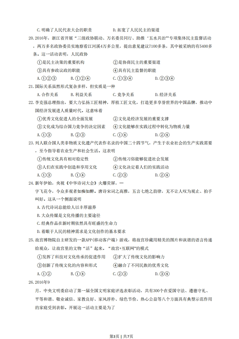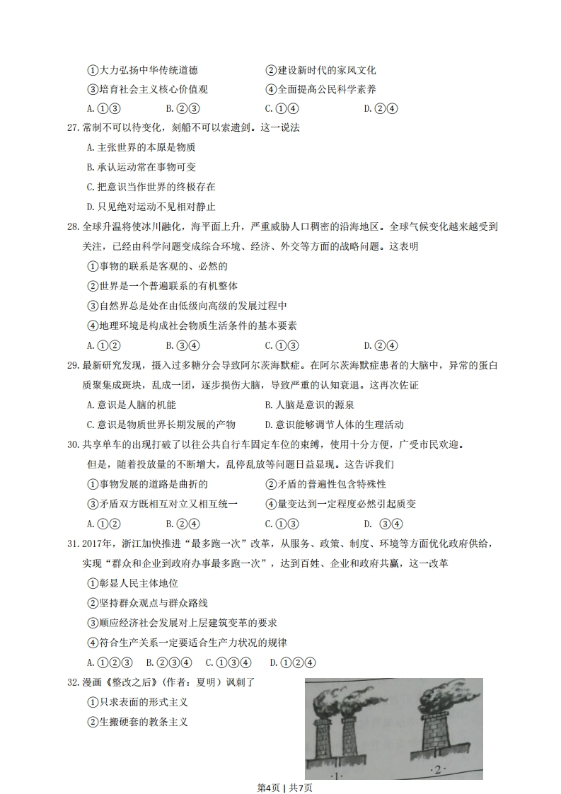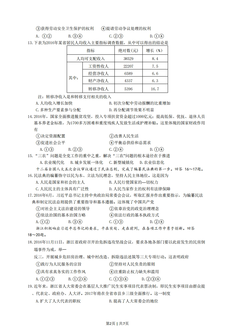 绝密★考试结束前2017年4月浙江省普通高校招生选考科目考试思想政治试题本试题卷分选择题和非选择题两部分,共6页,满分100分,考试时间90分钟。其中加试题部分为30分,用【加试题】标出。考生注意:1.答题前,请务必将自己的姓名、准考证号用黑色字迹的签字笔或钢笔分剐填写在试题卷和答题纸规定的位置上。2.答题时,请按照答题纸上“注意事项”的要求,在答题纸相应的位置上规范作答,在本试题卷上的作答一律无效。选择题部分一、判断题(本大题共10小题,每小题1分,共10分。判断下列说法是否正确,正确的请将答题纸相应愿号后的T涂黑,错误的请将答题纸相应题号后的涂黑)1.表现其他一切商品的价值是货币特有的职能。2.小明爸爸的公司采用“机器换人”后,生产效率提高,但单位商品的价值量不变。3.小明妈妈决定买国债,因为与金融债券、企业债券相比,国债更安全、利率也更高。4.在我国,国家与公民个人的利益根本一致,国家尊重和保障公民个人的各种利益。5.人民政府必须时刻把民生放在心头、扛在肩上,切实履行社会建设职能。6.文化包容性是指在文化交流中吸收、借鉴其他民族文化的积极成分。7.继承和创新中华民族优秀历史文化,必须坚持中国特色社会主义文化发展道路。8.哲学与具体科学的关系是整体与部分的关系。9.凡是实践,都是以人为主体、以客观事物为对象的物质性活动。10.现阶段,不尊重知识与人才的观念仍然存在,并影响着经济社会发展。这表明社会意识具有相对独立性。二、选择题1(本大题共22小题,每小题2分,共44分。每小题列出的四个备选项中只有一个是符合题目要求的,不选、多选、错选均不得分)11.随着二孩政策的落实,劳动力市场上月嫂的工资迅速上涨,月薪达到近万甚至几万元。这表明A.价值增加,价格上涨B.价格上涨,需求减少C.供不应求,价格上涨D.价格上涨,供给增加12.某公司拖欠68名员工共计55万元的劳动报酬,员工因此向当地人力资源和社会保障局举报,并在后者的干预下,从公司领到了被拖欠的全部劳动报酬。由此可见,劳动者享有①取得劳动报酬的权利②休息休假的权利第1页1共7页