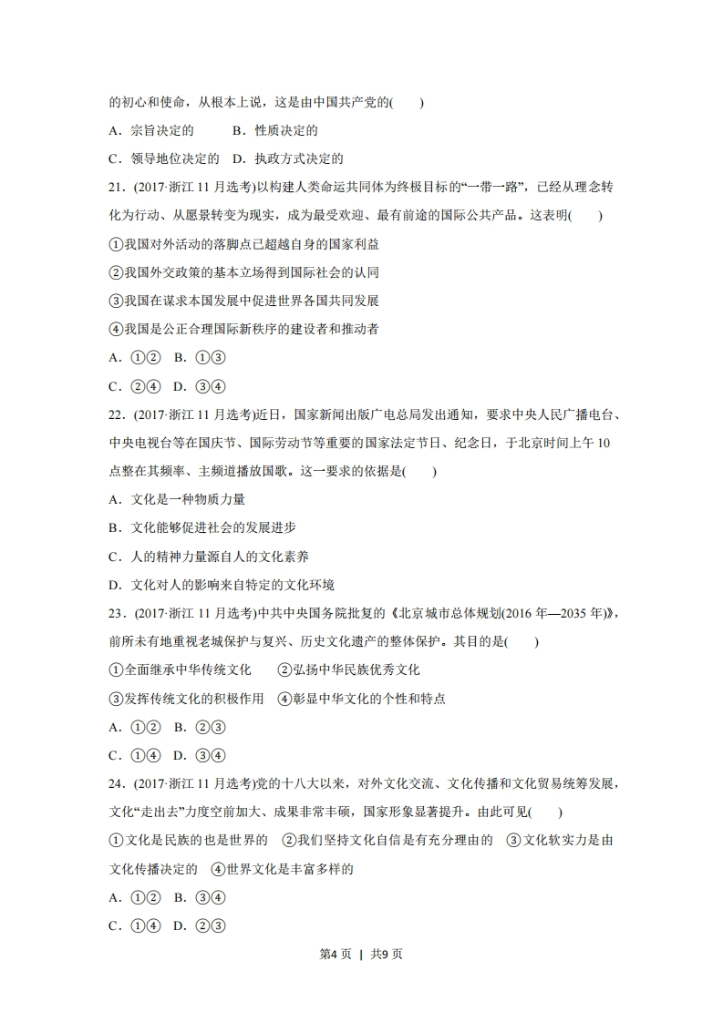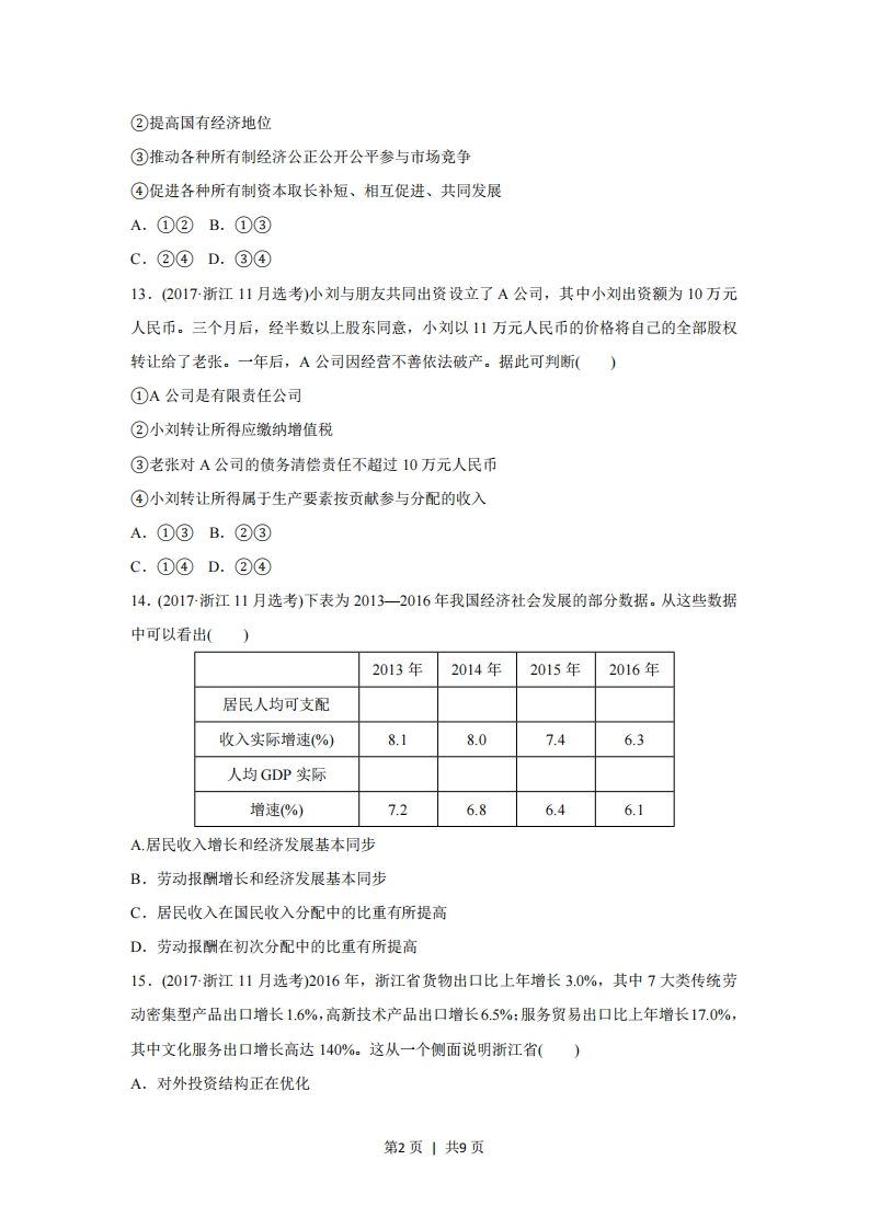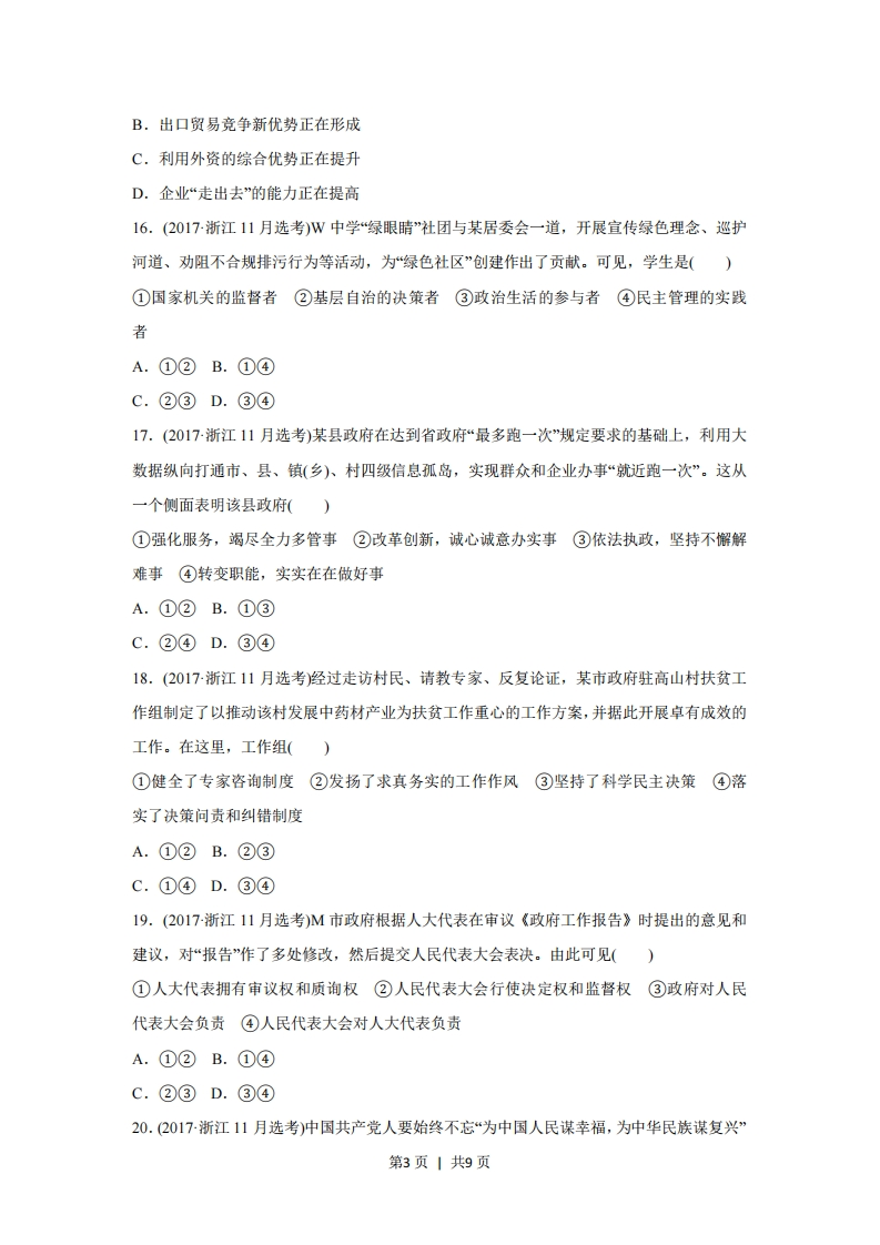 2017年11月浙江省普通高校招生选考科目考试试题一、判断题(本大题共10小题,每小题1分,共10分。判断下列说法是否正确,正确的请将答题纸相应题号后的T涂黑,错误的请将答题纸相应题号后的F涂黑)1.(2017-浙江11月选考)如果纸币的发行量超过流通中所需要的货币量,就会引起物价上涨。()2.(2017浙江11月选考)小明上书店购书,这属于社会再生产过程的交换环节。()3.(2017-浙江11月选考)国家合理的分配政策对财政收入的影响是基础性的。()4.(2017浙江11月选考)对每一个公民来说,他所享有的权利,同时也是他应履行的义务。()5.(2017浙江11月选考)当今世界,主权国家和国际组织都是国际社会的主要成员。()6.(2017浙江11月选考)对待其他民族的文化成果,应以吸收为主、为我所用。()7.(2017浙江11月选考)汉字的发明,标志着人类进入文明时代,使人类文明得以传承()8.(2017浙江11月选考)有人说哲学研究人生问题,有人说哲学研究认识问题,其实哲学只研究思维与存在的关系。()9.(2017浙江11月选考)生物的反应形式是人类意识产生的前提。()10.(2017浙江11月选考)学习国学经典不能拘泥于原著,这符合辩证否定观的要求。()二、选择题I(本大题共22小题,每小题2分,共44分。每小题列出的四个备选项中只有一个是符合题目要求的,不选、多选、错选均不得分)11.(2017浙江11月选考)自2017年9月1日起,中国三大基础电讯运营商取消国内手机异地漫游通话费和长途通话费(即:国内长途通话与市内通话同价)。如不考虑其他因素,根据这一变化,下列判断正确的是()A.固定电话用户数会增加B.手机用户数会减少C.手机用户异地通话、长途通话次数会增加D.固定电话用户长途通话次数会增加12.(2017浙江11月选考)杭绍台城际高铁项目,由数家私有资本控股企业、中国铁路总公司、浙江省交通集团和地方政府共同出资建设。这种投资模式将()①改变非公有制经济的性质第1页1共9页