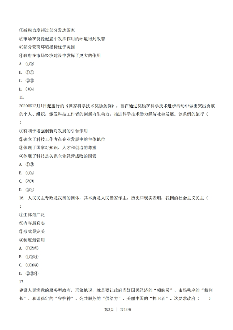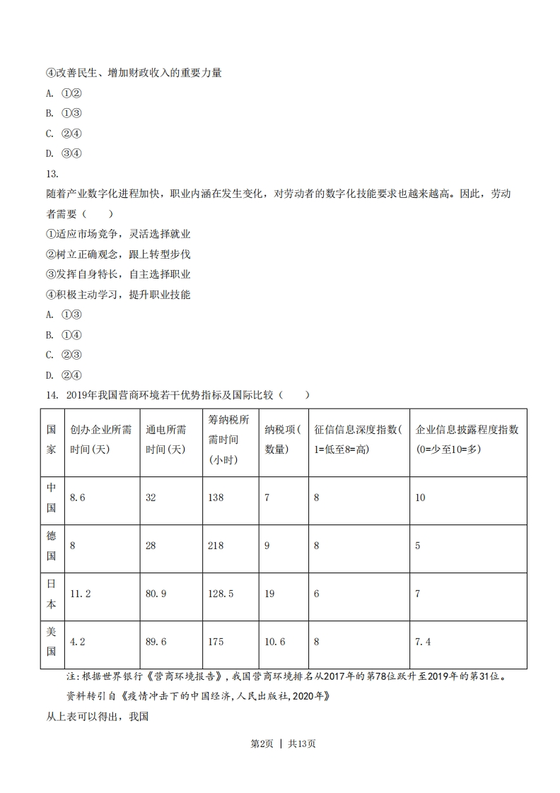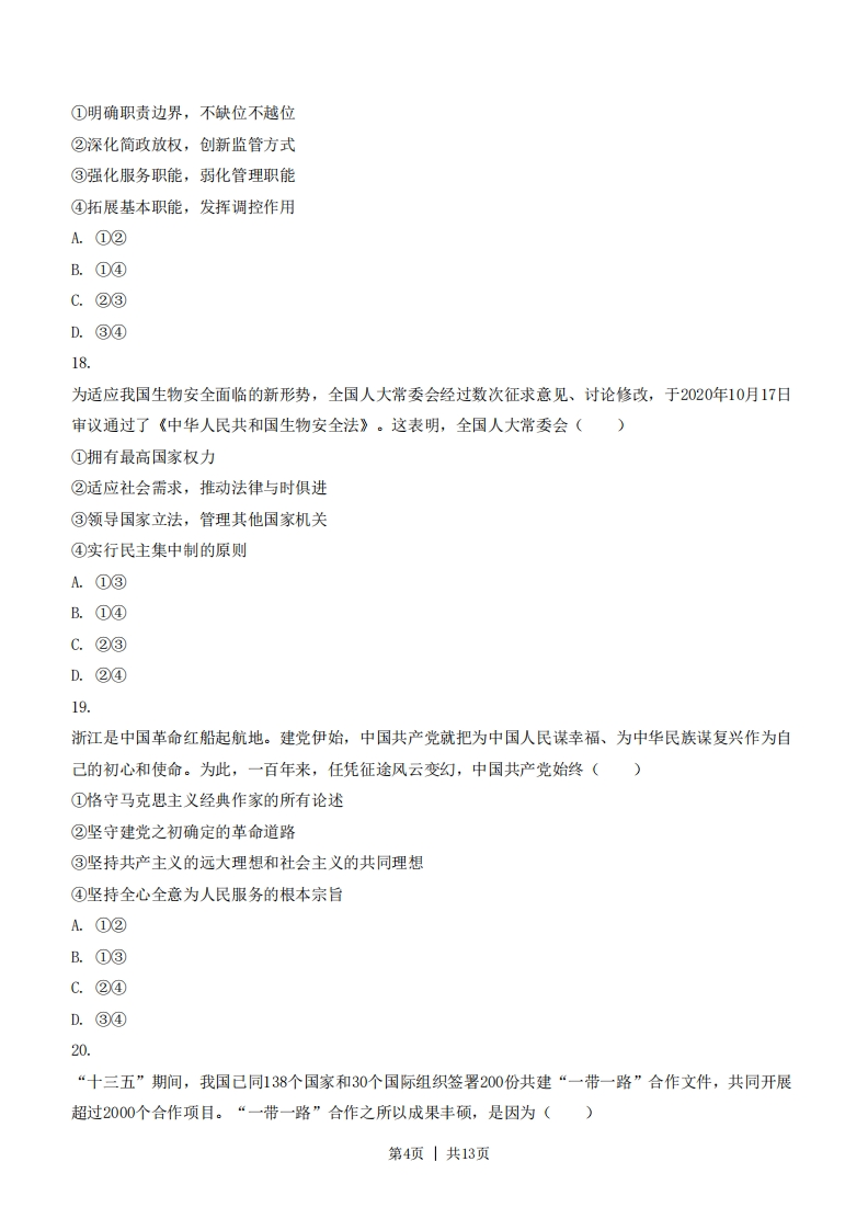 2021年浙江省选考政治试题一、判断题(本大题共10小题,每小题1分,共10分。判断下列说法是否正确,正确的请将答题纸相应题号后的正确涂黑,错误的请将答题纸相应题号后的错误涂黑)1.商场里各种商品的价格高低不等,首先是因为它们所包含的价值量不同。2.总体而言,经济全球化符合经济规律,符合各方利益。3.作为基层政权的村民自治组织,在乡村治理中发挥着重要作用。(4.“两会”期间,政协委员和人大代表都享有对《政府工作报告》的审议权。(5.贯彻总体国家安全观,必须坚持底线思维,守住自然生态安全边界。(6.徜徉于祖国名山大川,家国情怀油然而生,可见自然山川也是文化。(7.流行与经典是相通的,今天的流行文化就是明天的经典文化。(8.“网红”“明星”有广泛的道德示范作用,因此人们往往对他们有更高的要求。(9.哲学史上的两个基本派别是辩证法和形而上学。(10.从神话嫦娥奔月到“嫦娥五号”携月壤归来,人的认识能力发生了质的飞跃。(二、选释题1(本大题共22小题,每小题2分,共44分。每小题列出的四个备选项中只有一个是符合题目要求的,不选、多选、错选均不得分)11.2020年11月5日起,中国人民银行发行第五套人民币的5元面值纸币。关于纸币,正确的说法是()①国家有权发行并强制使用纸币②纸币执行流通手职能③增加纸币的供应量就会导致通货膨胀④纸币的流通速度加快,其购买力就会增强A.①②B.①④C.②③D.③④12.早在2018年11月,习近平总书记就指出,民营经济贡献了50%以上的税收、60%以上的国内生产总值、70%以上的技术创新成果、80%以上的城镇劳动就业和90%以上的企业数量。从上述“五六七八九”中可以看出,我国民营经济是()①社会主义市场经济体制的根基②推动经济增长、社会发展的重要力量③增强国力、支持科技进步的关键力量第1页|共13页