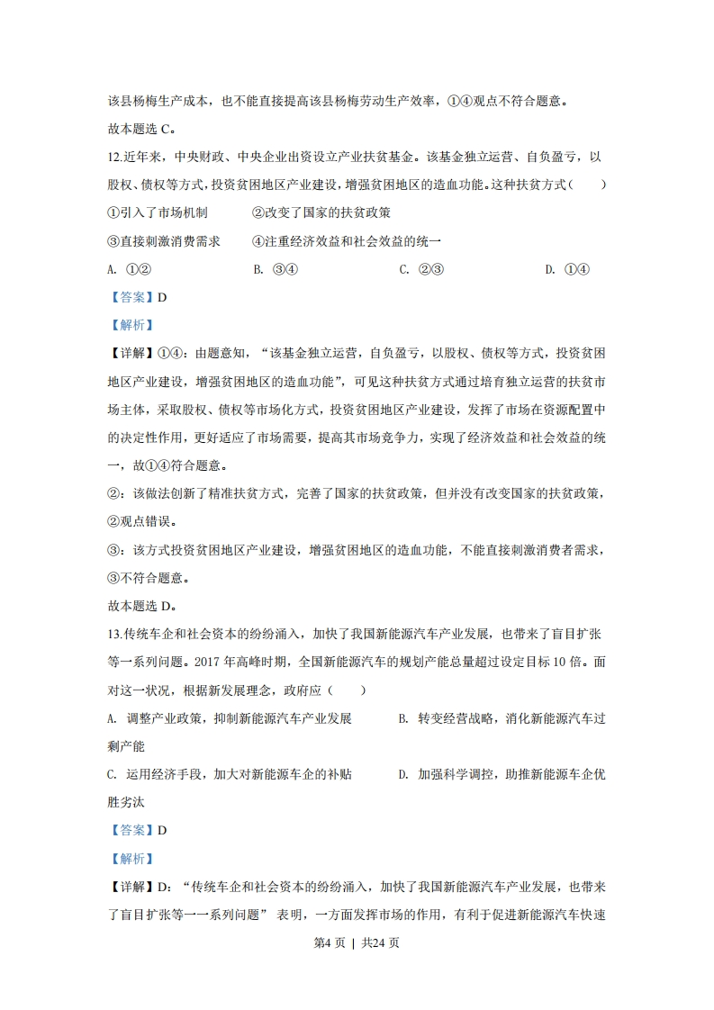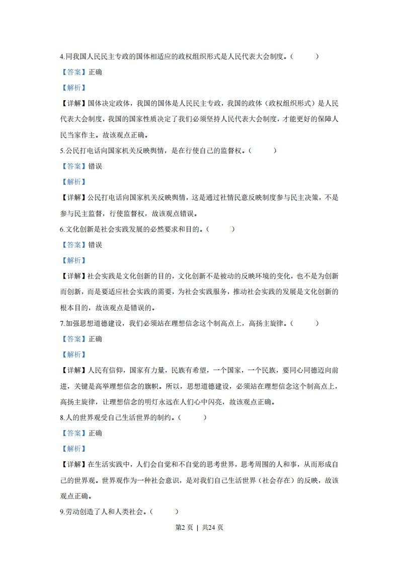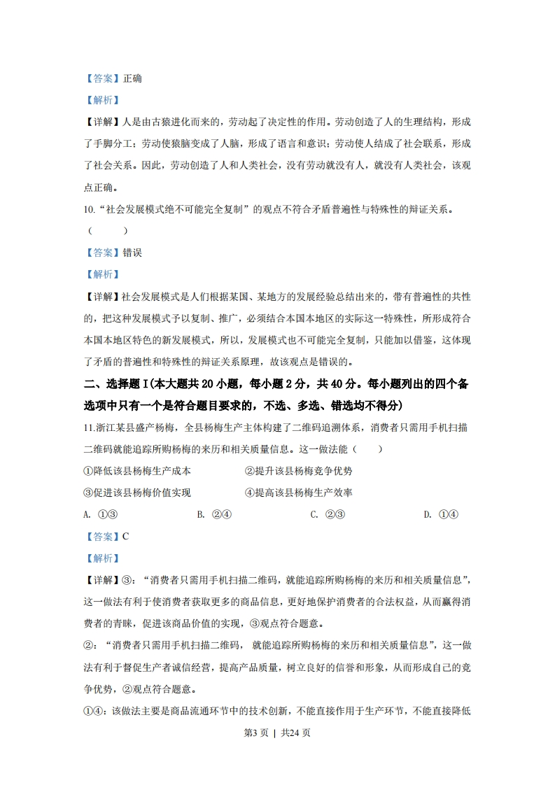 2020年全国统一高考政治试题(浙江卷)一、判断题(本大题共10小题,每小题1分,共10分。判断下列说法是否正确,正确的请将答题纸相应题号后的正确涂黑,错误的请将答题纸相应题号后的错误涂黑)1.若其他因素不变,单位商品的价值量随着生产该商品的社会劳动生产率的提高而增大。)【答案】错误【解析】【详解】单位商品的价值量是由生产该商品所耗费的社会必要劳动时间决定的,若其他因素不变,单位商品的价值量与社会劳动生产率成反比,所以随着生产该商品的社会劳动生产率的提高,生产该商品所耗费的社会必要劳动时间减少,单位商品的价值量减小,故该观点错误。2通货膨胀有时可以带来生产规模的扩大和就业的增加。(【答案】正确【解析】【详解】通货膨胀的实质是总需求大于总供给,从短期内来看,由于通货膨胀时需求旺盛,企业会扩大生产规模,导致企业用工增加,增加了就业。故该观点正确。3要解决我国新时代的社会主要矛盾,须优先解决发展不平衡问题。(【答案】错误【解析】【详解】新时代我国社会的主要矛盾是人民日益增长的美好生活需要与发展的不平衡不充分之间的矛盾。发展的不平衡主要是城乡发展不平衡、区域发展不平衡、收入分配不平衡、产业结构、要素投入结构、排放结构、经济增长动力结构等方面。发展不充分主要是质量和效益、创新能力、实体经济、生态环境、民生、脱贫、就业、教育、医疗、居住、养老、社会文明、依法治国、国家治理、国家安全、党的建设等方面所存在的不足,就是发展不充分的具体表现。可见发展的不平衡不充分是制约我国经济社会发展的两个主要方面,二者相互联系,相互制约,要解决我国新时代的社会主义矛盾,必须贯彻新发展理念,着力解决发展不平衡不充分的问题,不能说谁优先谁在后,这会导致工作中的严重的错误,故该观点错误。第1页|共24页