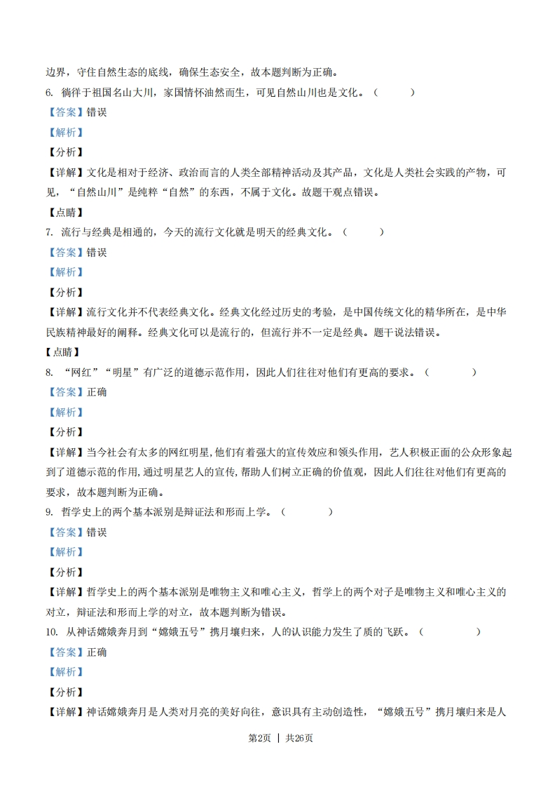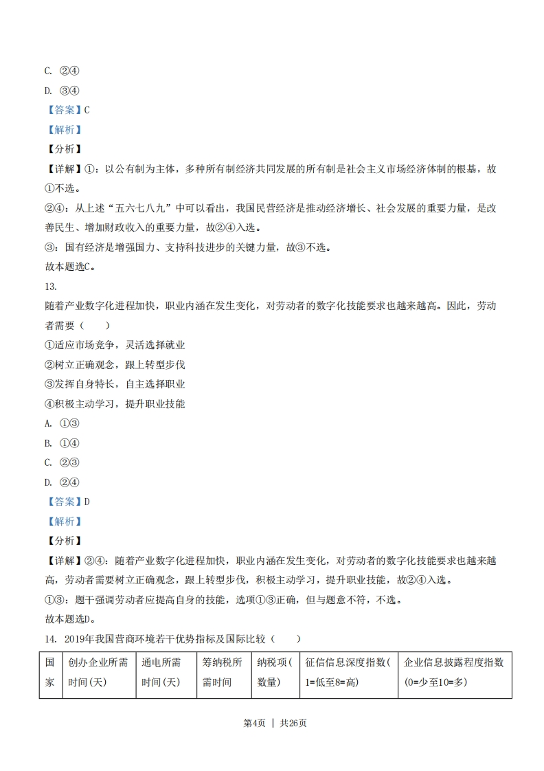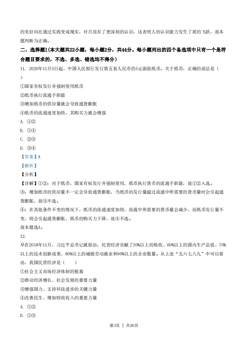 2021年浙江省选考政治试题一、判断题(本大题共10小题,每小题1分,共10分。判断下列说法是否正确,正确的请将答题纸相应题号后的正确涂黑,错误的请将答题纸相应题号后的错误涂黑)1.商场里各种商品的价格高低不等,首先是因为它们所包含的价值量不同。【答案】正确【解析】【分析】【详解】本题考查价值与价格的关系。价值决定价格,价值量大价格就高,价值量小价格就低,因此,商场里各种商品的价格高低不等,首先是因为它们所包含的价值量不同。故题中观点正确。【点晴】价格影响供求,价格上涨时,供给增加而需求减少,价格下降时,供给减少而需求增加。价值决定价格,价值量大价格就高,价值量小价格就低。价格是价值的货币表现,价值是价格的基础2.总体而言,经济全球化符合经济规律,符合各方利益。【答案】正确【解析】【分析】【详解】总体而言,经济全球化符合经济规律,是大势所趋,任何国家都不能置身经济全球化之外,符合各方利益。故本题判断为正确。3.作为基层政权的村民自治组织,在乡村治理中发挥着重要作用。(【答案】错误【解析】【分析】【详解】村民委员会、居民委员会是村民、居民自我管理、自我教育、自我服务的基层群众自治组织。它不是政权组织,也不是基层政权的派出机构,不具有国家机关性质,故题目观点错误。4.“两会”期间,政协委员和人大代表都享有对《政府工作报告》的审议权。(【答案】错误【解析】【分析】【详解】人大代表有审议权,政协委员没有审议权,故本题判断为错误。5.贯彻总体国家安全观,必须坚持底线思维,守住自然生态安全边界。(【答案】正确【解析】【分析】【详解】坚持贯彻总体国家安全观,着力防范和化解重大风险,必须坚持底线思维,守住自然生态安全第1页|共26页