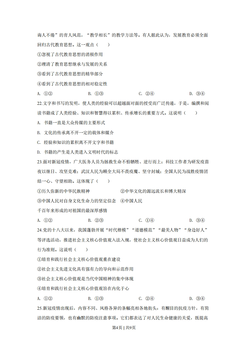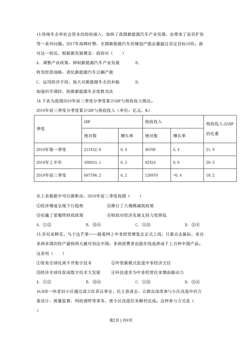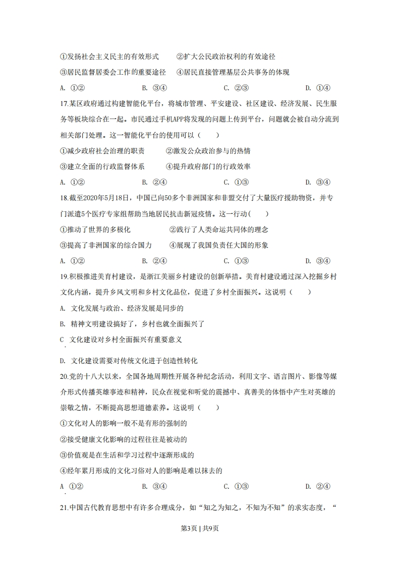 2020年全国统一高考政治试题(浙江卷)一、判断题(本大题共10小题,每小题1分,共10分。判断下列说法是否正确,正确的请将答题纸相应题号后的正确涂黑,错误的请将答题纸相应题号后的错误涂黑)1若其他因素不变,单位商品的价值量随着生产该商品的社会劳动生产率的提高而增大。()2.通货膨胀有时可以带来生产规模的扩大和就业的增加。(3要解决我国新时代的社会主要矛盾,须优先解决发展不平衡问题。(4同我国人民民主专政的国体相适应的政权组织形式是人民代表大会制度。(5.公民打电话向国家机关反映舆情,是在行使自己的监督权。(6.文化创新是社会实践发展的必然要求和目的。(7加强思想道德建设,我们必须站在理想信念这个制高点上,高扬主旋律。(8.人的世界观受自己生活世界的制约。()9.劳动创造了人和人类社会。(10.“社会发展模式绝不可能完全复制”的观点不符合矛盾普遍性与特殊性的辩证关系。(二、选择题I(本大题共20小题,每小题2分,共40分。每小题列出的四个备选项中只有一个是符合题目要求的,不选、多选、错选均不得分)11浙江某县盛产杨梅,全县杨梅生产主体构建了二维码追溯体系,消费者只需用手机扫描二维码就能追踪所购杨梅的来历和相关质量信息。这一做法能(①降低该县杨梅生产成本②提升该县杨梅竞争优势③促进该县杨梅价值实现④提高该县杨梅生产效率A.①③B.②④C.②③D.①④12.近年来,中央财政、中央企业出资设立产业扶贫基金。该基金独立运营、自负盈亏,以股权、债权等方式,投资贫困地区产业建设,增强贫困地区的造血功能。这种扶贫方式(①引入了市场机制②改变了国家的扶贫政策③直接刺激消费需求④注重经济效益和社会效益的统一A.①②B.③④C.②③D.①④第1页|共9页