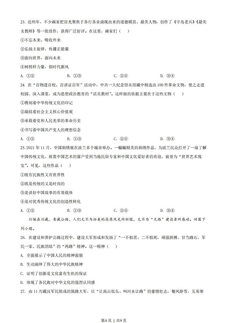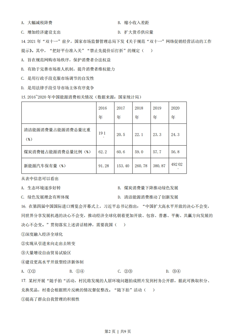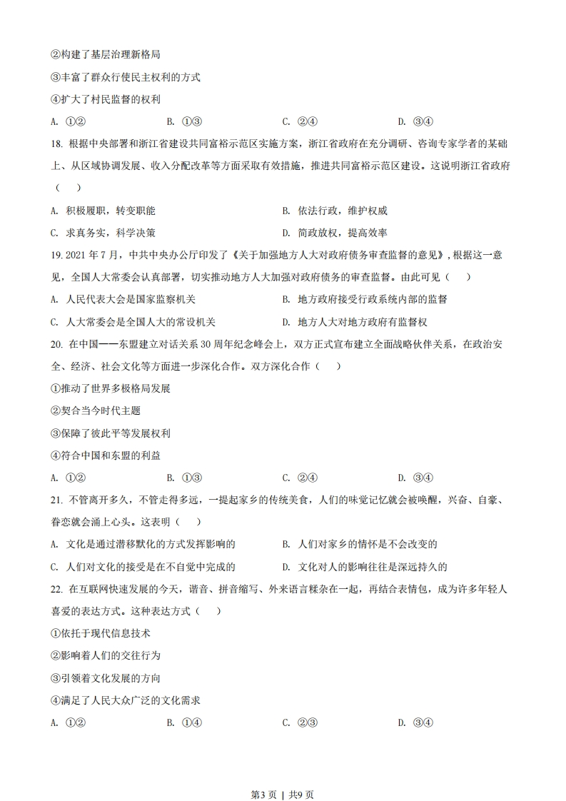 2022年1月浙江省普通高校招生选考科目考试思想政治学科一、判断题1.“质优不一定价高”,这说明商品的使用价值与价值没有必然联系。(2.国家推动基层医院提升医疗服务能力,契合人民美好生活的需要。()3.选民的文化水平和政治参与能力不会影响选举的效果。()4.民族的团结、民族的凝聚力。是衡量一个国家综合国力的重要标志。()5.某些”网红打卡地”终因缺乏文化内涵而沉寂,可见文化是经济的基础。(6.中华文化一脉相传的见证是我国规模宏大的史书典籍。()7.我国航天员进行太空授课并向全球直播,播撒了科学种子,彰显了文化自信。()8.“近水知鱼性,近山识鸟音”说明实践可以锻炼和提高人的认识能力。()9.“静是动的主宰,动必反归于静”属于辩证法的观点。(10.我们生活中所遵循的道德准则归根结底都是社会经济状况的反映。()二、选择题I11.长期以来,包头钢铁(集团)有限责任公司、中国航天科技集团有限公司等国有企业积极参与“长征”系列运载火箭工程、中国探月工程。近年来,它们又响应中央号召,制定了“碳达峰、碳中和”目标。这些国有企业的上述做法()①提高了管理水平②促进了科技进步③强化了风险意识④服务了国家战略A.①③B.①④C.②③D.②④12.如果把社会财富比作一个蛋糕,“做大蛋糕”和“分好蛋糕”就形象地表达了()①生产与分配的关系②生产与消费的关系③投人与产出的关系④发展与共享的关系A.①③B.①④C.②③D.②④13.某国2021年受新冠疫情影响,经济萎缩,物价上涨。要使2022年的GDP恢复至疫情前水平、物价下降,该国可以采取的兼具恢复经济和降低物价作用的措施是()第1页」共9页