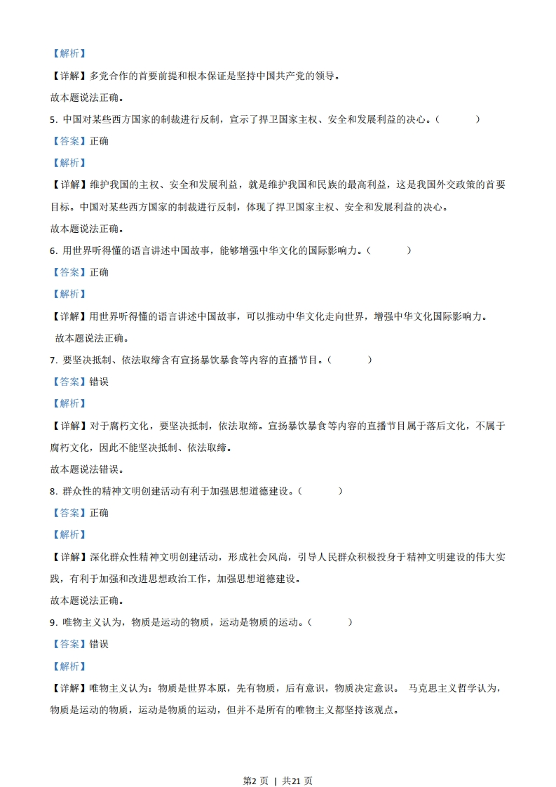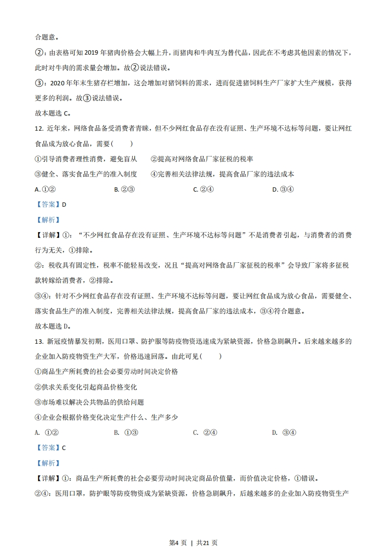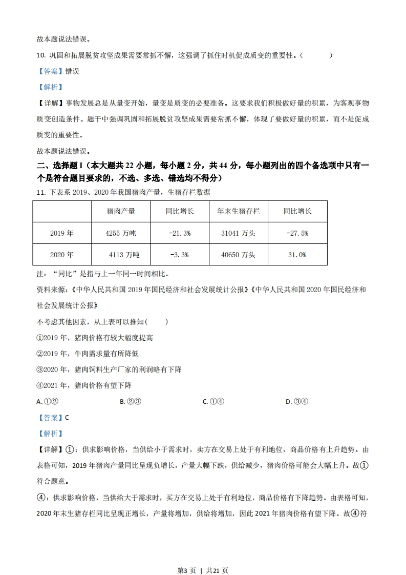 绝密★启用前2021年6月浙江省普通高校招生选考科目考试思想政治试题姓名:准考证号:本试卷分选择题和非选择题两部分,共6页,满分100分,考试时间90分钟。考生注意:1.考生答题前,务必将自已的姓名、准考证号用黑色字迹的签字笔或钢笔填写在答题纸上。2.选择题的答案须用2B铅笔将答题纸上对应题目的答案标号涂黑,如要改动,须将原填涂处用橡皮擦净。3.非选择题的答案须用黑色字迹的签字笔或钢笔写在答题纸上相应区域内,作图时可先使用2B铅笔,确定后须用黑色字迹的签字笔或钢笔描黑,答案写在本试卷上无效。一、判断题(本大题共10小题,每小题1分,共10分。判断下列说法是否正确,正确的请将答题纸相应题号后的正确涂黑,错误的请将答题纸相应题号后的错误涂黑)1.为别人生产的劳动产品是商品。(【答案】错误【解析】【详解】商品是用于交换的劳动产品。“为别人生产的劳动产品”不一定用于交换,故不一定是商品。故本题说法错误。2.经济过热时,实施紧缩性财政政策有助于抑制总需求、稳定物价。(【答案】正确【解析】【详解】经济过热时,社会总需求大于社会总供给,此时物价上涨,应实施紧缩性财政政策,减少财政支出、提高税率、增加税收等,这有利于抑制总需求,稳定物价。故本题说法正确。3.差额选举有助于选民了解候选人,有助于充分考虑当选者结构的合理性。(【答案】错误【解析】【详解】等额选举可以比较充分地考虑当选者结构的合理性,差额选举在候选人之间形成竞争,为选民提供了选择的余地。故本题说法错误。4.坚持中国共产党的领导是多党合作的根本保证。(【答案】正确第1页1共21页