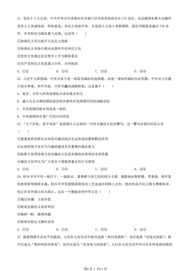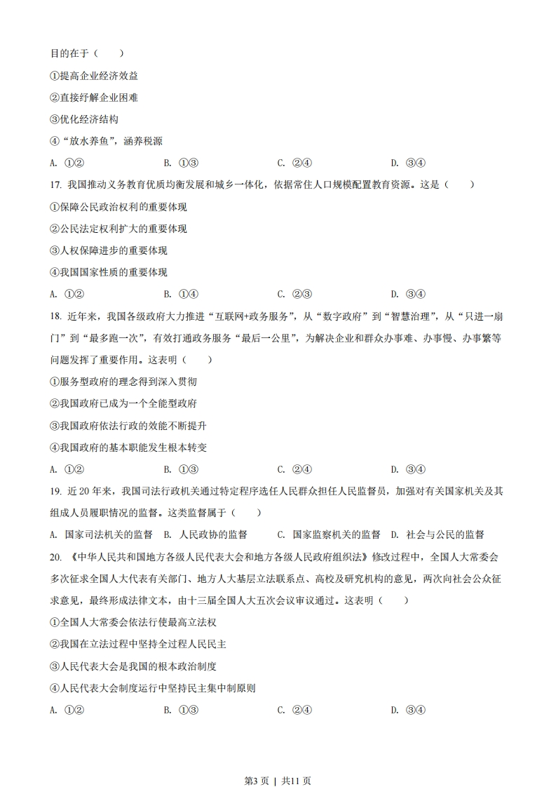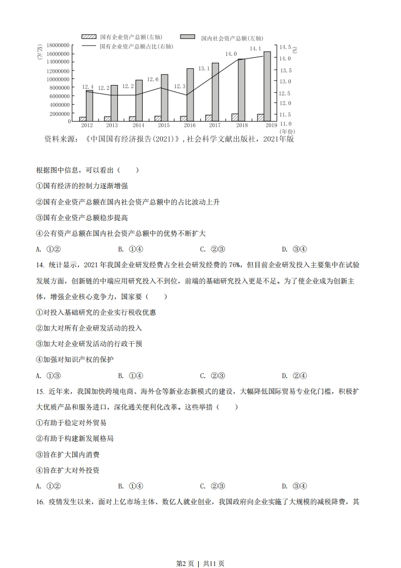2022年6月浙江省普通高校招生选考科目思想政治试题一、判断题(本大题共10小题,每小题1分,共10分。判断下列说法是否正确,正确的请将答题纸相应题号后的T涂黑,错误的请将答题纸相应题号后的F涂黑)1.小明用数字人民币购买了“冰墩墩”玩偶,数字人民币执行了流通手段职能。(2.发展慈善等社会公益事业有助于推动浙江共同富裕示范区建设。(3.街道办事处和居民委员会作为基层群众性自治组织,在疫情防控中发挥着重要作用。(4.维护国家统一和民族团结是我国生存发展的政治基石。()5.中国特色社会主义制度的最大优势是中国共产党领导。()6.网络流行语作为一种文化现象是经济社会的集中表现。()7.国产电影《长津湖》受欢迎的重要原因在于其坚持以人民为中心的创作导向。()8.一般说来,一个人的世界观影响其做事做人的方式方法。()9.个性是被共性包含的个性。()10.在某些时候,社会提供的客观条件并非是人们实现人生价值的前提。(二、选释题工(本大题共22小题,每小题2分,共44分。每小题列出的四个备选项中只有一个是符合题目要求的,不选、多选、错选均不得分)11.2022年4月,国际原油价格相较于2021年每桶上涨了几十美元。此时,生产者将会()A.扩大生产规模B.压缩生产规模C.维持原有生产规模D.视获利情况而定生产规模12.近两年我国居民人均可支配收入平均实际增长5.1%,增速比疫情前的2019年放缓0.7%,居民的消费能力、消费意愿有所减弱。为了防止消费增速持续放缓,国家应()①进一步鼓励企业扩大投资②鼓励居民将线上消费作为主要消费方式③出台更多刺激消费的政策④多渠道增加居民收入A.①②B.①③C.②④D.③④13.下图为2012-2019年国有企业资产总额占国内社会资产总额的比例变化情况。第1页」共11页