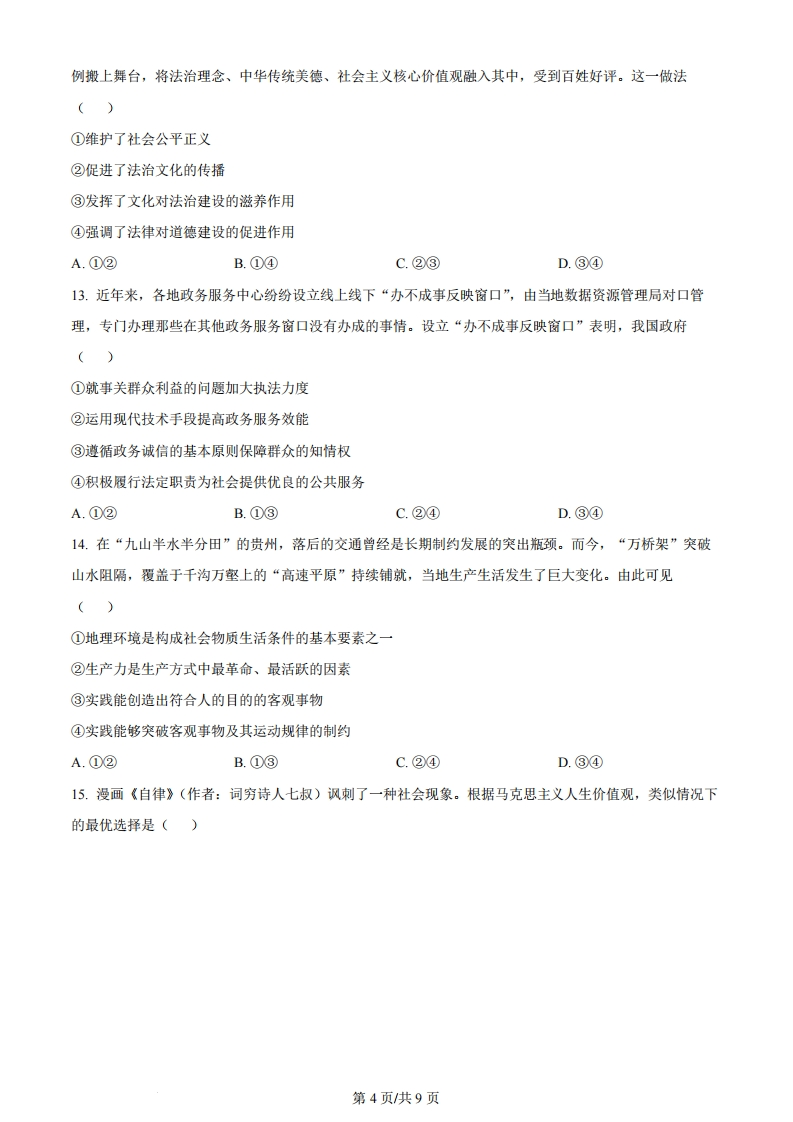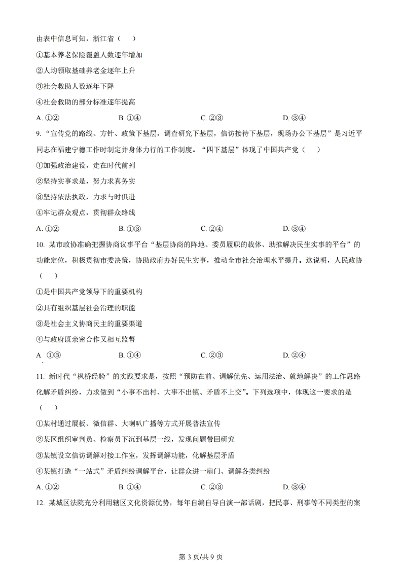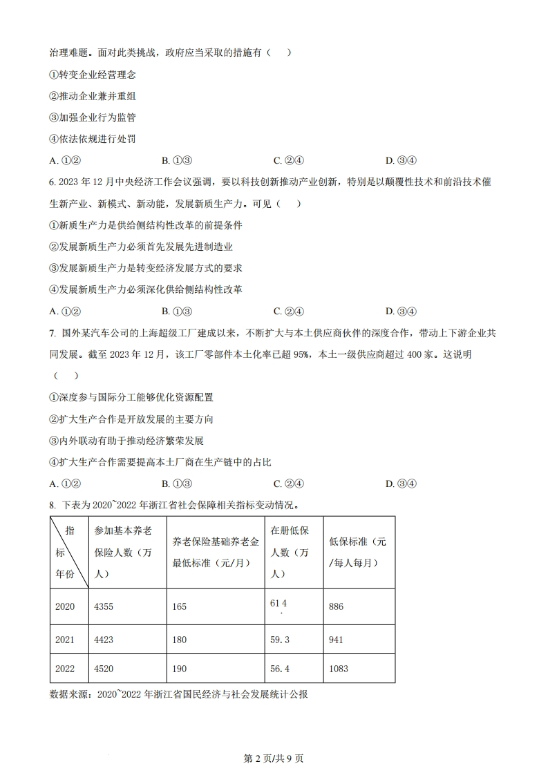 2024年1月浙江省普通高校招生选考科目考试思想政治试题一、选择题。1.马克思、恩格斯发现了人类社会发展的一般规律,创立了唯物史观。唯物史观揭示了()①人民群众的历史主体作用②阶级斗争在阶级社会发展中的巨大作用③资本主义经济的运行规律④无产阶级与资产阶级利益的根本对立A.①②B.①④C.②③D.③④2.在中国人民政治协商会议第一届全体会议上,毛泽东豪迈地宣告:“我们有一个共同的感觉,这就是我们的工作将写在人类的历史上,它将表明:占人类总数四分之一的中国人从此站立起来了。”在这里,“我们的工作”指的是()A.建立人民民主政权B.根本变革生产关系C.集中力量发展生产力D.完成近代以来中国人民的历史任务3.新时代,我们解决了许多长期想解决而没有解决的难题,办成了许多过去想办而没有办成的大事,从“现代化的迟到国”一跃成为“现代化的视觉中心”,靠的正是党的集中统一领导,靠的正是制度优势。由此可知()①中国是一个社会主义现代化国家②党的领导是中国建设社会主义现代化强国的关键③制度优势是一个国家的最大优势④中特社会主义制度是能够持续推动国家发展进步的制度A.①③B.①④C.②③D.②④4.由于各项政策措施叠加发力,全国个体工商户明显复苏。2023年前三季度,新增个体工商户1719.6万户,同比增长11.7%:登记在册个体工商户达1.22亿户,占经营主体总量的67.3%:超过7万户个体工商户升级为企业。这表明我国()①部分经营主体的所有制经济形式在发生变化②非公有制经营主体在经营主体总量中的占比上升③个体工商户受益于“两个毫不动摇”的政策④非公有资产在社会总资产中具备某种量的优势A.①②B.①③C.②④D.③④5.数字技术进步为经济发展增添了新动能,也带来诸如互联网平台垄断、隐私信息安全、限制数据共享等第1页共9页
