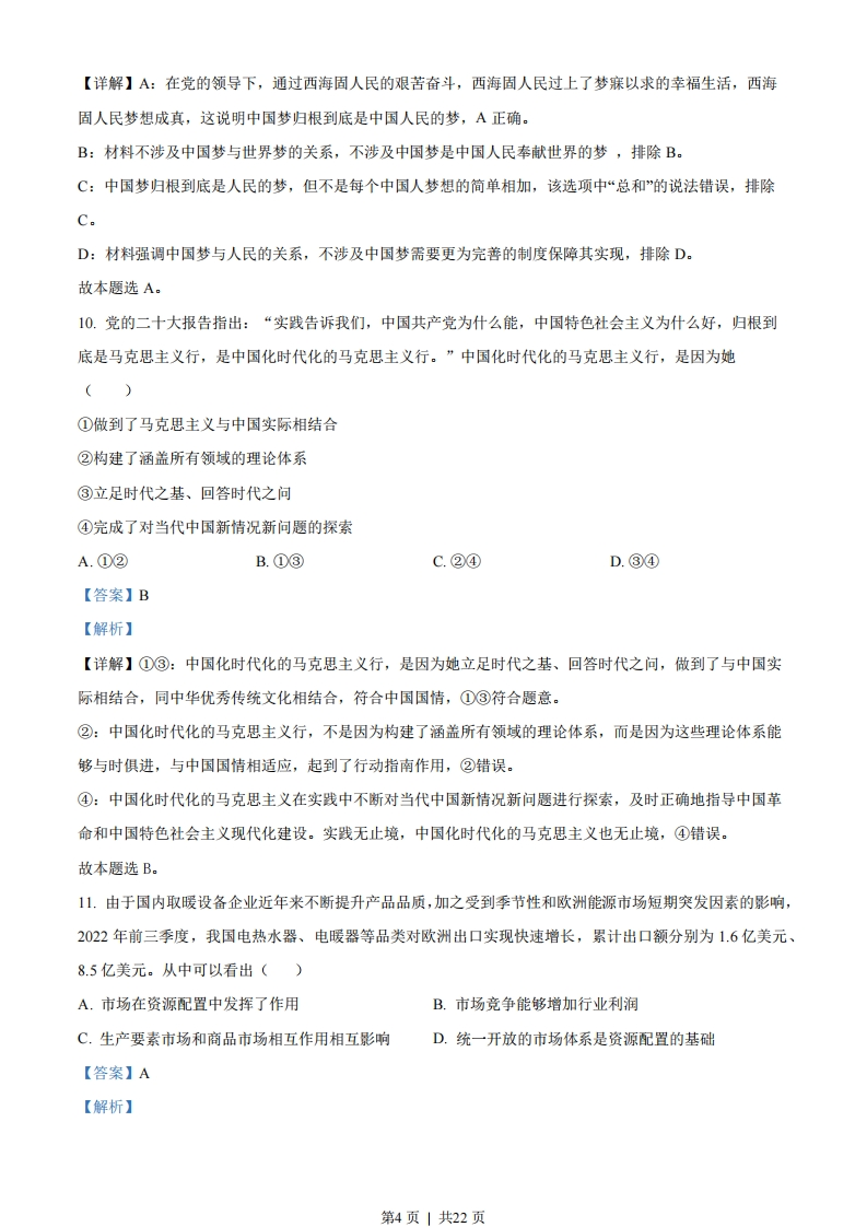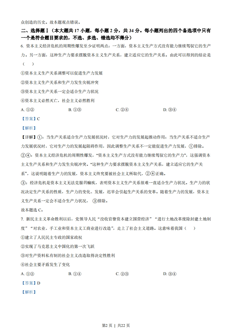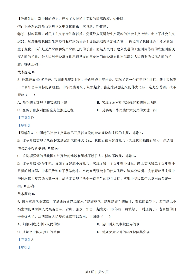 思想政治试题一、判断题(本大题共5小题,每小题1分,共5分。判断下列说法是否正确,正确的请将答题纸相应题号后的正确涂黑,错误的请将答题纸相应题号后的错误涂黑)1.新时代属于每一个人,每一个人都是新时代的见证者、开创者、建设者。(【答案】正确【解析】【详解】中国梦归根结底是人民的梦,新时代归根结底是人民的新时代。新时代属于每一个人,每一个人都是新时代的见证者、开创者、建设者,故题干说法正确。2.疫情期间我国经济增速放缓,主要归因于市场调节的局限性。(【答案】错误【解析】【详解】新冠期间我国经济增速缓慢的原因主要是受疫情的影响,导致了经济活动活力降低,无论是从供给侧还是需求侧,市场主体的活力与信心都受到了打击。因此,不是市场本身的机制因素,不是市场调节的局限性,故观点错误。3.在我国,各民主党派接受中国共产党领导,同中国共产党通力合作。(【答案】正确【解析】【详解】在我国,中国共产党是执政党,各民主党派是参政党。各民主党派接受中国共产党领导,同中国共产党通力合作,共同致力于社会主义事业。故本题说法正确。4.法治政府是公开公正的政府,公开公正是指法定职责必须为、法无授权不可为。()【答案】错误【解析】【详解】法治政府是公开公正的政府,公开公正是指全面推进政务公开,让权力在阳光下运行。通过公开公正执法,能够增强政府公信力和执行力,有效保障人民群众的知情权、参与权、表达权和监督权。法定职责必须为、法无授权不可为强调权责法定的政府。故本题说法错误。5.无数普通人坚守和奋斗的故事佐证了社会历史是由普通个人的实践活动构成的。()【答案】错误【解析】【详解】依据教材,人民群众是社会历史的主体。社会历史是由人的实践活动构成的,每个人都是历史活动的参与者,但人们在历史发展中所起作用的性质和大小是不同的。唯物史观从社会存在决定社会意识、生产方式决定社会发展的基本观点出发,强调社会发展的历史首先是物质生活资料生产的历史,是人民群第1页」共22页