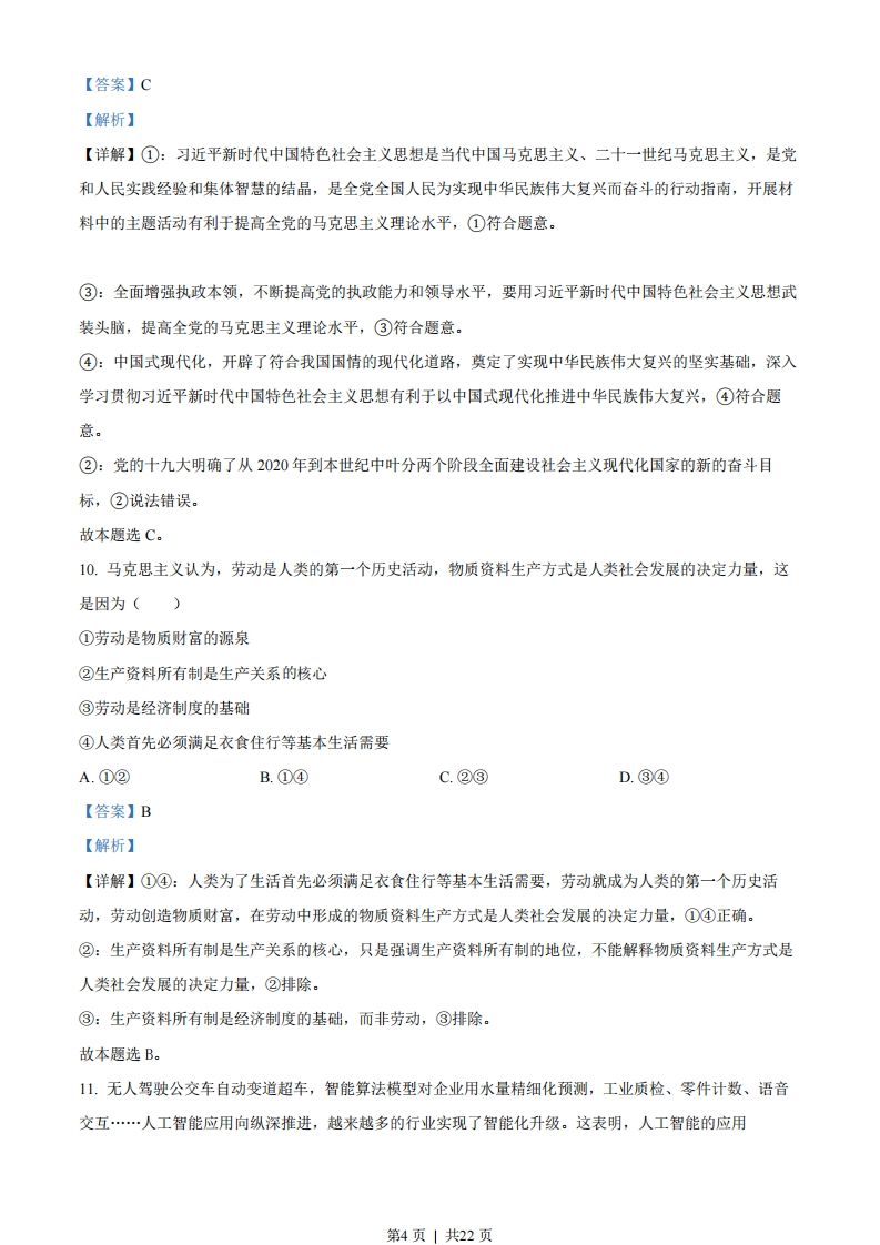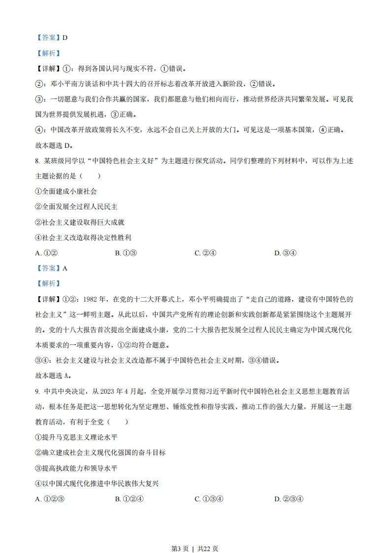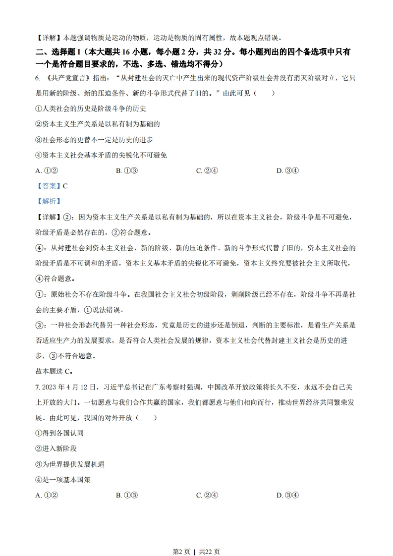 2023年6月浙江省普通高校招生选考科目考试思想政治学科2023.06本试题卷满分100分。考生注意:1,答题前,请务必将自已的姓名、准考证号用黑色字迹的签字笔或钢笔分别填写在试题卷和答题纸规定的位置上。2.答题时,请按照答题纸上“注意事项”的要求,在答题纸相应的位置上规范作答,在本试题卷上作答一律无效。一、判断题(本大题共5小题,每小题1分,共5分。判断下列说法是否正确,正确的请将答题卡相应题号后的正确涂黑,错误的请将答题卡相应题号后的错误涂黑)1.中国梦是中国人民追求幸福的梦,也同世界人民的梦想息息相通。()【答案】正确【解析】【详解】中国梦是奉献世界的梦。中国梦不仅造福中国人民,而且造福世界各国人民,是中国人民和世界各国人民共同的福祉。中国梦是中国人民追求幸福的梦,也同世界人民的梦想息息相通。该说法正确。2.2023年,我国计划比上年增加地方政府专项债券1500亿元,实施紧缩性财政政策。()【答案】错误【解析】【详解】增加地方政府专项债券,刺激社会总需求,拉动经济增长,属于扩张性财政政策(积极财政政策),故原观点错误。3.在我国,不同时期的优秀共产党员在本质上都体现了党的先进性。()【答案】正确【解析】【详解】不同时期的优秀共产党员在本质上都体现了党的先进性,都有坚定的马克思主义信仰,都坚持以人民为中心,故本题观点正确。4.全国人人代表和政协委员有权审议政府工作报告并提出意见。()【答案】错误【解析】【详解】全国人人代表有权审议政府工作报告并提出意见,但政协委员没有审议权,故本题观点错误。5.“江河之水,今犹古也,而非今水即古水”,强调了运动是物质的运动。()【答案】错误【解析】第1页」共22页