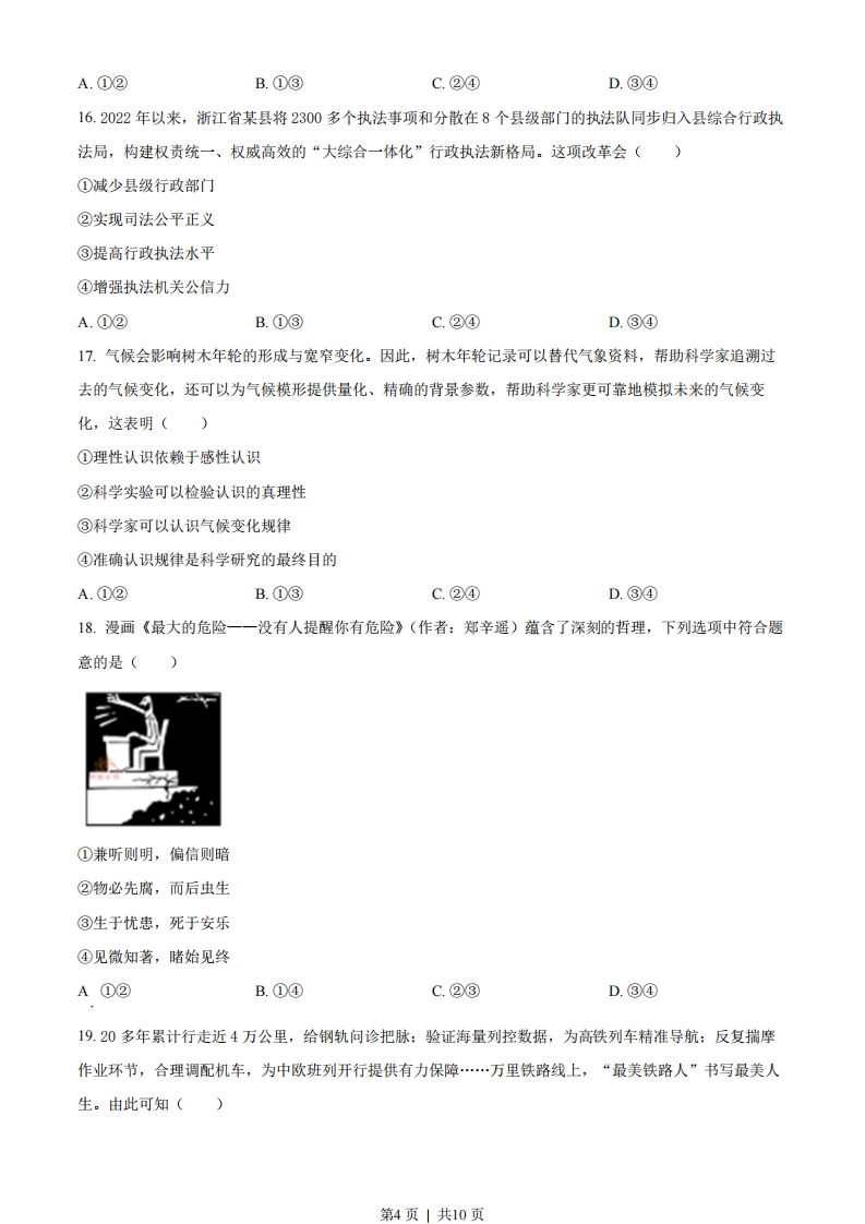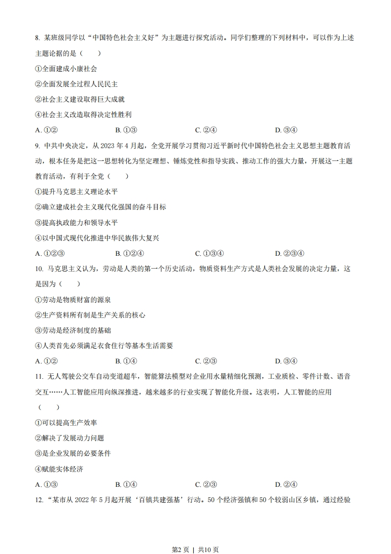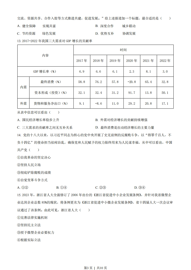 2023年6月浙江省普通高校招生选考科目考试思想政治学科2023.06本试题卷满分100分。考生注意:1,答题前,请务必将自已的姓名、准考证号用黑色字迹的签字笔或钢笔分别填写在试题卷和答题纸规定的位置上。2.答题时,请按照答题纸上“注意事项”的要求,在答题纸相应的位置上规范作答,在本试题卷上作答一律无效。一、判断题(本大题共5小题,每小题1分,共5分。判断下列说法是否正确,正确的请将答题卡相应题号后的正确涂黑,错误的请将答题卡相应题号后的错误涂黑)1.中国梦是中国人民追求幸福的梦,也同世界人民的梦想息息相通。()2.2023年,我国计划比上年增加地方政府专项债券1500亿元,实施紧缩性财政政策。(3.在我国,不同时期的优秀共产党员在本质上都体现了党的先进性。()4.全国人人代表和政协委员有权审议政府工作报告并提出意见。()5.“江河之水,今犹古也,而非今水即古水”,强调了运动是物质的运动。(二、选择题1(本大题共16小题,每小题2分,共32分。每小题列出的四个备选项中只有一个是符合题目要求的,不选、多选、错选均不得分)6.《共产党宣言》指出:“从封建社会的灭亡中产生出来的现代资产阶级社会并没有消灭阶级对立,它只是用新的阶级、新的压迫条件、新的斗争形式代替了旧的。”由此可见()①人类社会的历史是阶级斗争的历史②资本主义生产关系是以私有制为基础的③社会形态的更替不一定是历史的进步④资本主义社会基本矛盾的尖锐化不可避免A.①②B.①③C.②④D.③④7.2023年4月12日,习近平总书记在广东考察时强调,中国改革开放政策将长久不变,永远不会自己关上开放的大门。一切愿意与我们合作共赢的国家,我们都愿意与他们相向而行,推动世界经济共同繁荣发展。由此可见,我国的对外开放()①得到各国认同②进入新阶段③为世界提供发展机遇④是一项基本国策A.①②B.①③C.②④D.③④第1页」共10页