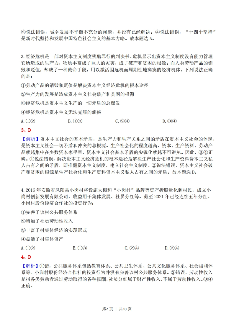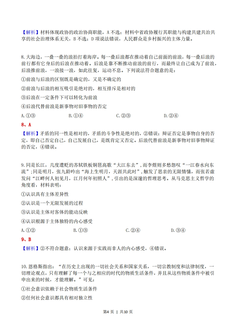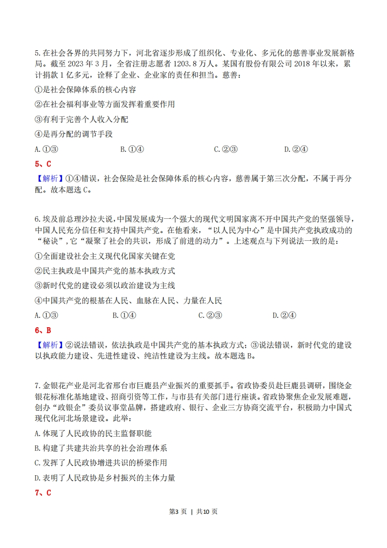 2023年河北省普通高中学业水平选择性考试思想政治一、选择题:本大题共16小题,每小题3分,共48分。在每小题给出的四个选项中,只有一项是符合题目要求的。1.《自信之歌》写到:“帆船能到达彼岸,是把好了正确的方向:水珠能滴穿石头,是水滴不停地冲撞。亿万人民同心同德,让我们有能力乘风破浪。生生不息的民族精神,让我们有毅力拥抱理想。…自信就要脚踏实地,永远走在复兴的路上。”与上述歌词大意贴切的是:①方向决定道路,道路决定命运②保持政治定力,坚持实干兴邦③青年兴则国家兴,青年强则国家强④时代是思想之母,实践是理论之源A.①②B.①③C.②④D.③④1、A【解析】①“帆船能到达彼岸,是把好了正确的方向”体现方向决定道路,道路决定命运,符合题意:②“水珠能滴穿石头,是水滴不停地冲撞、亿万人民同心同德、生生不息的民族精神、自信就要脚踏实地…”体现了保持政治定力,坚持实干兴邦,符合题意:③④说法正确,但与题意无关:故本题选A。2.马克思说:“把农业和工业结合起来,促使城乡对立逐步消灭。”习近平总书记科学研判我国发展新的历史方位和现阶段城乡发展实际,提出“重塑城乡关系,走城乡融合发展之路”“推动形成工农互促、城乡互补、协调发展、共同繁荣的新型工农城乡关系”的理念。这一理念:①推动了马克思主义城乡关系思想中国化时代化②解决了城乡发展不平衡不充分的问题③基于实践准确把握了我国城乡发展规律④是新时代坚持和发展中国特色社会主义的基本方略A.①③B.①④C.②③D.②④2、A【解析】①正确:习近平总书记科学研判我国发展新的历史方位和现阶段城乡发展实际,是基于实践准确把握了我国城乡发展规律,由此提出“推动形成工农互促、城乡互补、协调发展、共同繁荣的新型工农城乡关系”的理念,③正确:第1页|共10页