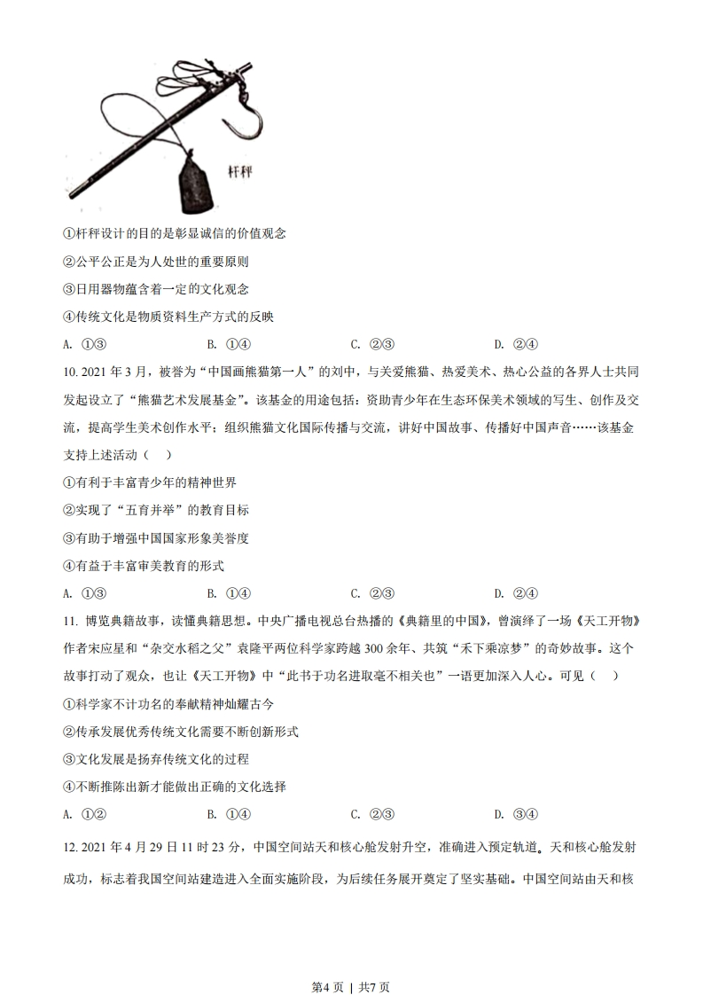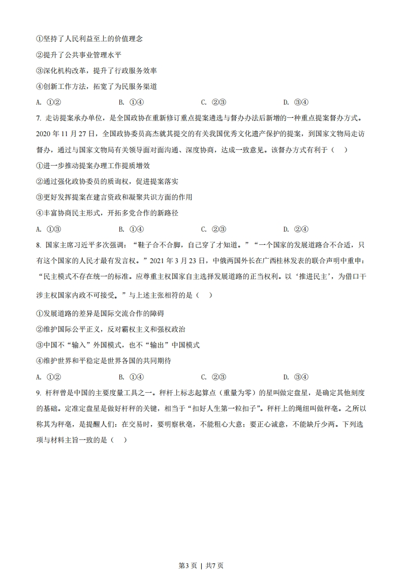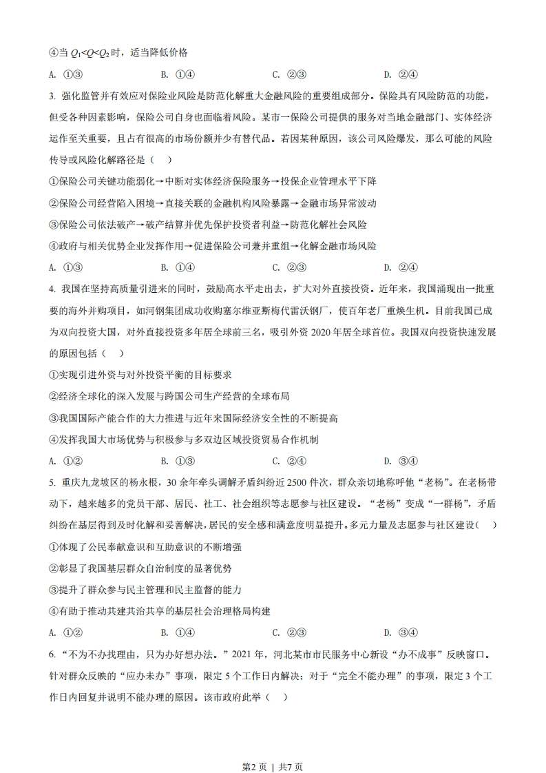 机密★启用前2021年河北省普通高中学业水平选择性考试思想政治注意事项:1.答卷前,考生务必将自已的姓名、考生号、考场号、座位号填写在答题卡上。2.回答选择题时,选出每小题答案后,用铅笔把答题卡上对应题目的答案标号涂黑,如需改动,用橡皮擦干净后,再选涂其他答案标号。回答非选择题时,将答案写在答题卡上。写在本试卷上无效。3考试结束后,将本试卷和答题卡一并交回。一、单项选择题:本题共15小题,每小题3分,共45分。在每小题给出的四个选项中,只有一项是符合题目要求的。1.哈密位于新疆东部,地跨天山,东挽内地,数条铁路和高速公路交会于此,多条航线联结北京、上海等城市和新疆腹地。近年来,为将区位优势转化为经济优势,从“经济通道”迈向“通道经济”,哈密正在加快建设陆港型物流枢纽。哈密发展现代物流业有利于()①制造业通过缩短流通时间提高单位商品的价值量,促进产业升级②发挥流通对经济发展的决定性作用,畅通国内大循环③在更大范围把生产和消费联系起来,推动分工深化④吸引生产要素和市场主体的集聚,扩大经济规模A.①②B.①③C.②④D.③④2.某企业产品的销售收入(R)与销量(Q)的关系如下图所示。不考虑其他因素,该企业产品的销量与价格呈反方向变动,如果企业要增加销售收入,应采取的策略是()R0Q1Q2Q①当0