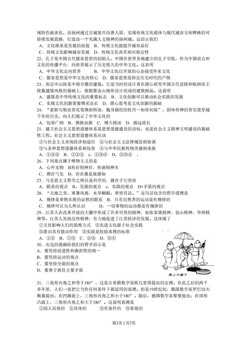 2008江苏政治高考试题及答案一、单项选择题:本大题共33小题,每小题2分。共计66分。在每题给出的四个选项中,只有一个选项是最符合题意的。1.中国共产党第十七次全国代表大会审议通过的《中国共产党章程(修正案)》,首次将这一重大战略思想写入党章。A.“三个代表”重要思想B.科学发展观C.中国特色社会主义理论体系D.社会主义核心价值体系2.2007年0月24日.我国第一颗月球探测卫星“”发射升空。A.奔月一号B.神舟七号C.嫦娥一号D.月亮女神3.2007年12月26日,国务院新闻办公室发表了《》自皮书,这是中国首次以国家名义发布能源文件。A.中国的能源发展战略B.中国的能源状况与政策C.推进能源节约与提高能源供给能力D.能源产业与环境协调发展412007年12月15,联合国气候变化大会通过了“路线图”。A.京都B.悉尼c.中东D.巴厘岛5.江苏对全省义务教育阶段学生在2007年实行的基础上,从2008年春季起,又进一步实行·这标志着江苏省全面实施免费义务教育。A.免收学杂费免费提供教科书B.免收学费免费提供教科=「:C.免收杂费免费提供教科书D.免收学费免收杂费2008年3月15日,十一届全国人大一次会议审议通过了国务院机构改革方案。请回答第6一8题,6.这次国务院机构改革的主要任务之一是,围绕转变政府职能和理顺部门职责关系,探索实行职能有机统一的体制。A.大部门B.小部门c.平行D.垂直7.政府机构改革是政治体制改革的重要内容,是完善社会主义市场经济体制的必然要求。这说明A.生产关系一定要适合生产力状况B.上层建筑一定要适合经济基础状况C.生产力一定要适合生产关系状况D.经济基础一定要适合上层建筑状况8.国务院机构改革方案的审议通过.表明全国人大在行使A.任免权B.监督权C.决定权D.立法权9.2007年7月,国务院启动城镇居民基本医疗保险试点,并将在3年内全面推开。这表明政府在履行A.保障人民民主和维护国家长治久安的职能B.组织社会主义经济建设的职能C.组织社会主义文化建设的职能D.提供社会公共服务的职能10.在第十一届全国人大代表中,每个少数民族都有本民族的代表。西藏珞巴族人口不足3000人·也拥有1名全国人大代表。这体现出我国处理民族关系的A.民族团结原则B.民族互助原则©.民族平等原则D.各民族共同繁荣原则1山.邓小平曾指出:“考虑国与国之间的关系主要应该从自身的战略利益出发,同时也尊重双方的利益。”这段话表明决定国际关系最重要的因素是A.政治利益B.国家力量C.国家安全D.国家利益第1页|共7页