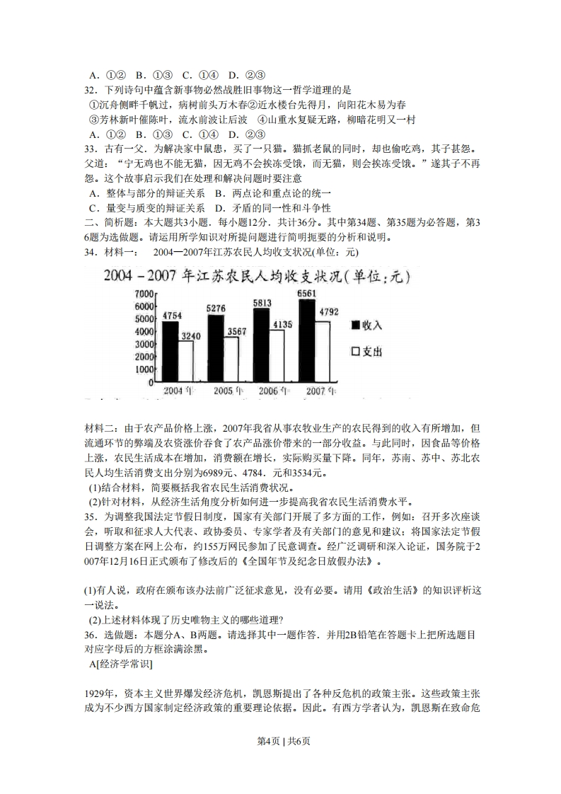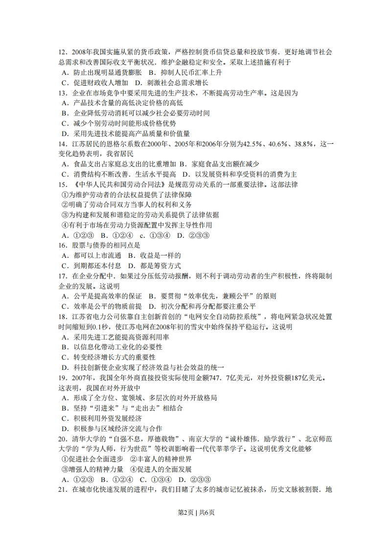 2008江苏政治高考试题及答案一、单项选择题:本大题共33小题,每小题2分。共计66分。在每题给出的四个选项中,只有一个选项是最符合题意的。1.中国共产党第十七次全国代表大会审议通过的《中国共产党章程(修正案)》,首次将这一重大战略思想写入党章。A.“三个代表”重要思想B.科学发展观C.中国特色社会主义理论体系D.社会主义核心价值体系2.2007年0月24日.我国第一颗月球探测卫星“”发射升空。A.奔月一号B.神舟七号C.嫦娥一号D.月亮女神3.2007年12月26日,国务院新闻办公室发表了《》自皮书,这是中国首次以国家名义发布能源文件。A.中国的能源发展战略B.中国的能源状况与政策C.推进能源节约与提高能源供给能力D.能源产业与环境协调发展412007年12月15,联合国气候变化大会通过了“路线图”。A.京都B.悉尼c.中东D.巴厘岛5.江苏对全省义务教育阶段学生在2007年实行的基础上,从2008年春季起,又进一步实行·这标志着江苏省全面实施免费义务教育。A.免收学杂费免费提供教科书B.免收学费免费提供教科=「:C.免收杂费免费提供教科书D.免收学费免收杂费2008年3月15日,十一届全国人大一次会议审议通过了国务院机构改革方案。请回答第6一8题,6.这次国务院机构改革的主要任务之一是,围绕转变政府职能和理顺部门职责关系,探索实行职能有机统一的体制。A.大部门B.小部门c.平行D.垂直7.政府机构改革是政治体制改革的重要内容,是完善社会主义市场经济体制的必然要求。这说明A.生产关系一定要适合生产力状况B.上层建筑一定要适合经济基础状况C.生产力一定要适合生产关系状况D.经济基础一定要适合上层建筑状况8.国务院机构改革方案的审议通过.表明全国人大在行使A.任免权B.监督权C.决定权D.立法权9.2007年7月,国务院启动城镇居民基本医疗保险试点,并将在3年内全面推开。这表明政府在履行A.保障人民民主和维护国家长治久安的职能B.组织社会主义经济建设的职能C.组织社会主义文化建设的职能D.提供社会公共服务的职能10.在第十一届全国人大代表中,每个少数民族都有本民族的代表。西藏珞巴族人口不足3000人·也拥有1名全国人大代表。这体现出我国处理民族关系的A.民族团结原则B.民族互助原则©.民族平等原则D.各民族共同繁荣原则1山.邓小平曾指出:“考虑国与国之间的关系主要应该从自身的战略利益出发,同时也尊重双方的利益。”这段话表明决定国际关系最重要的因素是A.政治利益B.国家力量C.国家安全D.国家利益第1页|共6页