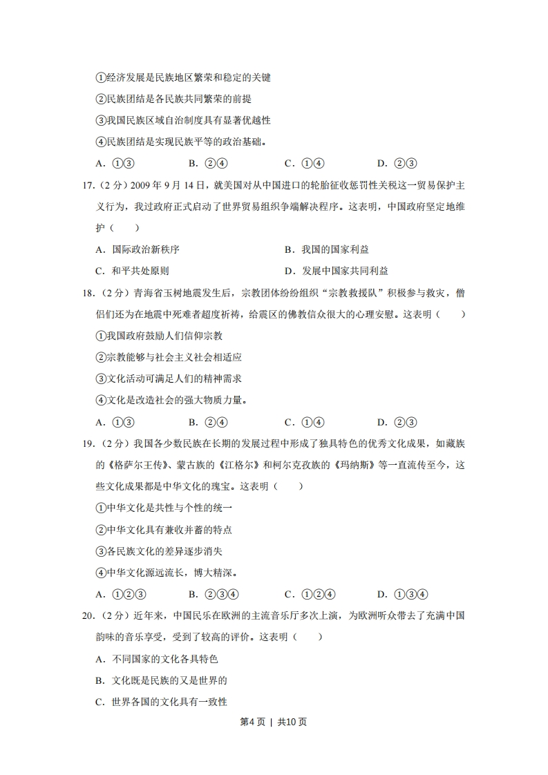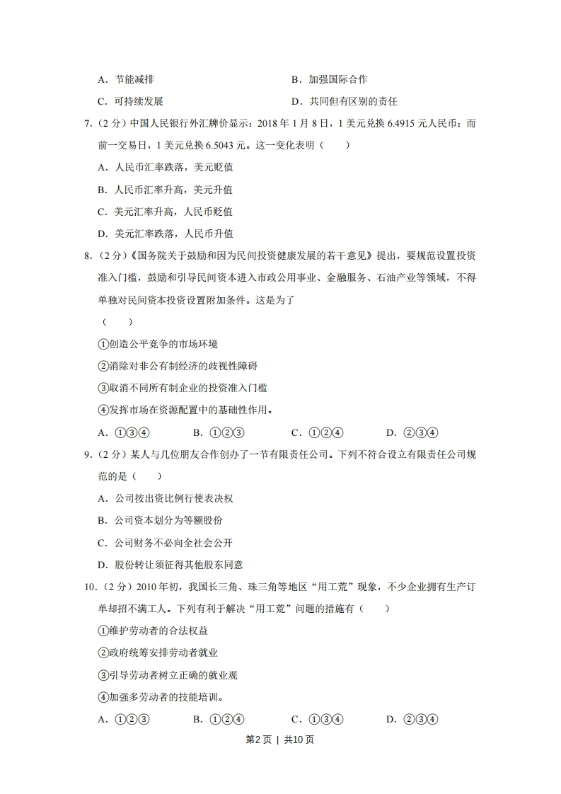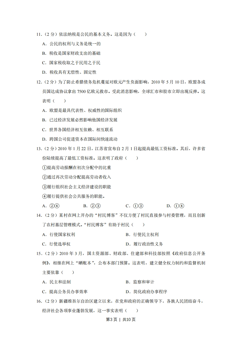 2010年江苏省高考政治试卷一、单项选释题:本大愿共32小题,每小题2分,共计66分.在每题给出的四个选项中,只有一个选项是最符合题意的1.(2分)2010年1月31日,《中共中央,国务院关于(),进一步夯实农业农村发展惹出的若干意见》颁布,这是2004年以来中央连续第七年制定的指导“三农”工作的“一号文件”。A.加大统筹城乡发展力度B.促进农民持续增收C.加快家业现代化步伐D.加强农村土地管理2.(2分)2009年10月1日,在首都各界庆祝中华人民共和国成立60周年大会上,国家主席胡锦涛发表重要讲话指出,新中国60年的发展进步充分证明()①只有社会主义才能救中国②人民生活总体上达至小康水平③新民主主义革命的伟大胜利来之不易④只有改革开放才能发展中国、发展社会主义、发展马克思主义。A.①②B.①④C.②③D.③④3.(2分)2009年11有,应中国国民党中央委员会的邀请,中共江苏省委书记梁保华率代表团访问台湾,并成功举办了“()”活动。A,苏台经贸文化论坛B.台湾江苏节C.两岸经贸合作论坛D.台湾江苏周4.(2分)2010年2月23日,卫生部,国家发改委等五部门联合发布《公立医院改革试点指导意见》,明确提出公立医院要以()为核心,逐步取消药品加成,增设药事服务费,该项费用纳入医保。A.盈利性B.公益性C.均衡性D.保障性5.(2分)2010年3月14日,第十一届全国人民代表大会第三次会议表决能过了关于修改()的决定,这标志着社会主义民主政治又向前迈出了历史性的一步。A.选举法B.行政法C.拆迁条例D.国家赔偿法6.(2分)2009年12月7日至19日,联合国气候变化大会在哥本哈要举行。会议达成不具有法律的约束力的《哥本哈根协定》,维护了《联合国气候变化框架公约》及其《京都议定书》确立的“()”原则。第1页1共10页