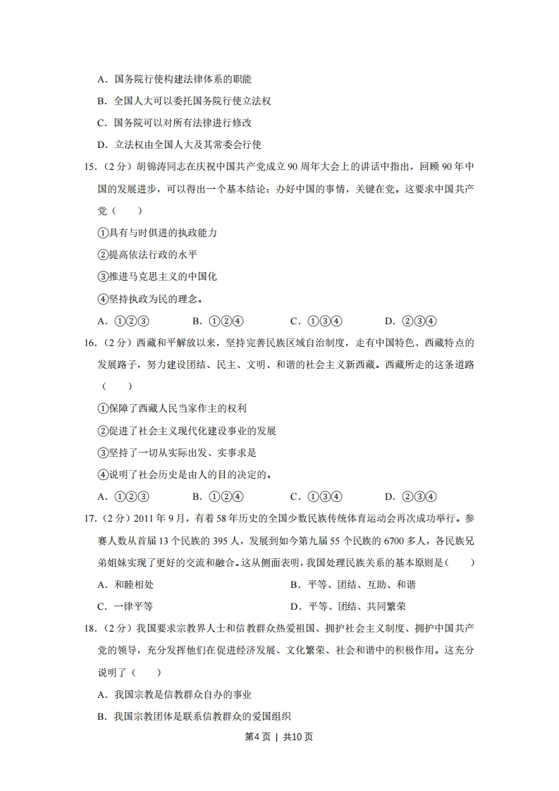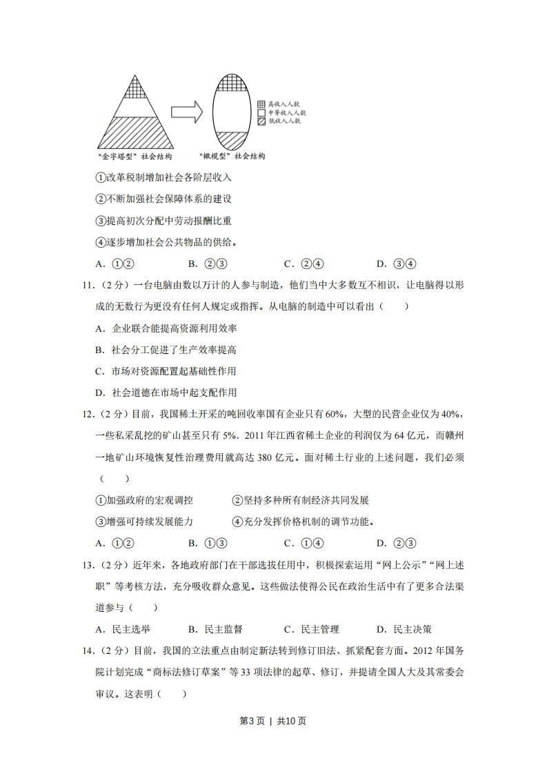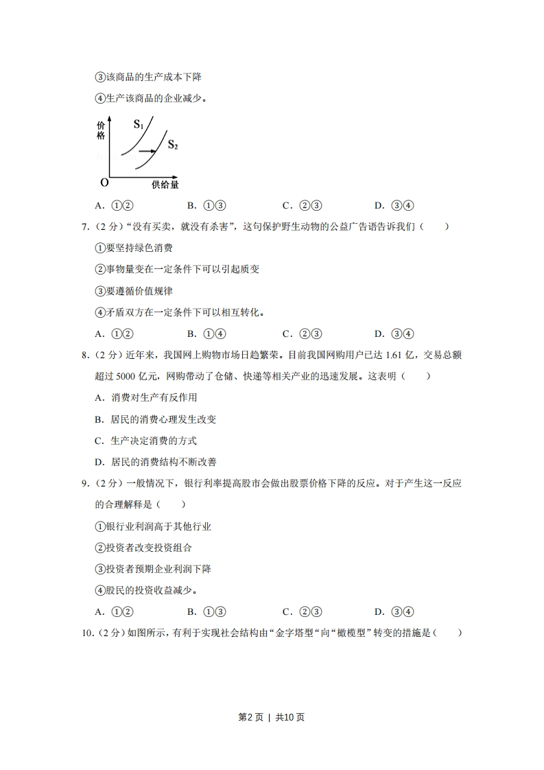 2012年江苏省高考政治试卷一、单项选释题:本大愿共33小题,每小题2分,共计66分.在每题给出的四个选项中,只有一个选项是最符合题意的,1.(2分)2011年10月,中国共产党十七届六中全会审议通过了《中共中央关于深化文化体制改革、推动社会主义文化大发展大繁荣若干重大问题的决定》,提出了推动社会主义文化大发展大繁荣的根本任务是()A,增强国家文化软实力B.满足人民群众精神文化需求C.提高全民族文化素质D.建设社会主义核心价值体系2.(2分)2012年3月,十一届全国人大五次会议在北京举行。会议指出了2012年我国国内生产总值增长的预期目标是()A.7.5%B.8%C.8.5%D.9%3.(2分)2011年7月,我国研制的深海载人潜水器成功潜至海面以下5057米,标志着我国己经进入载人深潜技术全球先进国家行列。该潜水器是()A.“雪龙”号B.“蛟龙”号C.“科学”号D.“海峡”号4.(2分)2011年11月,为使更多低收入人口享受到国家扶贫优惠政策,中央扶贫开发工作会议确定了新的国家扶贫标准。这一标准为农民人均纯收入(2010年不变价)()A.1274元B.2300元C.3500元D.4000元5.(2分)2011年12月,四国湄公河联合巡逻执法正式启动,共同维护和保障湄公河航运安全,促进湄公河流域经济社会发展和人员、船舶安全往来。这四个国家除中国外,还有()A.柬埔寨、老挝、泰国B.越南、缅甸、泰国C.柬埔寨、越南、老挝D.老挝、缅甸、泰国6.(2分)如图表示某商品供给量和价格的关系(横轴为供给量,纵轴为价格,S1为变动前曲线,S2为变动后曲线).在不考虑其它因素条件下,以下变量中会导致S向S2方向平行移动的是()①该商品劳动生产率提高②该商品的市场价格提高第1页1共10页