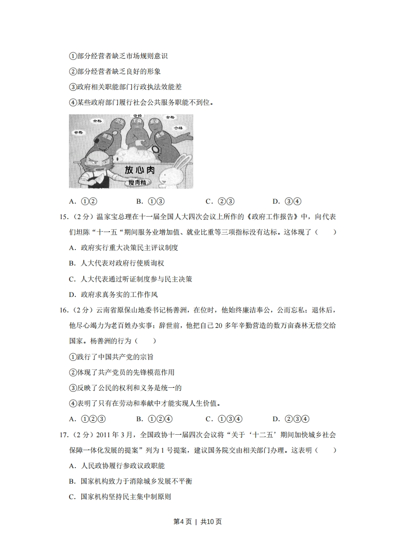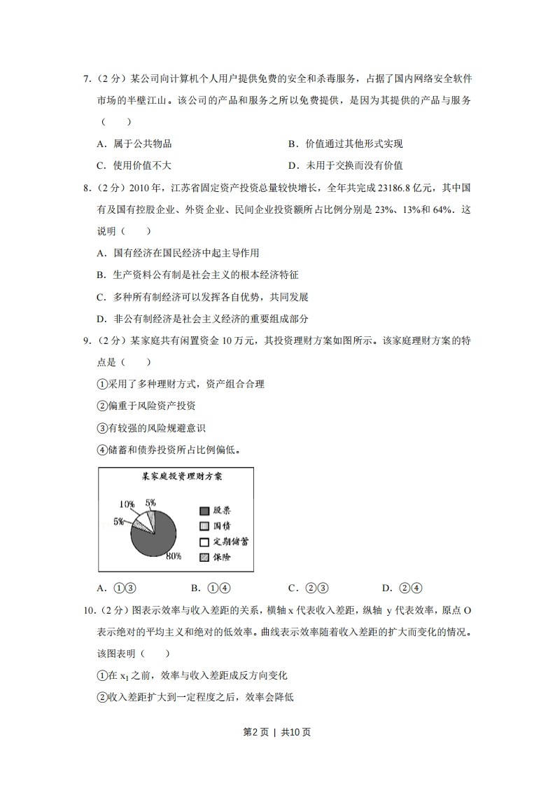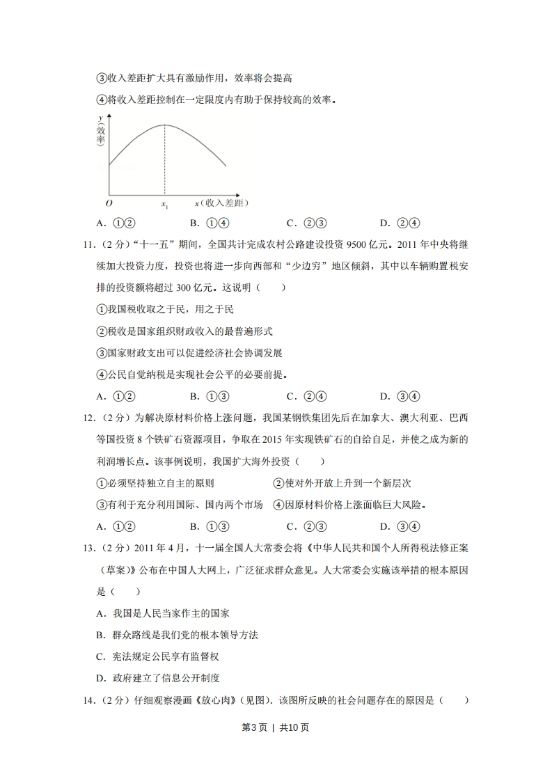 2011年江苏省高考政治试卷一、单项选择题:本大题共33题,每小题2分,共计66分.在每题给出的四个选项中,只有一个选项是最符合题意的,1.(2分)2011年3月14日,第十一届全国人民代表大会第四次会议批准了《中华人民共和国国民经济和社会发展第十二个五年规划纲要》.纲要指出,今后五年加快转变经济发展方式的根本出发点和落脚点是()A.经济结构战略性调整B.科技进步和创新C.建设资源节约型社会D.保障和改善民生2.(2分)2010年5月,胡锦涛在新疆工作座谈会上指出,到2015年新疆人均地区生产总值将达到全国平均水平,城乡居民收入和人均基本公共服务能力达到西部地区平均水平,到2020年基本消除()A.青壮年文肓B.绝对贫困C.城乡差距D.地区差距3.(2分)2010年6月18日,我国第三个国家级新区、内陆唯一国家级新区“两江新区“挂牌成立。该新区位于()A.重庆B.武汉C.成都D.南昌4.(2分)2010年11月16日,我国申报并被联合国教科文组织列入人类非物质文化遗产代表作名录的是《京剧》和()A.《中国书法》B.《中华武术》C.《中医针灸》D.《中国剪纸》5.(2分)2010年11月28日,欧盟成员国财政部长决定,和某国际组织一道向爱尔兰提供850亿欧元的资金支持,帮助其应对债务危机并遏制危机蔓延。该国际组织是()A,国际货币基金组织B.世界贸易组织C.亚太经济合作组织D.世界银行6.(2分)2011年3月初,联合国粮农组织发布的2月份全球食品价格指数创历史新高。影响此次世界粮食价格上涨的供给因素是()A.一些粮食主产国遭受自然灾害B.世界经济开始逐步复苏C.国际贸易保护主义抬头D.发达国家宽松的货币政策第1页1共10页