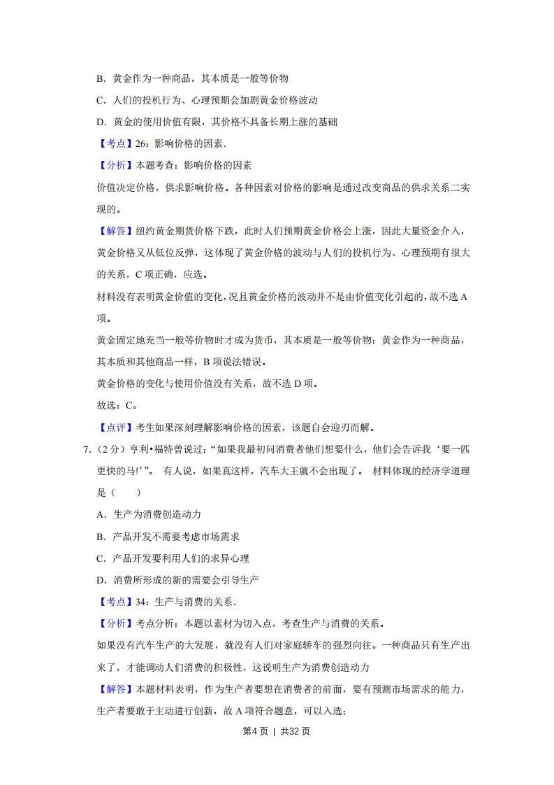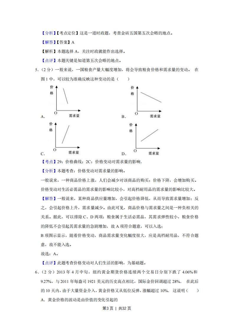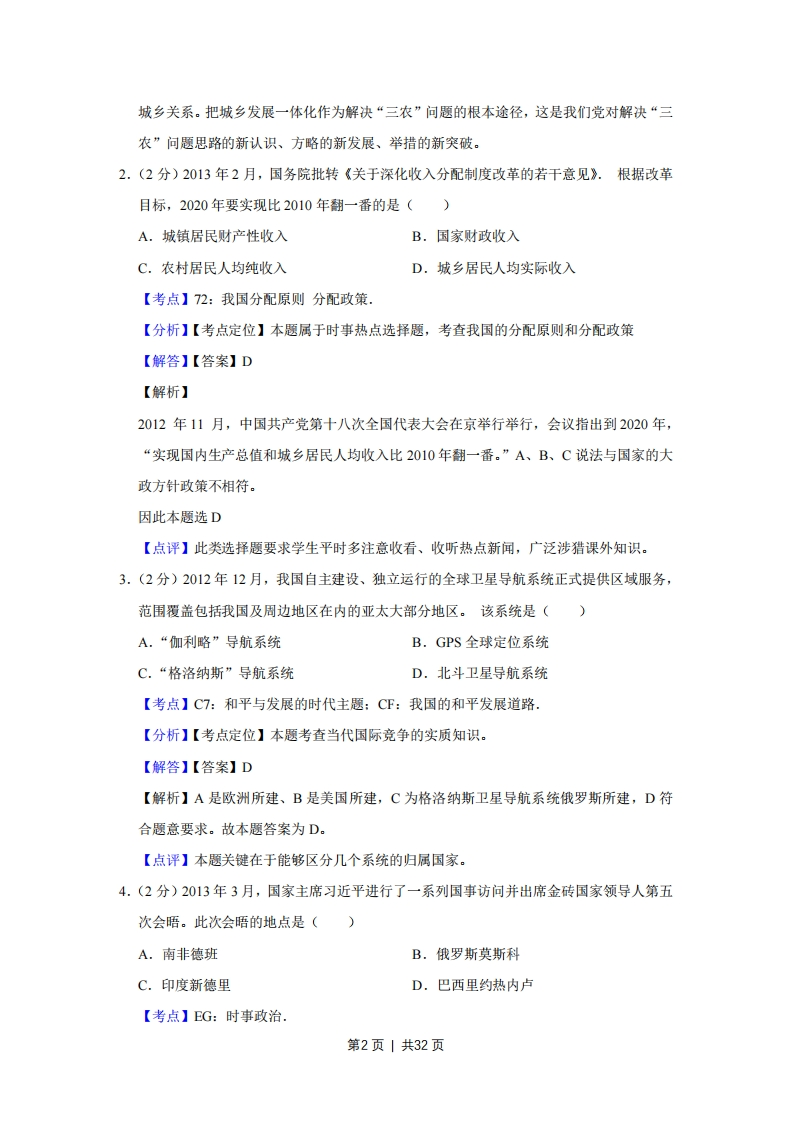 2013年江苏省高考政治试卷解析版◆考答案与试题解析一、单项选择题:本大题共31小愿,每小题2分,共计66分,在每题给出的四个选项中,只一个选项是最符合题意的。1.(2分)2012年11月,中国共产党第十八次全国代表大会在京举行。会议指出,解决“三农”问题的根本途径是()A.城乡发展一体化B.推动科技创新C.建设社会主义新农村D.优化产业结构【考点】8N:农业现代化和三农问题【分析】题目考查:“三农问题”:“三农”问题是指农村、农业、农民这三大问题。其独立地描述是指在广大乡村区域,以种(养)殖业为主,身份为农民的生存状态的改善、产业发展以及社会进步问题。学生在解题时需要有一定的时事政治的基础,了解中央的文件,同时把握题目中所指出的根本途径的问题。【解答】“三农”问题,一直是个热点问题,每年的中央一号文件,分别对解决“三农”问题提出了不同的要求。在中国共产党第十八次全国代表大会明确指出,解决“三农”问题的根本途径是城乡发展一体化,A正确:题目中说明的是“根本途径”,B、C、D是途径,但不是根本途径,排除:故选:A。【点评】难度简单,基础知识考察,需要学生度解决三农问题时的根本途径是城乡发展一体化有一定的了解。党的十八大报告明确提出,解决好农业农村农民问题是全党工作重中之重,城乡发展一体化是解决“三农”问题的根本途径。党的十八大报告还进一步明确指出了推动城乡发展一体化的基本方向和着力重点,这就是:加大统筹城乡发展力度,增强农村发展活力,逐步缩小城乡差距,促进城乡共同繁荣:坚持工业反哺农业、城市支持农村和多予少取放活方针,加大强农惠农富农策力度,让广大农民平等参与现代化进程、共同分享现代化成果:加快完善城乡发展一体化体制机制,着力在城乡规划、基础设施、公共服务等方面推进一体化,促进城乡要素平等交换和公共资源均衡配置,形成以工促农、以城带乡、工农互惠、城乡一体的新型工农、第1页1共32页